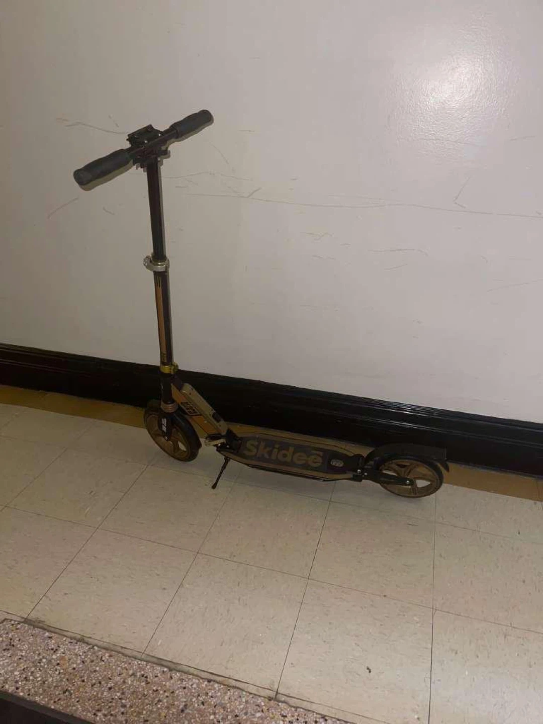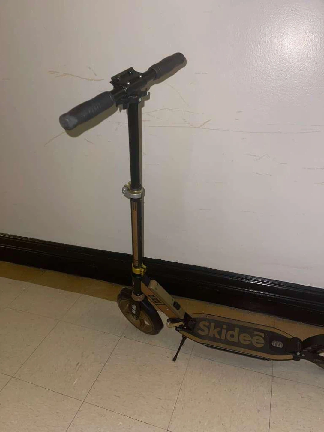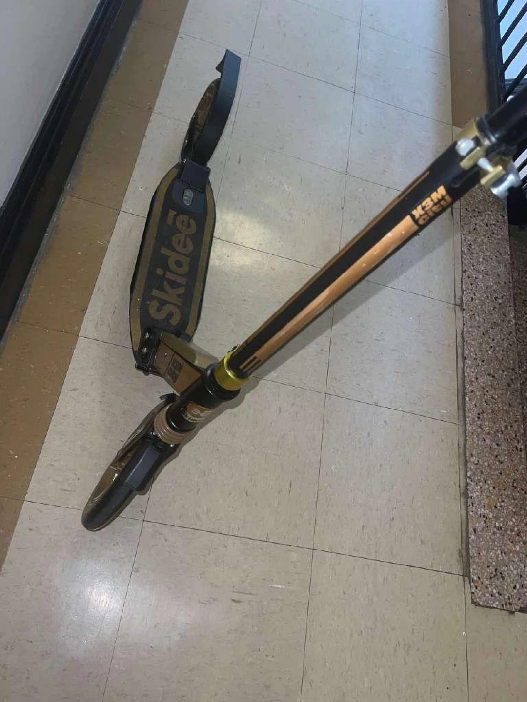 95Scooter, specifically the gold-colored version designed for kids, teens, and adults. It features 4 adjustment levels for the handlebar, which can extend up to 41 inches. It is designed for smooth riding with enhanced extra-large 8-inch PU casted wheels and upgraded anti-shock suspension on both wheels. The scooter is foldable, making it convenient for travel and storage. It has a weight capacity of 220 lbs, making it suitable for a wide range of users.
