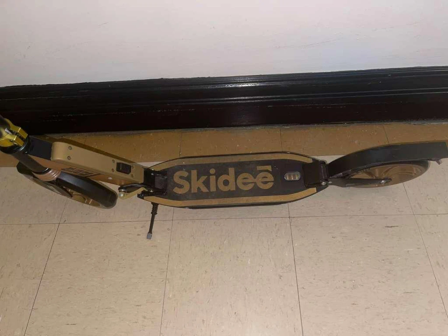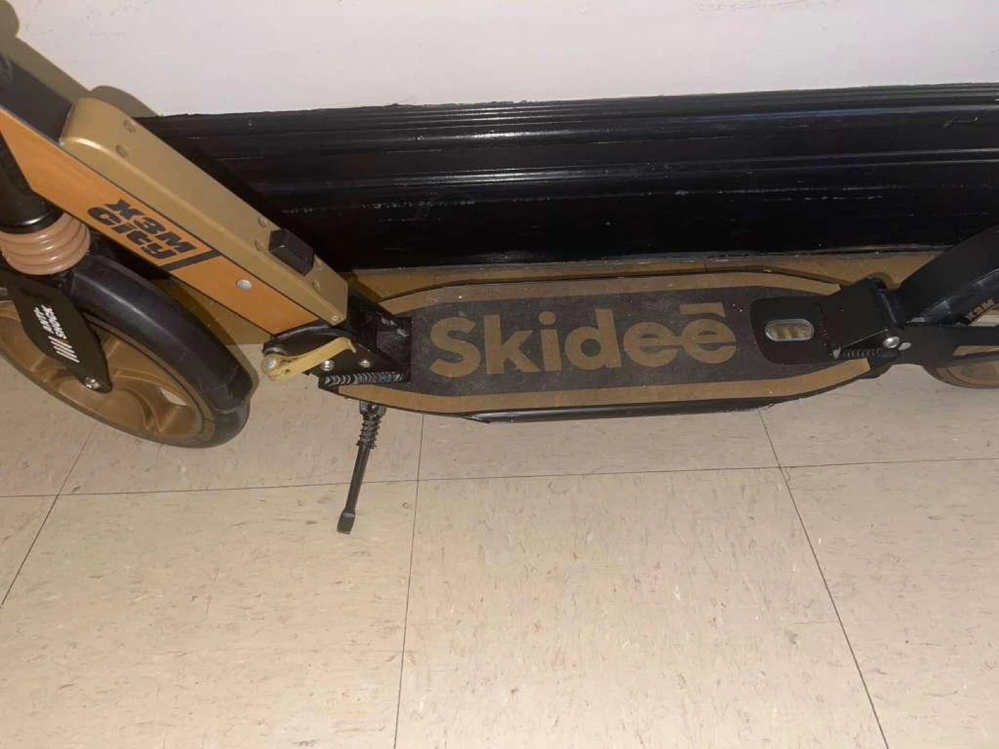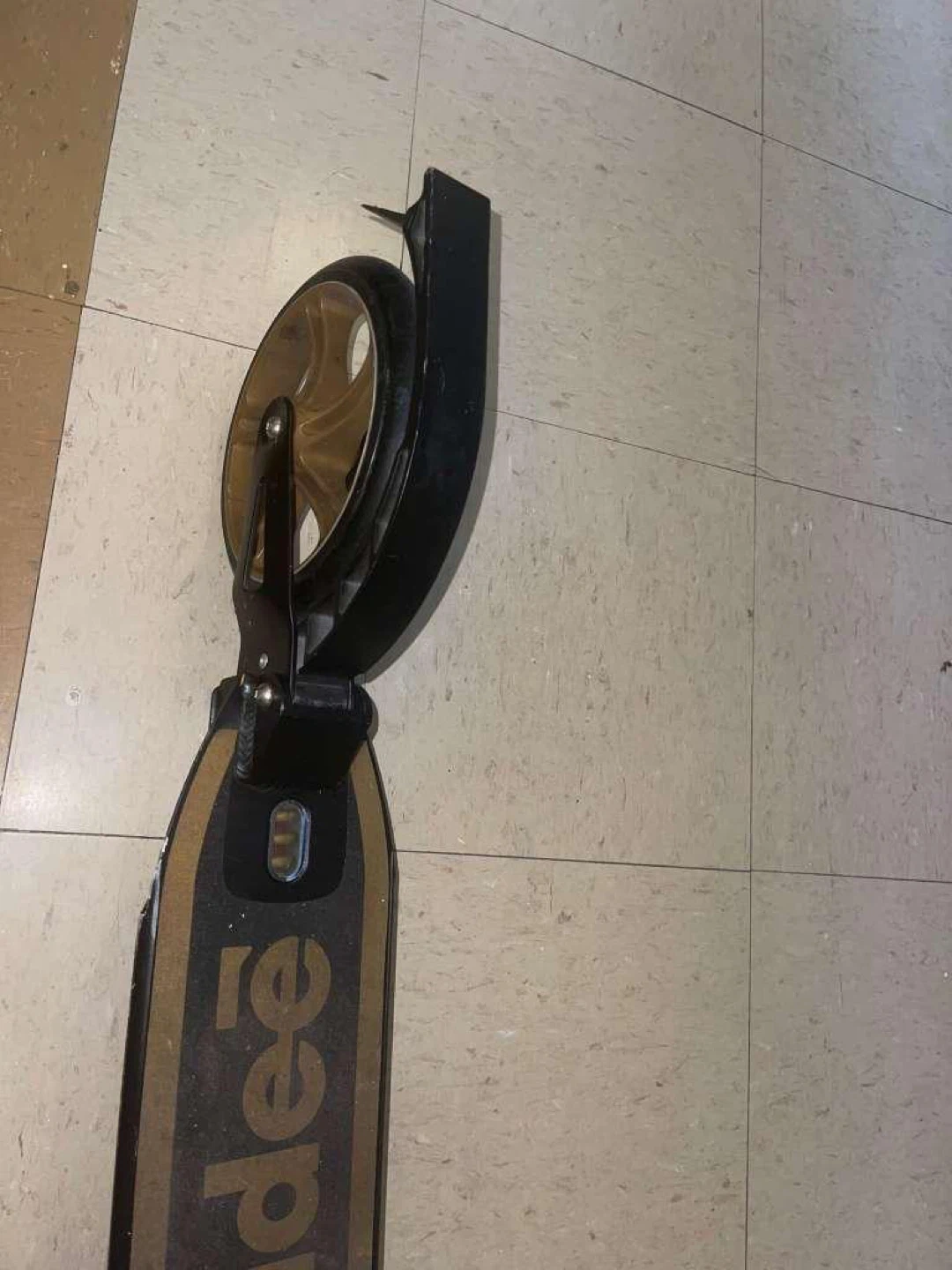 95Scooter, specifically the gold-colored version designed for kids, teens, and adults. It features 4 adjustment levels for the handlebar, which can extend up to 41 inches. It is designed for smooth riding with enhanced extra-large 8-inch PU casted wheels and upgraded anti-shock suspension on both wheels. The scooter is foldable, making it convenient for travel and storage. It has a weight capacity of 220 lbs, making it suitable for a wide range of users.