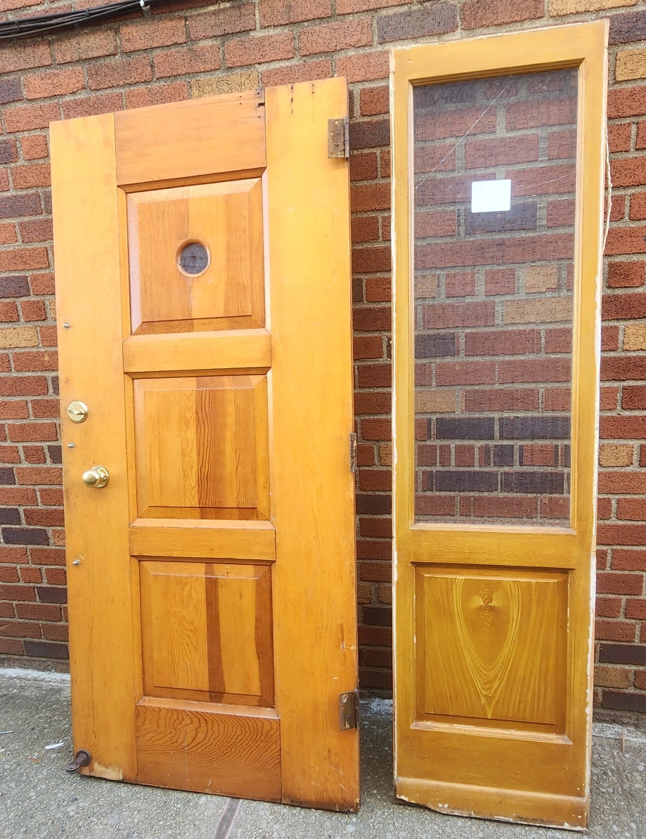 Selling a set of two vintage OAK wooden doors. They have a beautiful, classic design and could be a great addition to your home or project. One door has a unique star-shaped handle, and the other has a glass panel. Please note that they show signs of wear consistent with their age . Locks and some of the moldings/ frame also available at night additional cost.