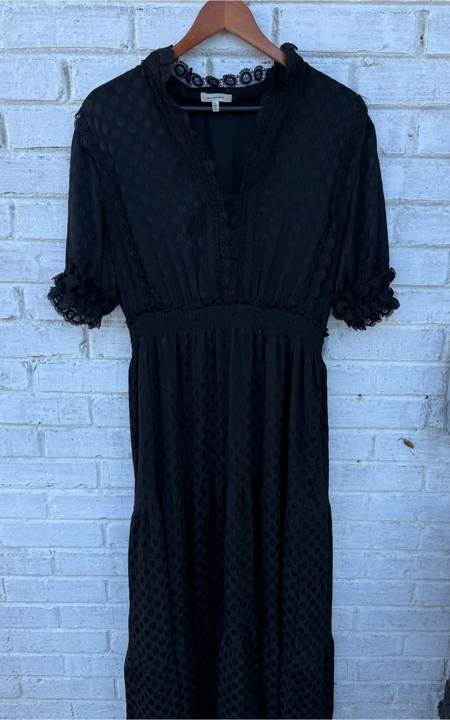 Selling a beautiful black dress from Max Studio in size XL. It features delicate lace detailing around the neckline and sleeves. Perfect for any occasion! This is a Max Studio black short sleeve tiered maxi dress with a polka dot pattern and lace details.
