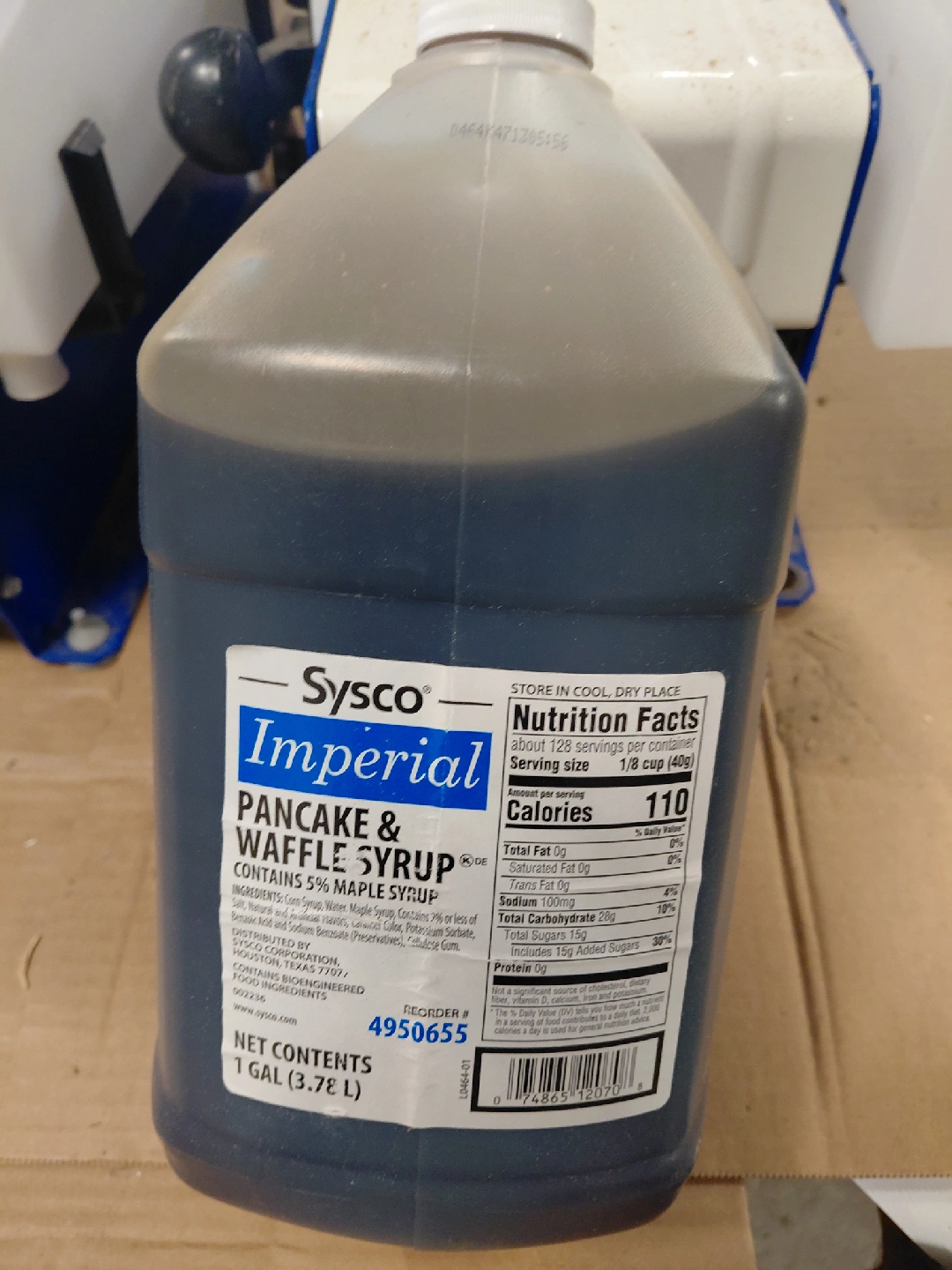 Selling a 1-gallon container of Sysco Imperial Pancake & Waffle Syrup. It contains 5% maple syrup. Great for stocking up for those weekend breakfasts!