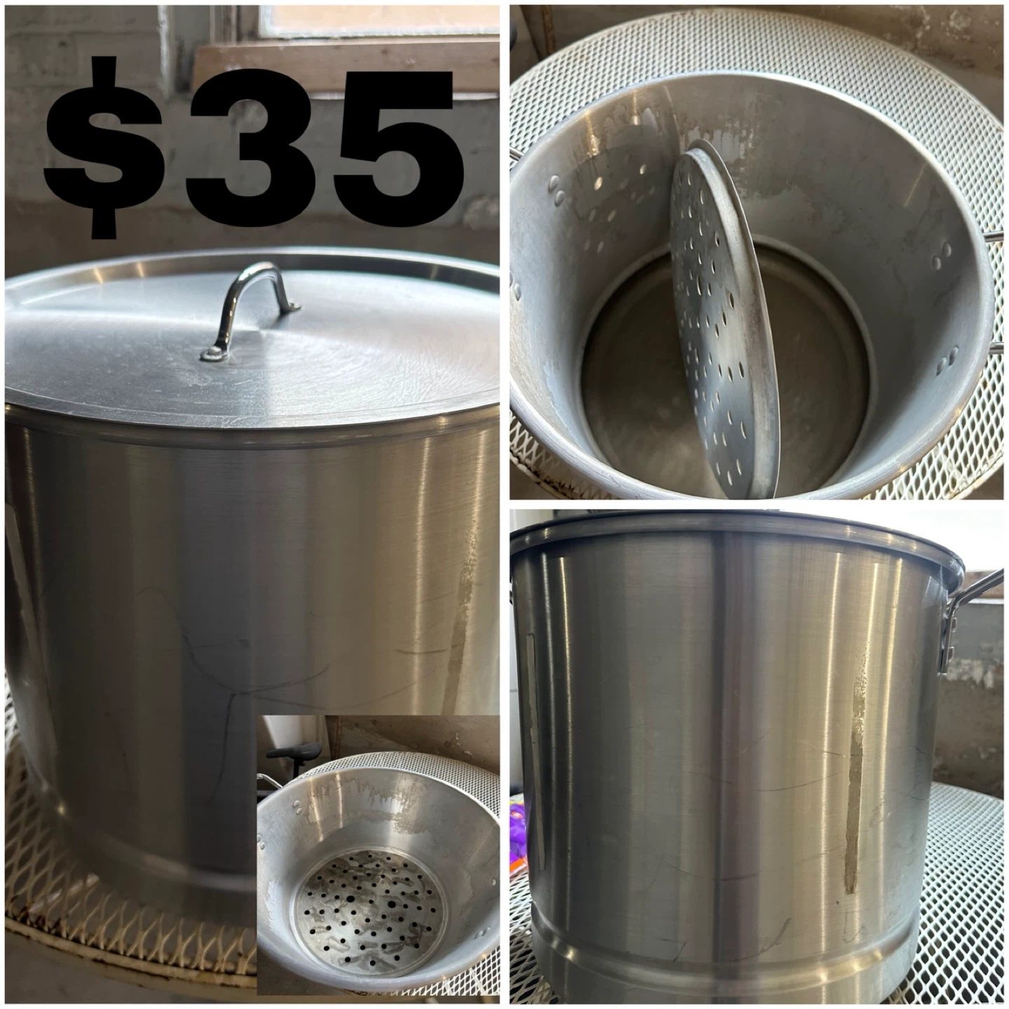 26Selling a used aluminum stock pot that comes with a steamer basket. It's in good condition and ready for your next seafood boil or steaming session!