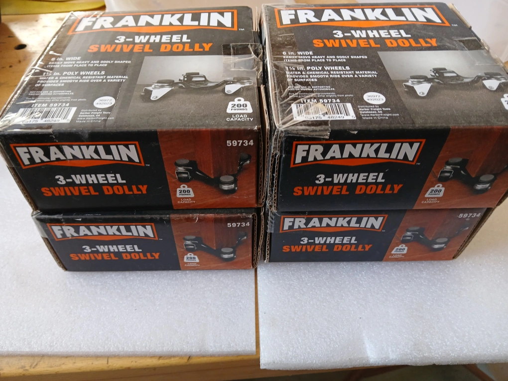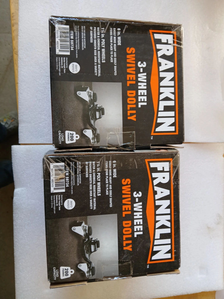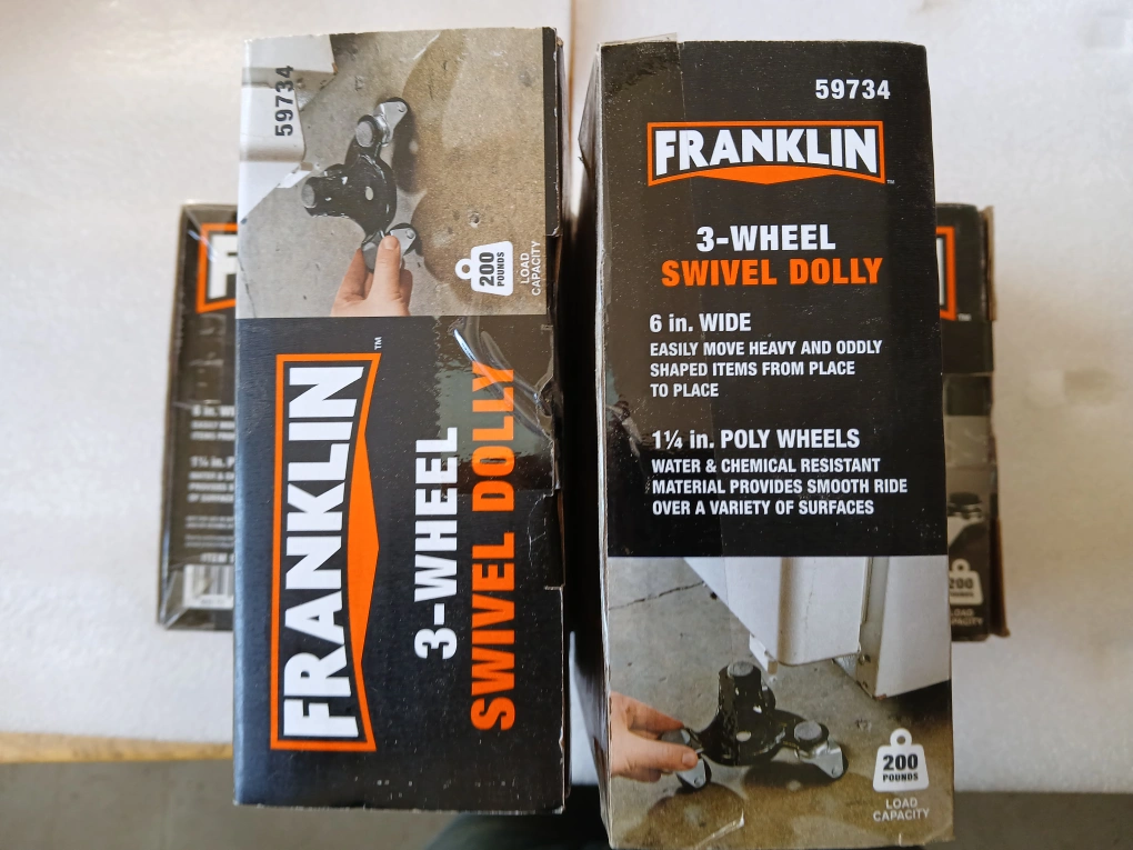 60Franklin 3-Wheel Swivel Dolly, each with a 200 lbs load capacity - 6 in wide - Easily move heavy and oddly shaped items from place to place - 1 1/4 in poly wheels - Water & chemical resistant material provides smooth ride over a variety of surfaces