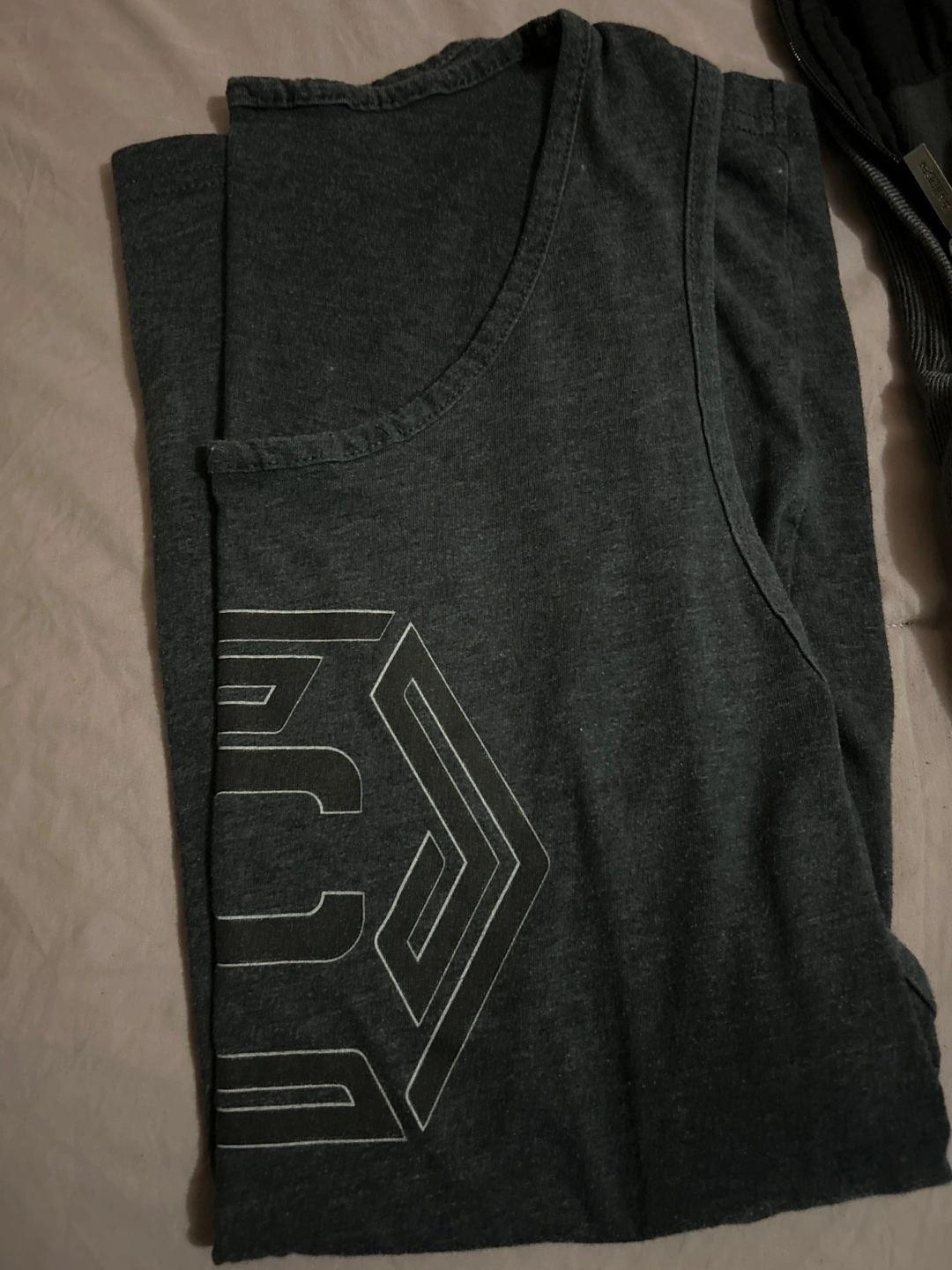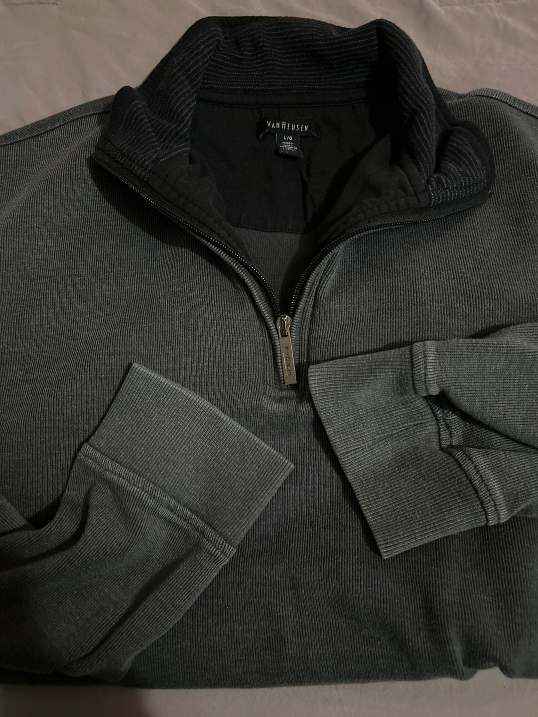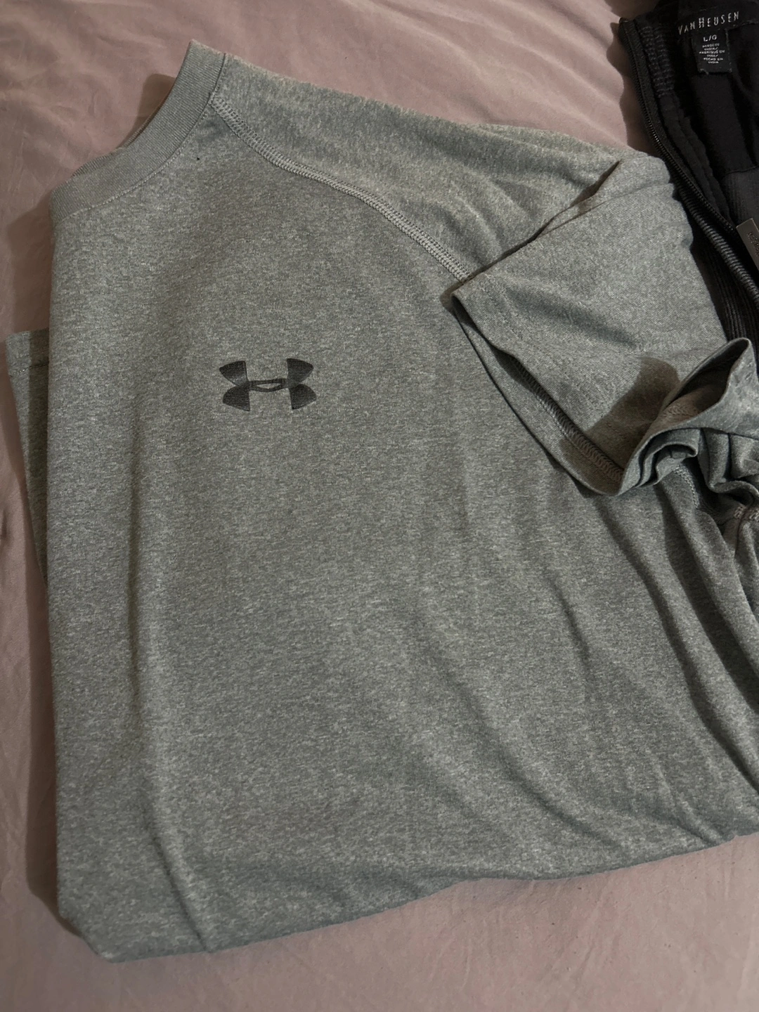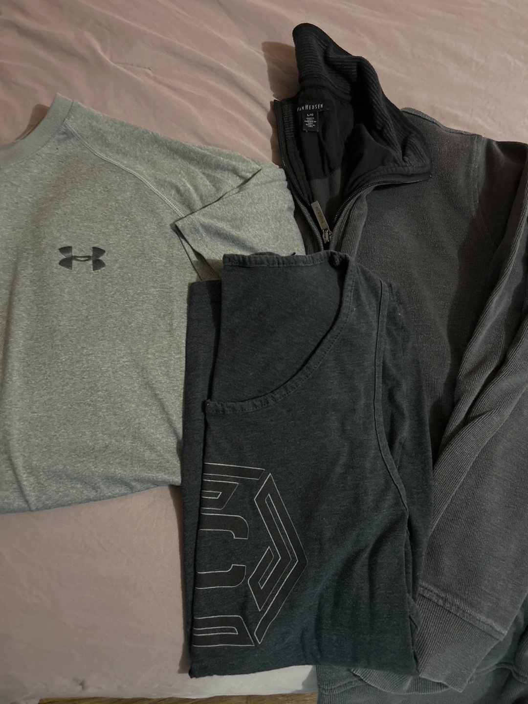 Selling a bundle of men's clothing! Includes an Under Armour shirt, a Van Heusen zip-up, and a gray tank top. All items are size large.