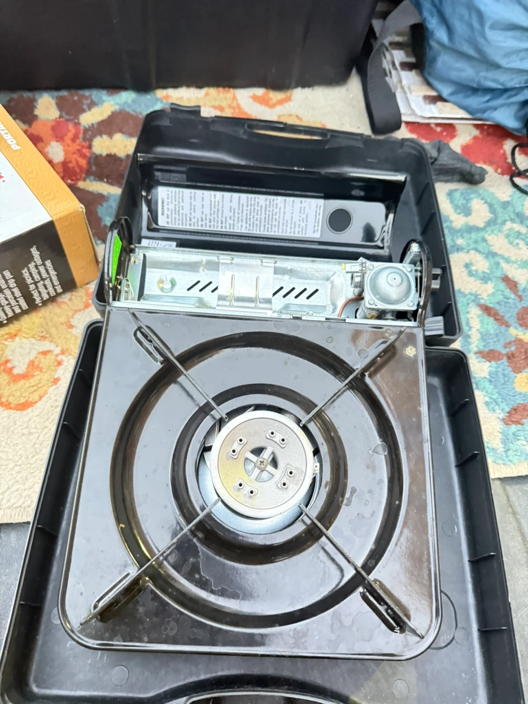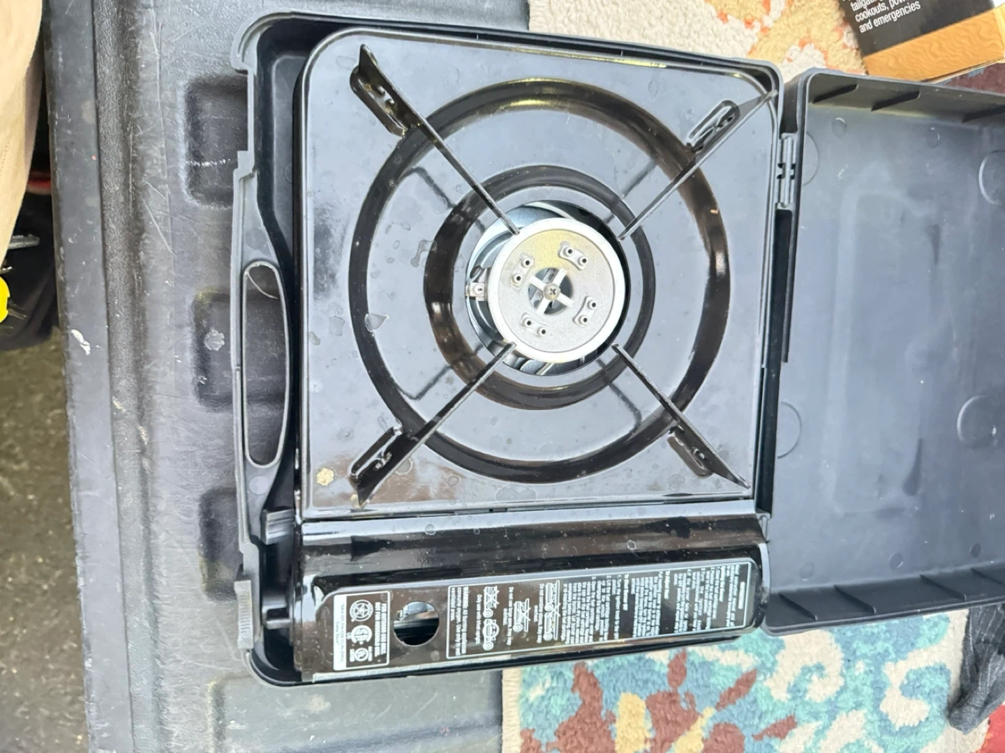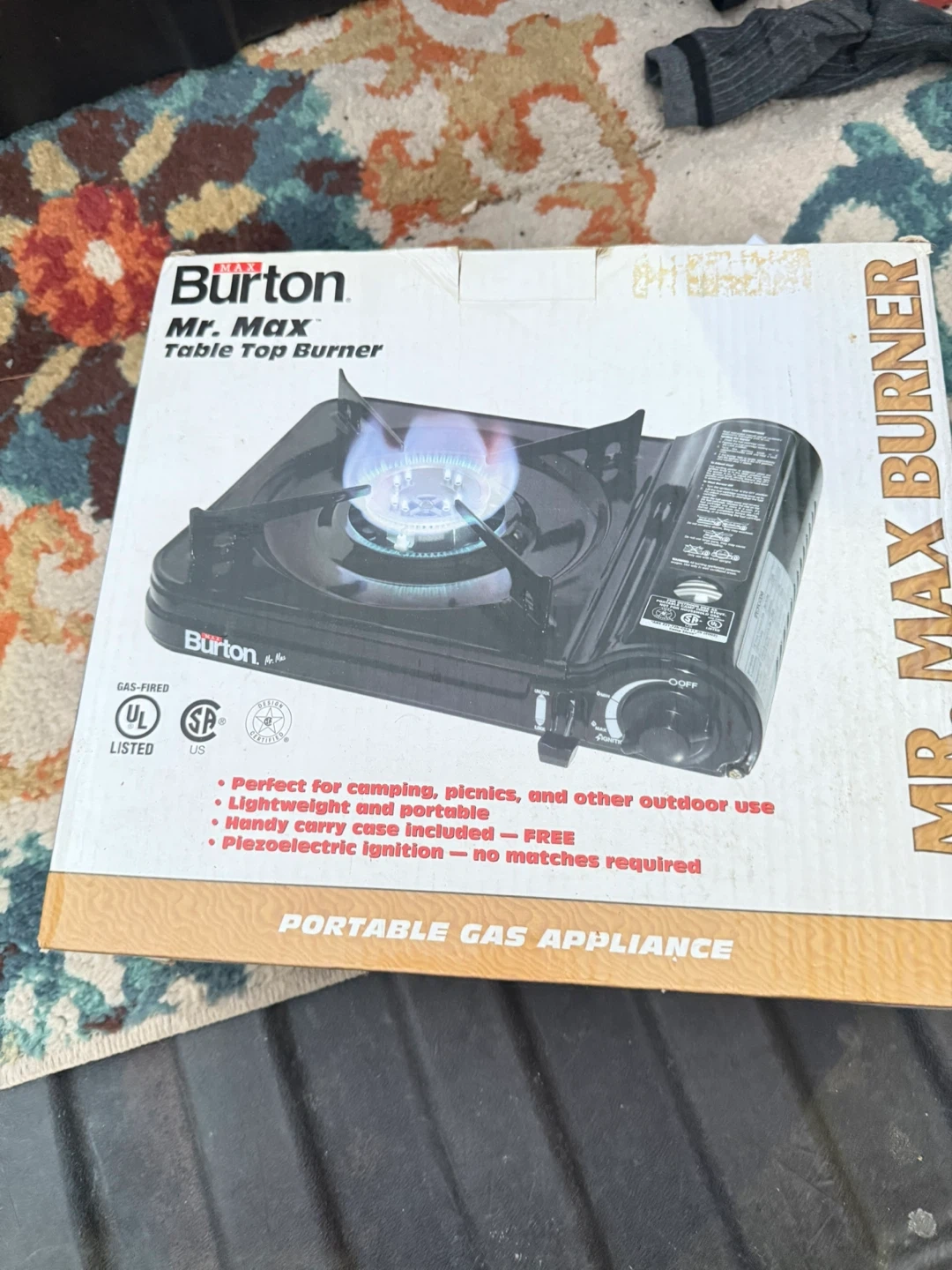 165I'm selling a Burton Mr. Max Table Top Burner! It's perfect for camping, picnics, and other outdoor uses. It's lightweight and portable and has a handy carry case included. It also has piezoelectric ignition, so no matches are required
