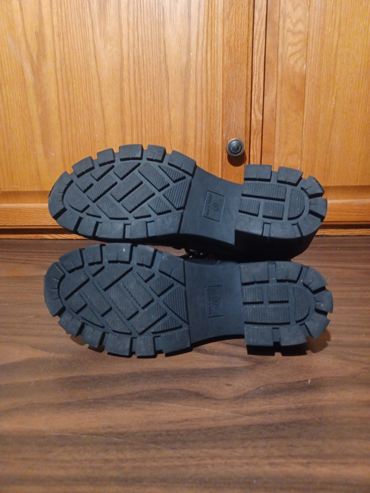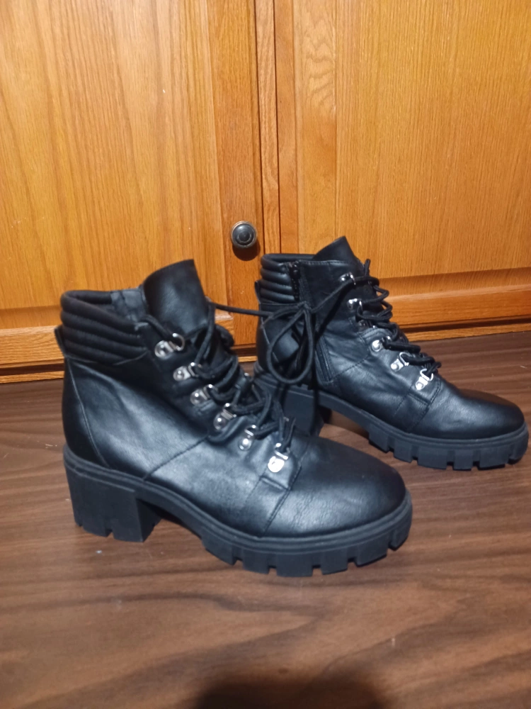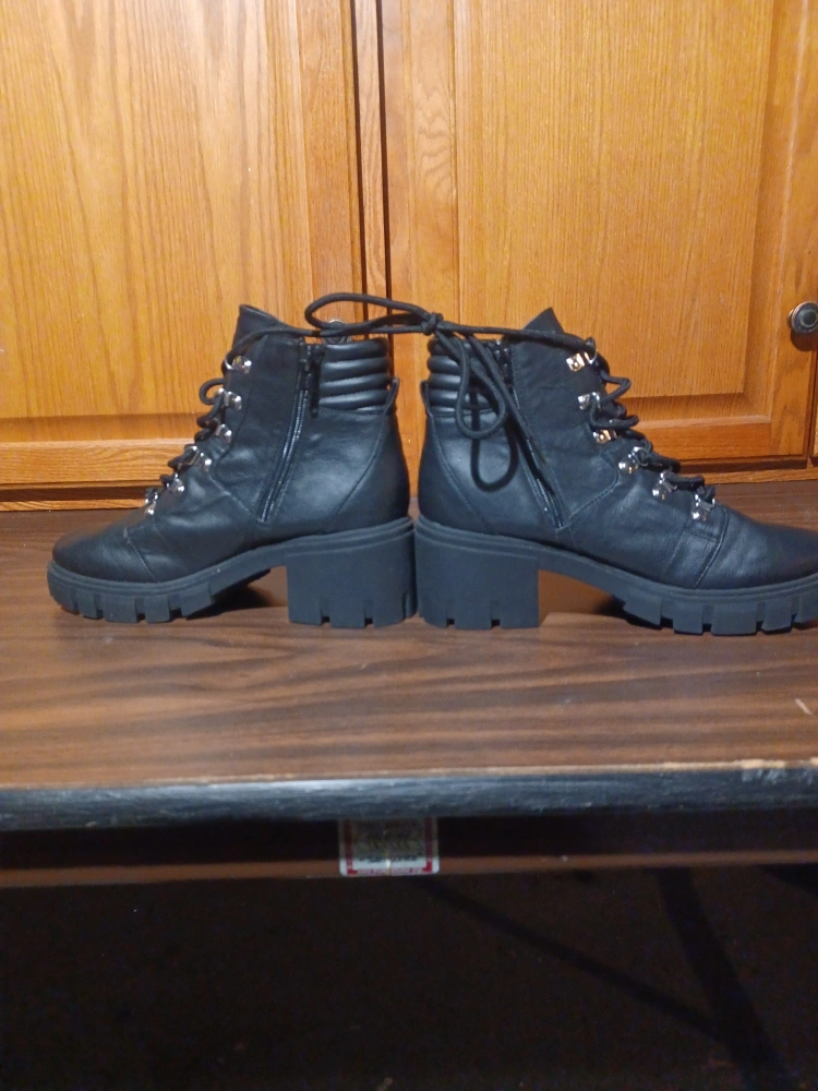 Selling a pair of black lace-up heeled ankle boots. They look great with any outfit and are super comfortable to wear. The boots are in good condition and ready for a new home