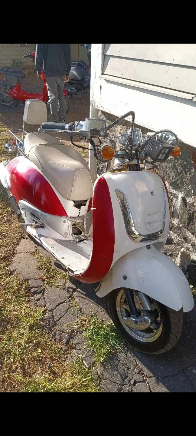 Selling a red and white scooter. It has a seat and handlebars. The scooter shows signs of wear and tear.