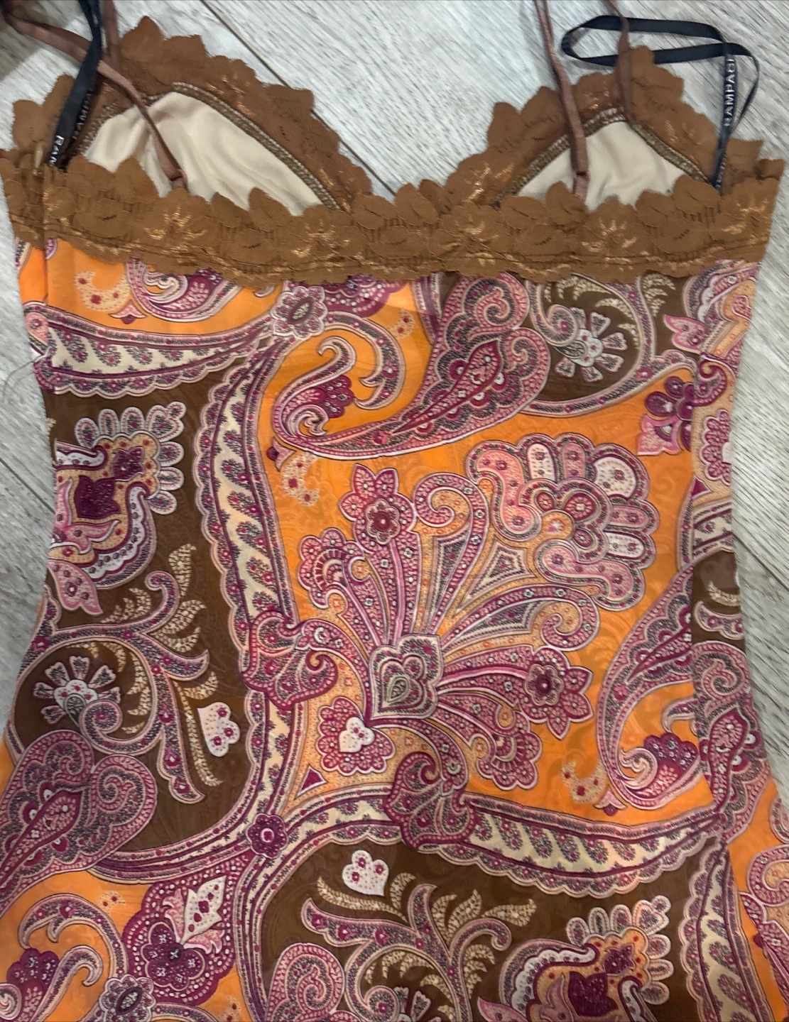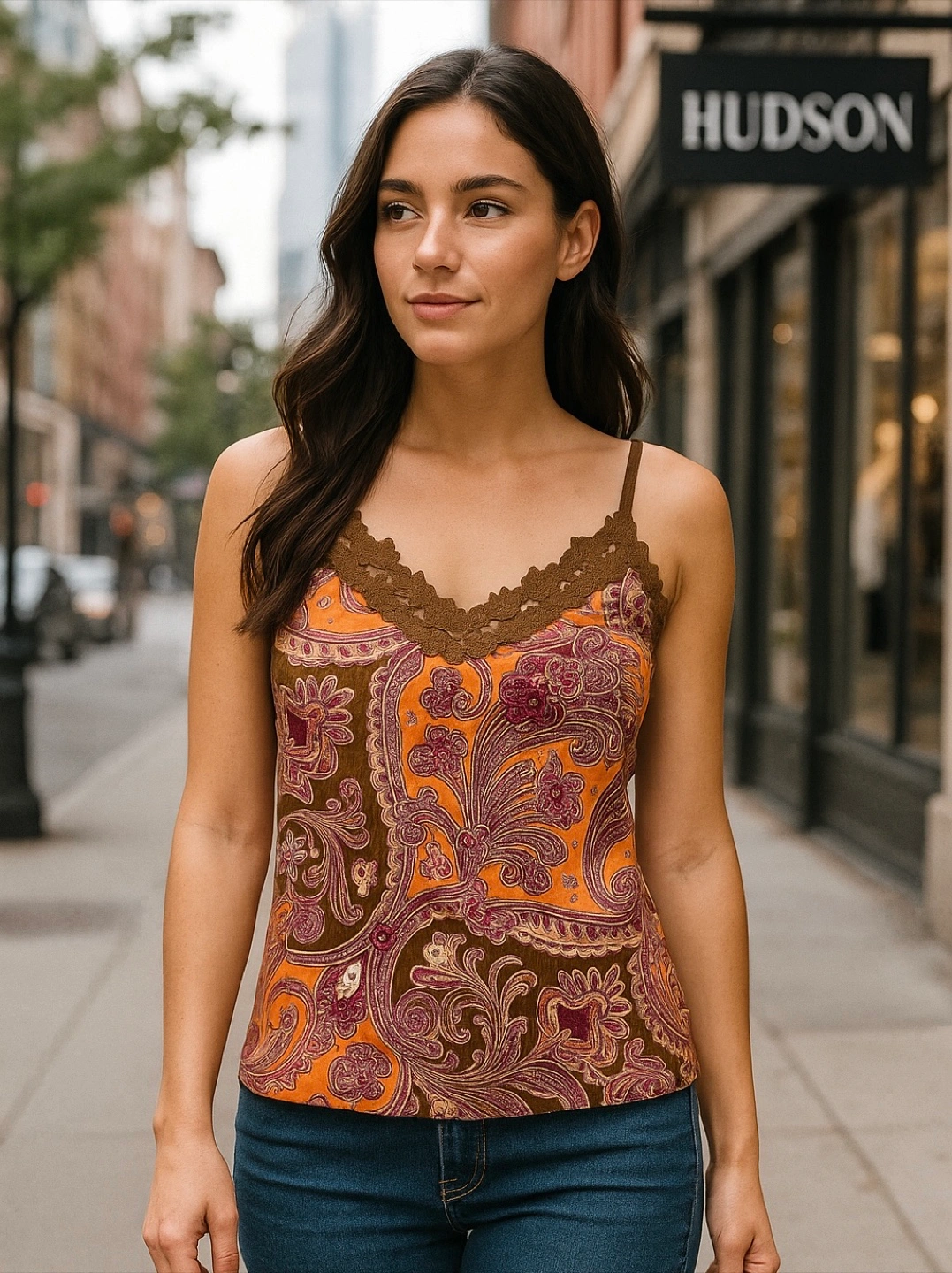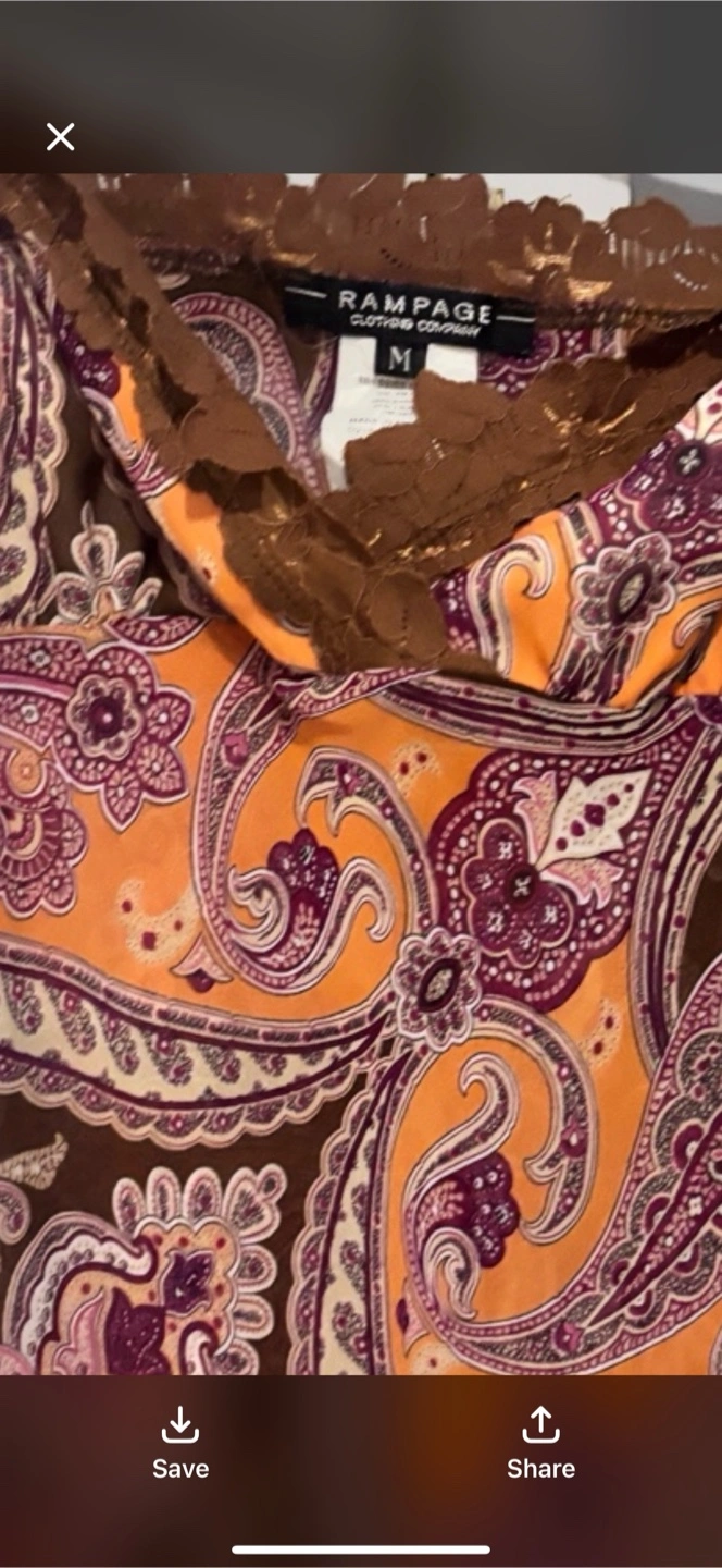 Add a touch of Y2K flair to your wardrobe with this vintage Rampage Clothing Company paisley camisole. Featuring rich fall tones of orange, pink, and chocolate brown, this top is detailed with leaf-shaped lace trim and adjustable spaghetti straps for the perfect fit. The silky lightweight fabric drapes beautifully and feels soft against the skin — ideal for layering under a blazer or wearing alone on warm days. Details: • Brand: Rampage Clothing Co. • Size: Medium • Made in Mexico • 100% Polyester • Adjustable straps • Leaf-pattern lace trim • Paisley print in warm boho tones • Gently worn, excellent condition — no flaws, stains, or snags Pair it with jeans and booties for an effortless boho look, or dress it up with a leather skirt and heels for date night.