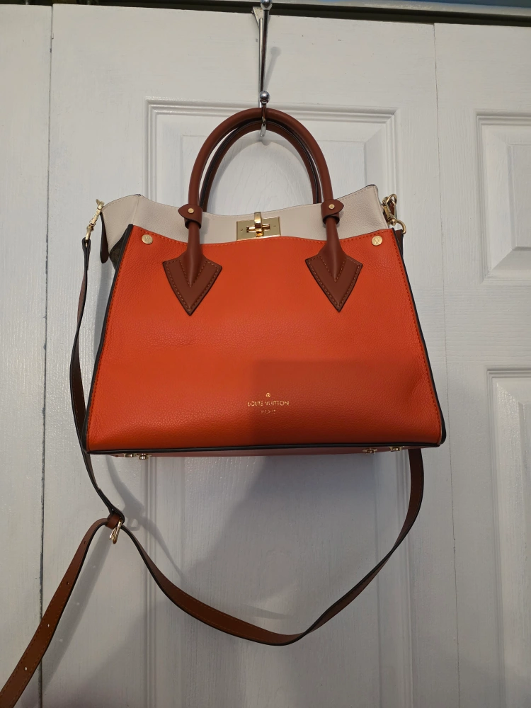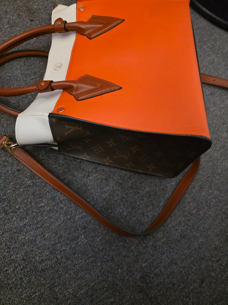 Selling a stylish Louis Vuitton handbag featuring a vibrant orange leather exterior. It includes brown handles and a shoulder strap. The bag showcases the classic Louis Vuitton monogram pattern on the bottom. It's in great condition and ready for a new home