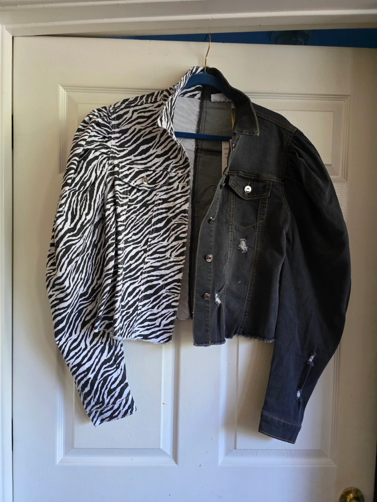 This unique jacket features a zebra print on one side and denim on the other. It also has a couple of lip patches, making it a super fun and eye-catching piece
