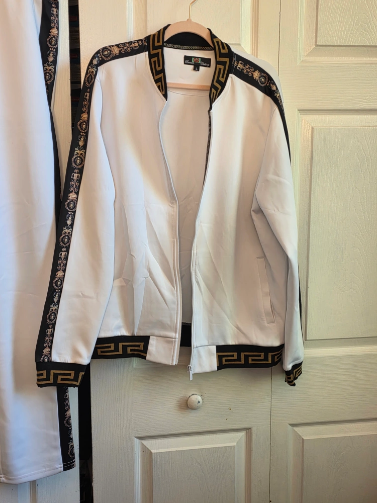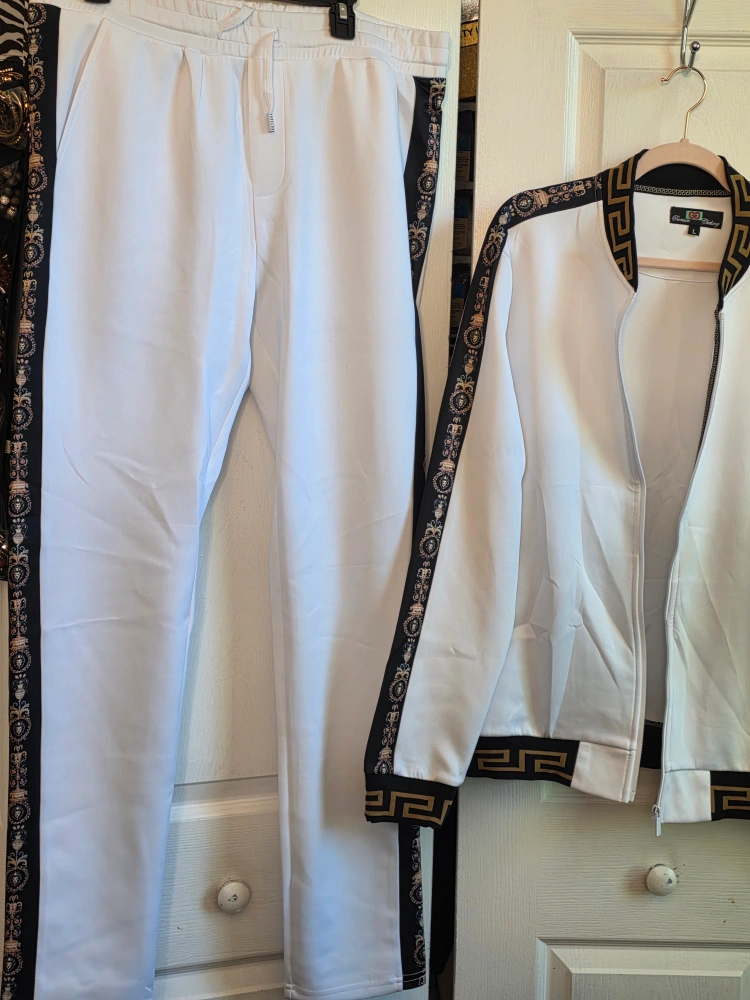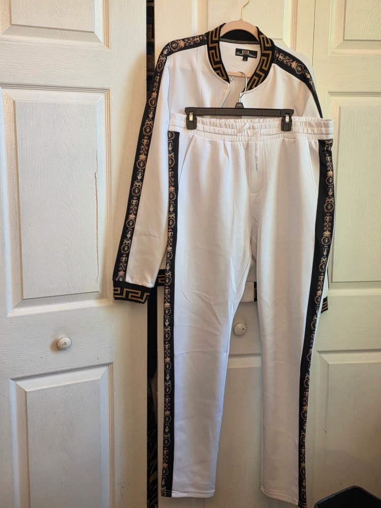 Selling a womans white tracksuit with black and gold accents. The set includes a jacket and pants. It's in great condition and ready for a new owner!