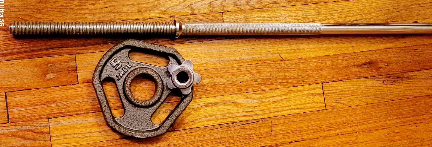 Selling a weight bar and a 5lb weight plate. The plate has '5 JADE' on it. Good for starting out