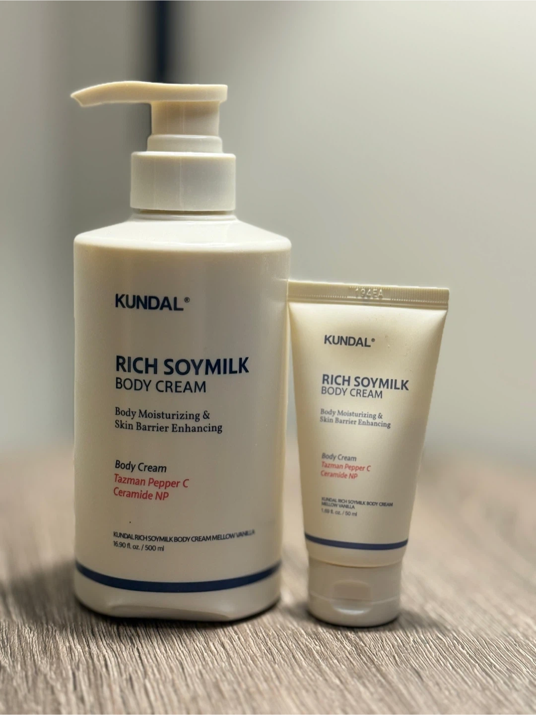 60Selling a set of Kundal Rich Soymilk Body Cream! This set includes a large 500ml bottle and a smaller 50ml tube, perfect for travel or on-the-go use. The cream is designed to be body moisturizing and skin barrier enhancing with Tazman Pepper C and Ceramide NP. It's a great way to keep your skin feeling soft and hydrated!