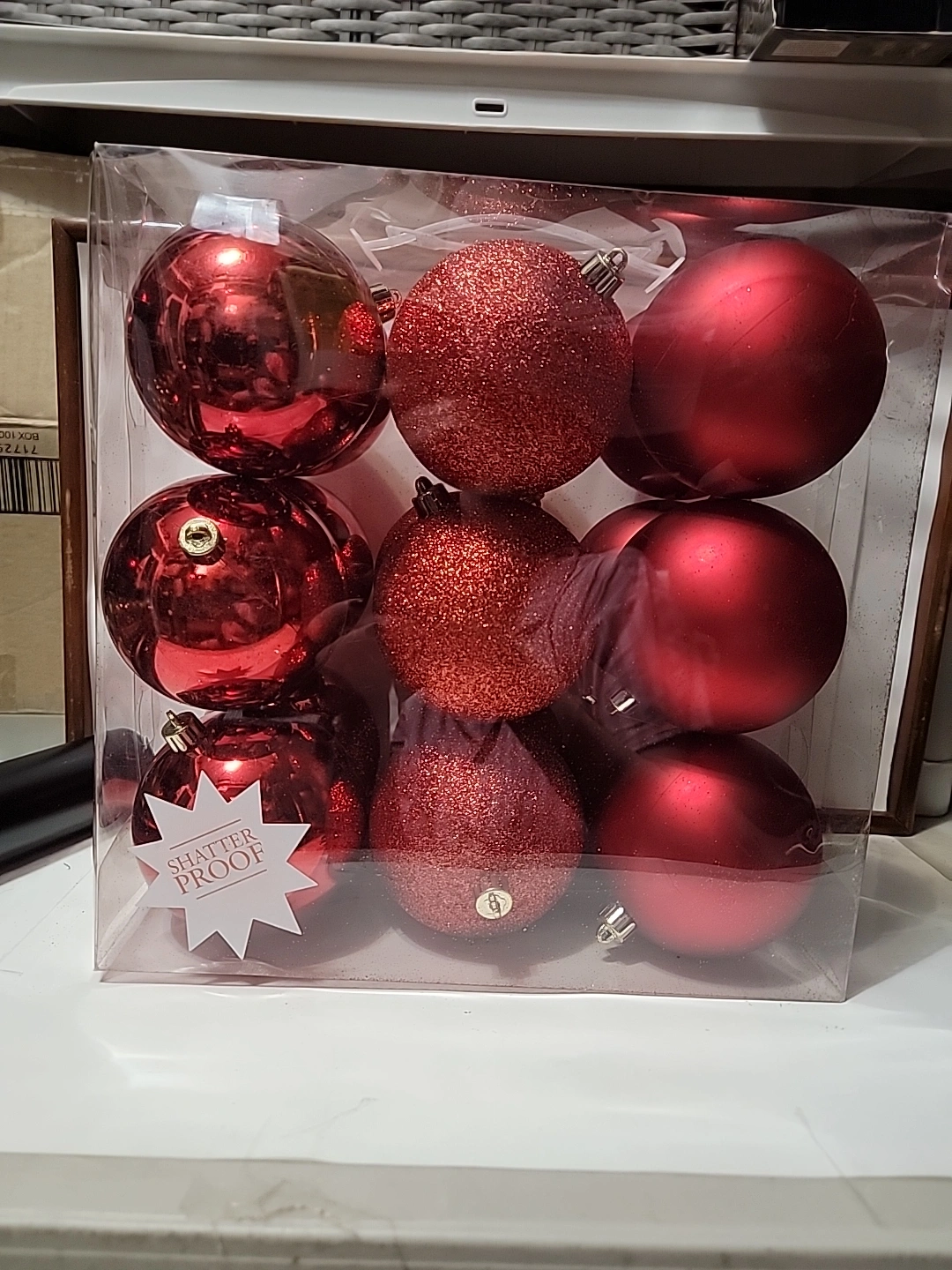 Selling a set of 18 red Christmas ornaments from Hobby Lobby! They come in a clear plastic box. The ornaments are 100mm in size and include a mix of shiny and glittery finishes. Originally bought for $23.98