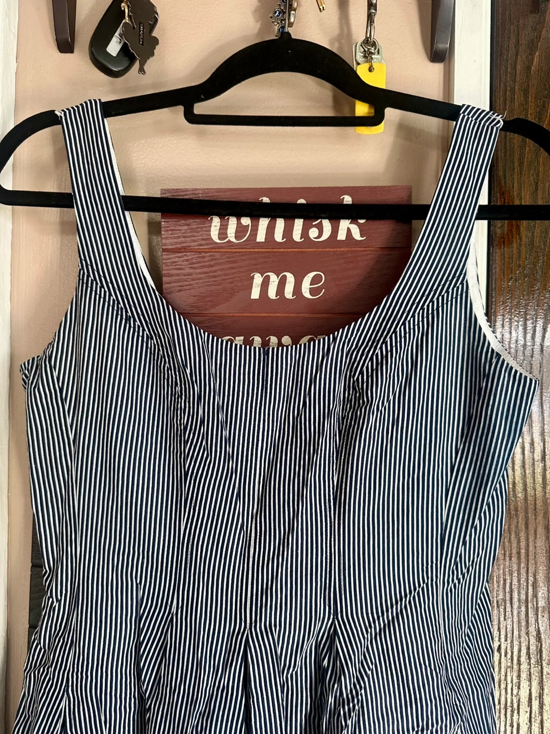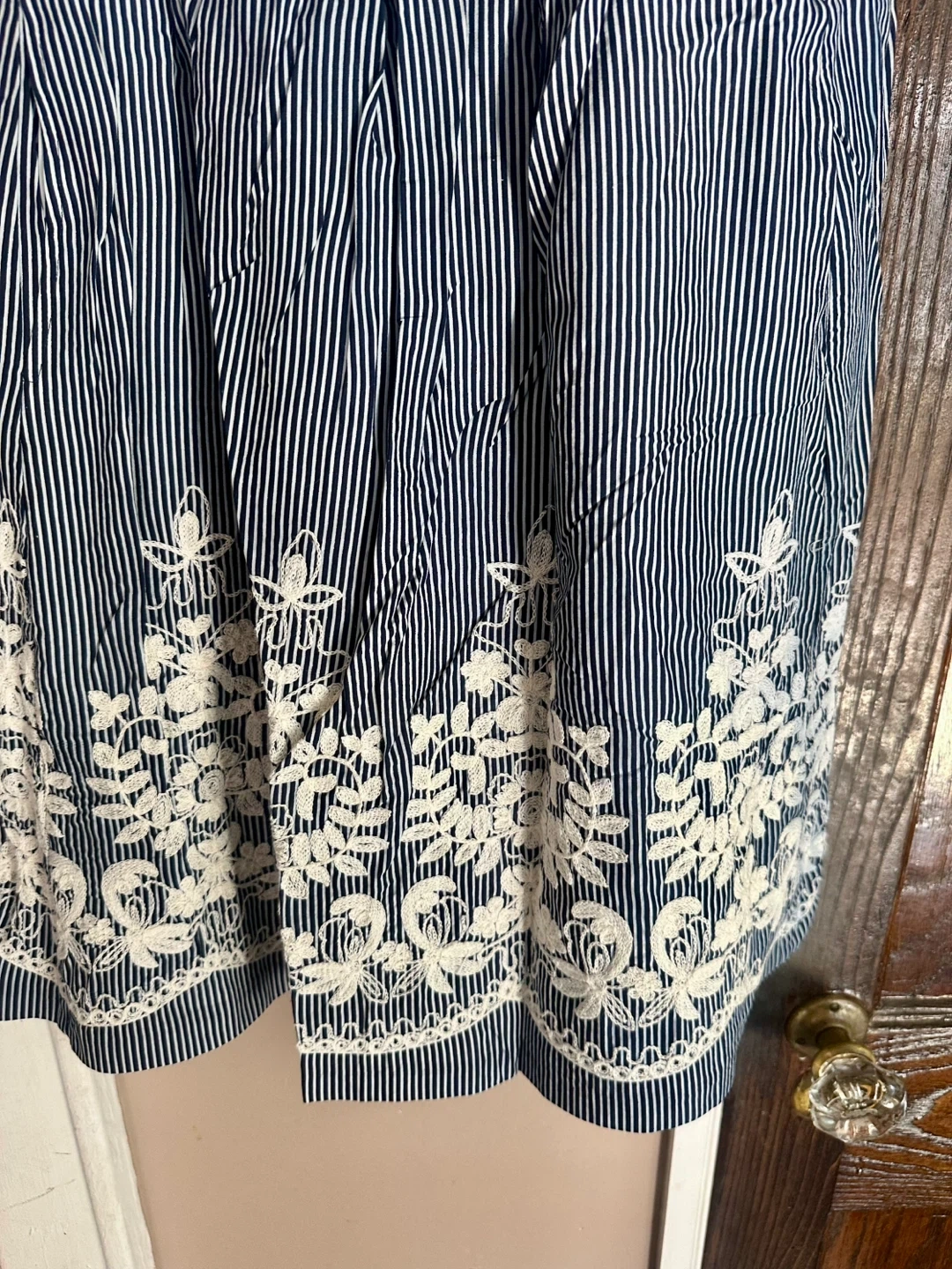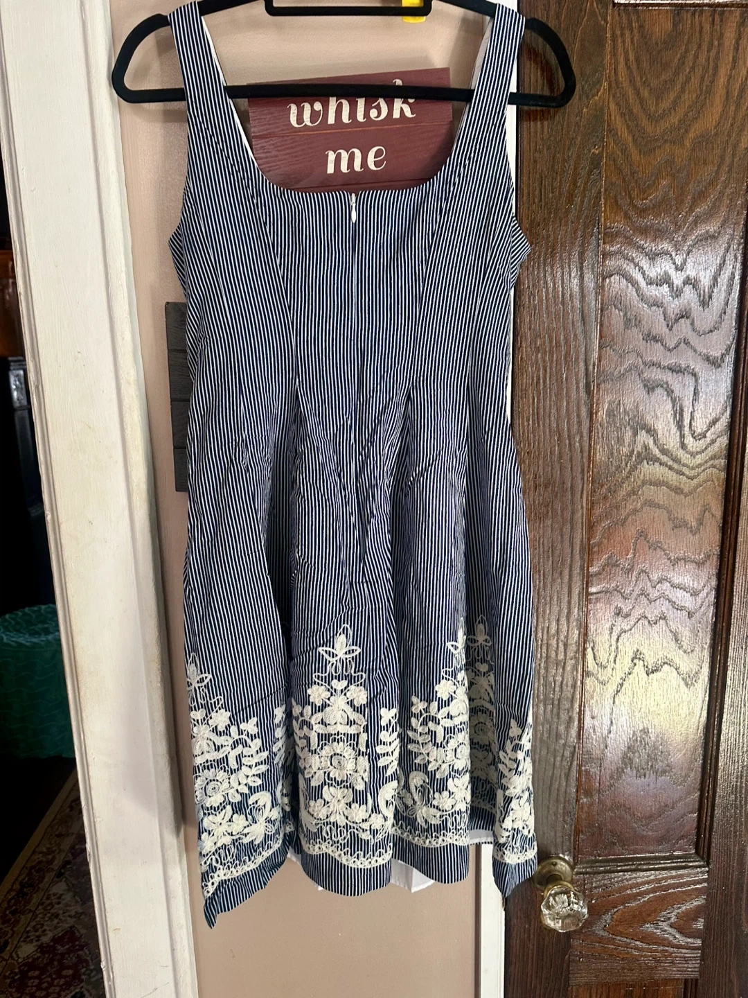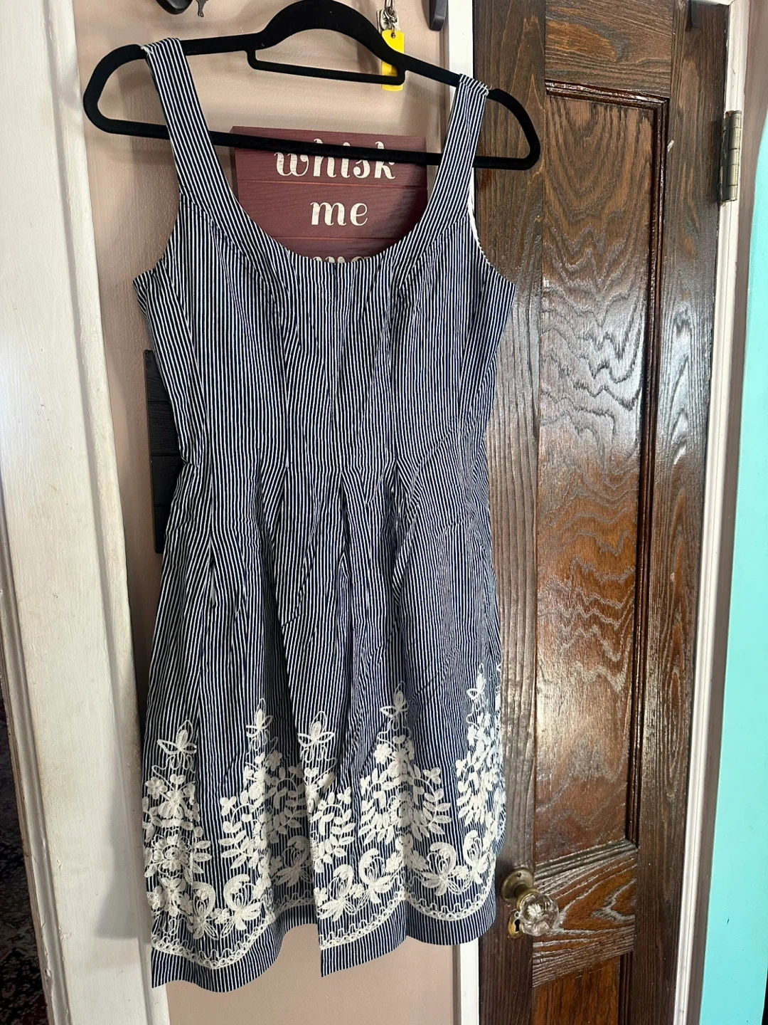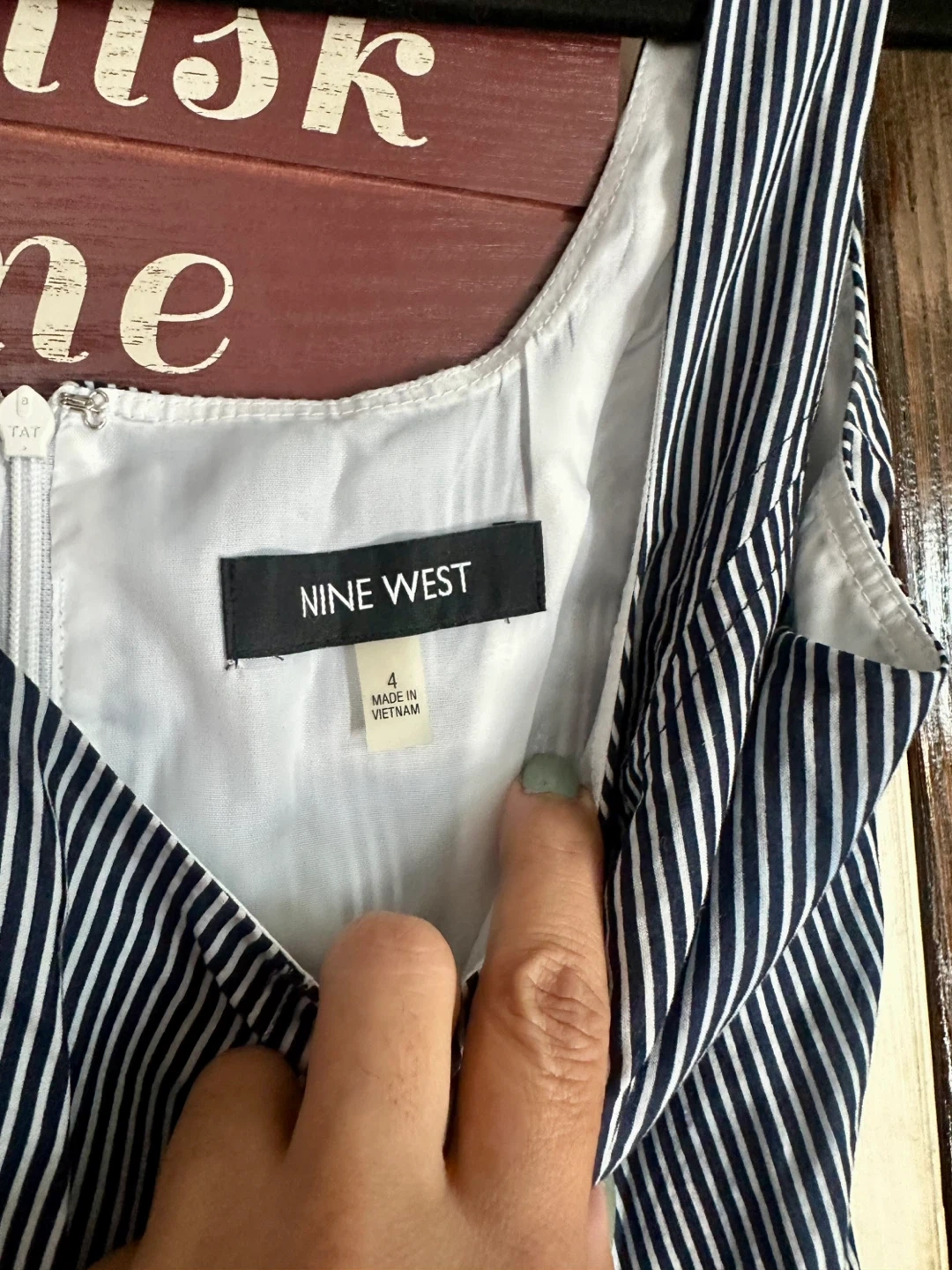 21This is a cute Nine West dress in a blue and white striped pattern. It's a size 4 and features a floral lace trim at the bottom. Perfect for a summer day out!