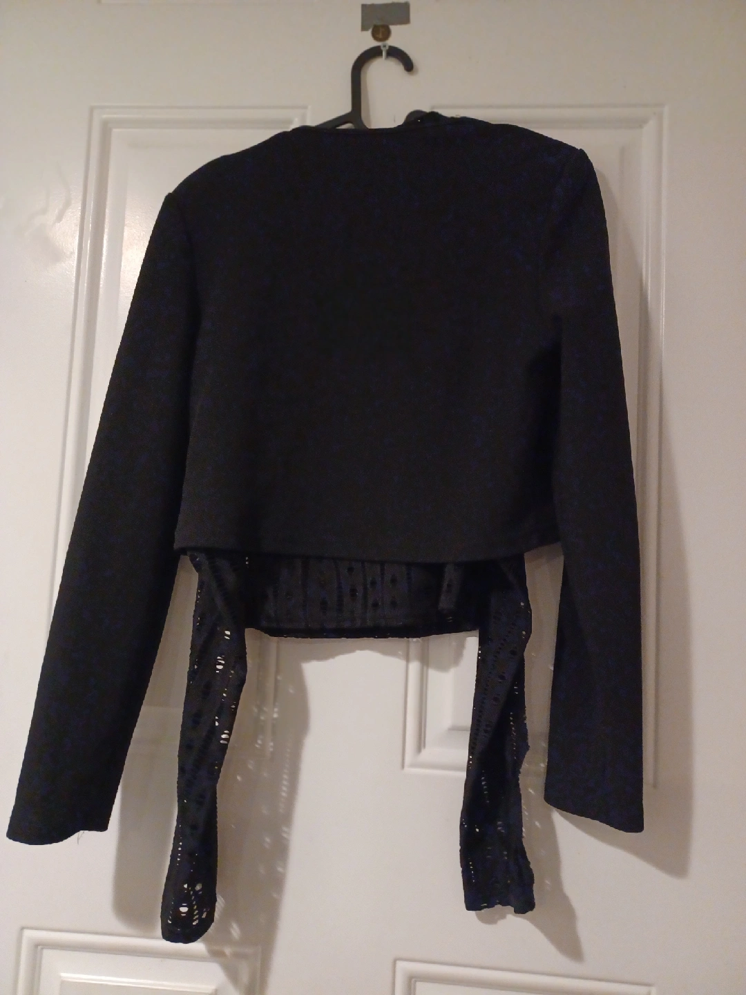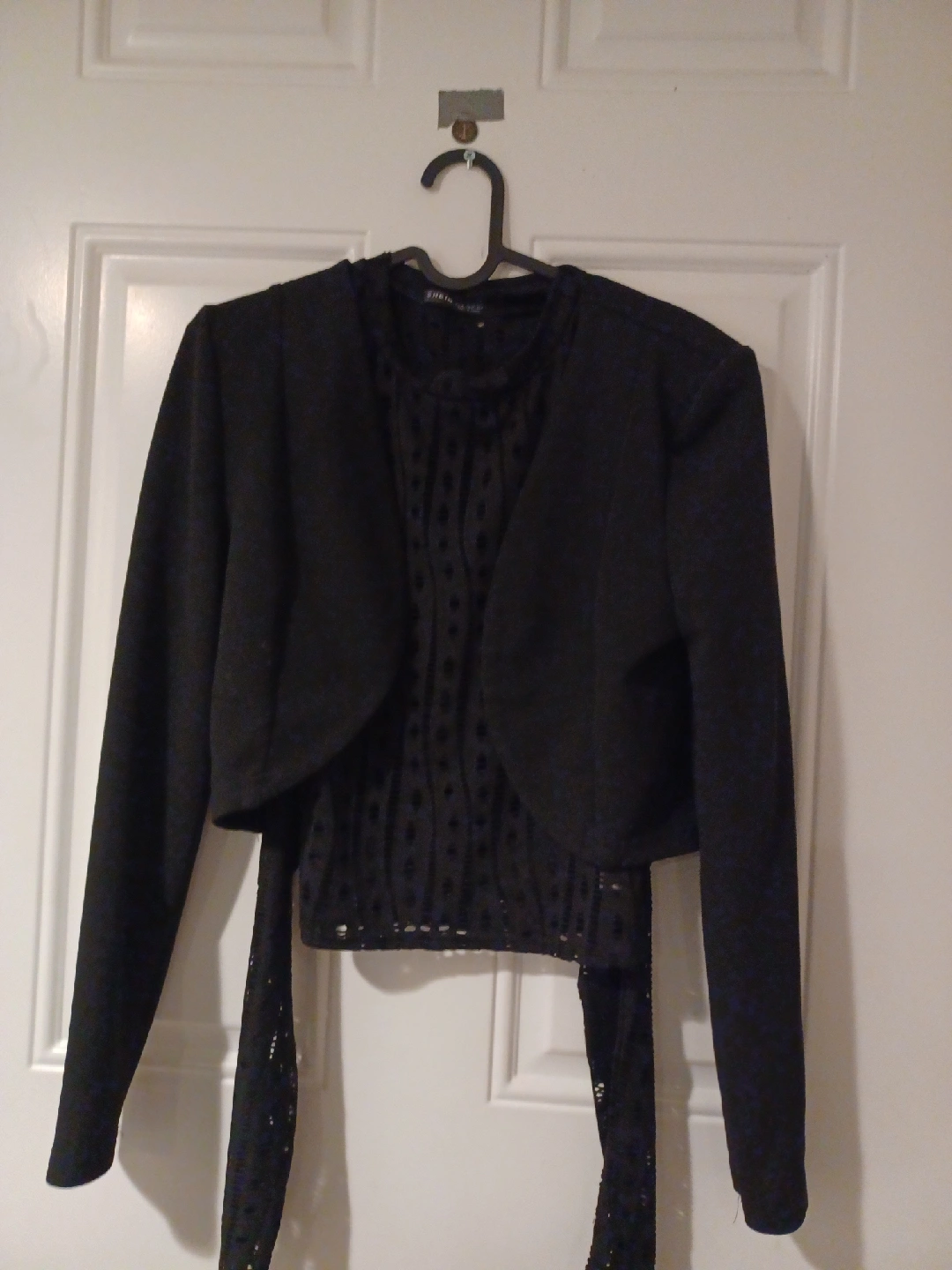 I'm selling a black bolero from Shein. It's in perfect condition and perfect for layering over a dress or top. It's a two-piece. The material is light and comfortable. It has a cropped cut and long sleeves. It would make a great addition to your wardrobe!