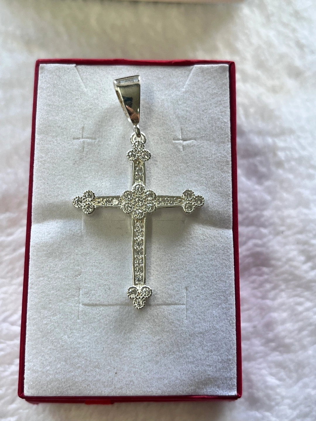 65Here's a beautiful silver 9.25 cross pendant, adorned with sparkling rhinestones! It comes in a presentation box, perfect for gifting or keeping it safe. This elegant piece is sure to add a touch of sparkle to any outfit Cruz Plata 9.25 de Taxco con piedreria zirconia para cualquier ocasión para lusirla
