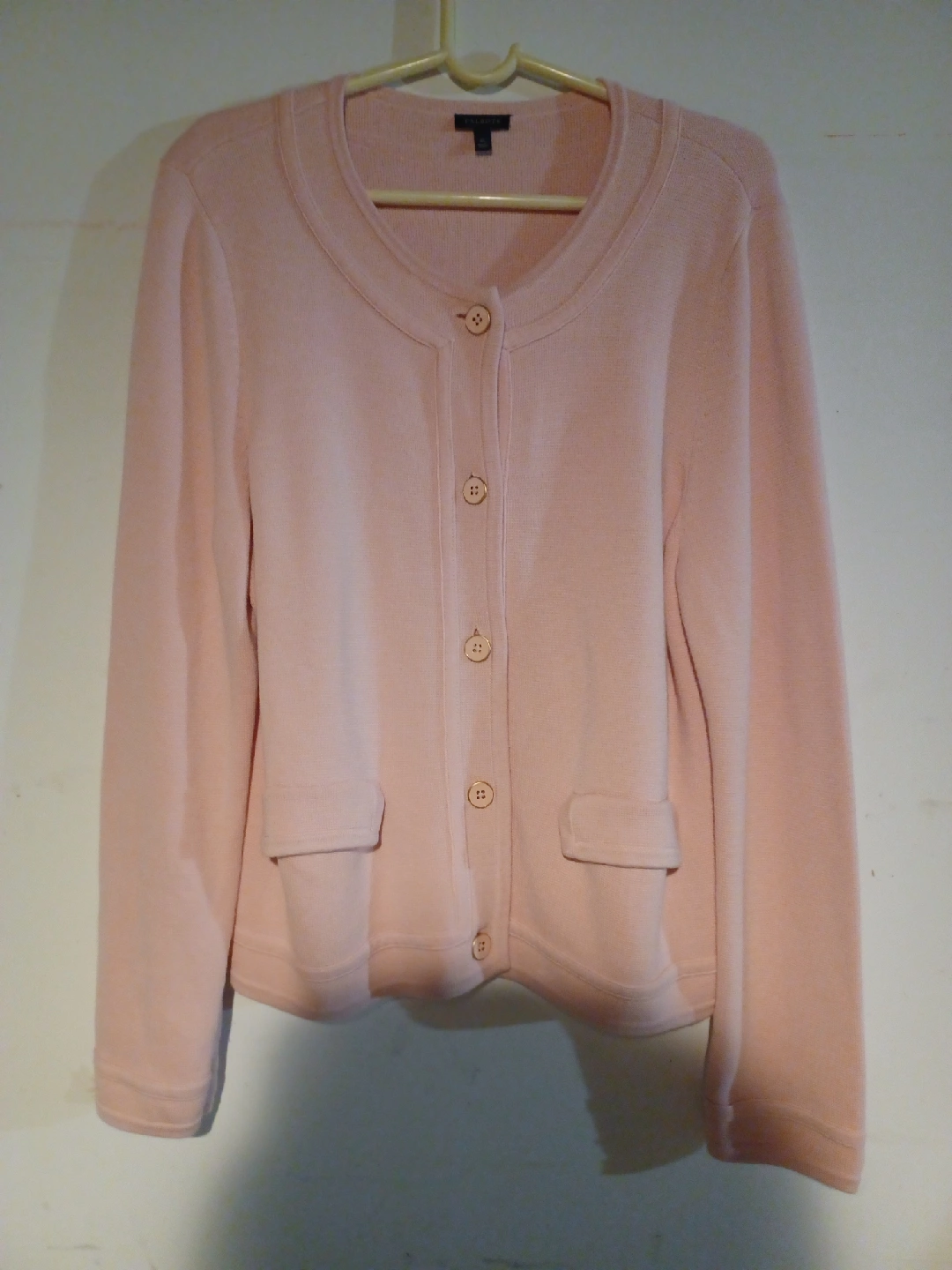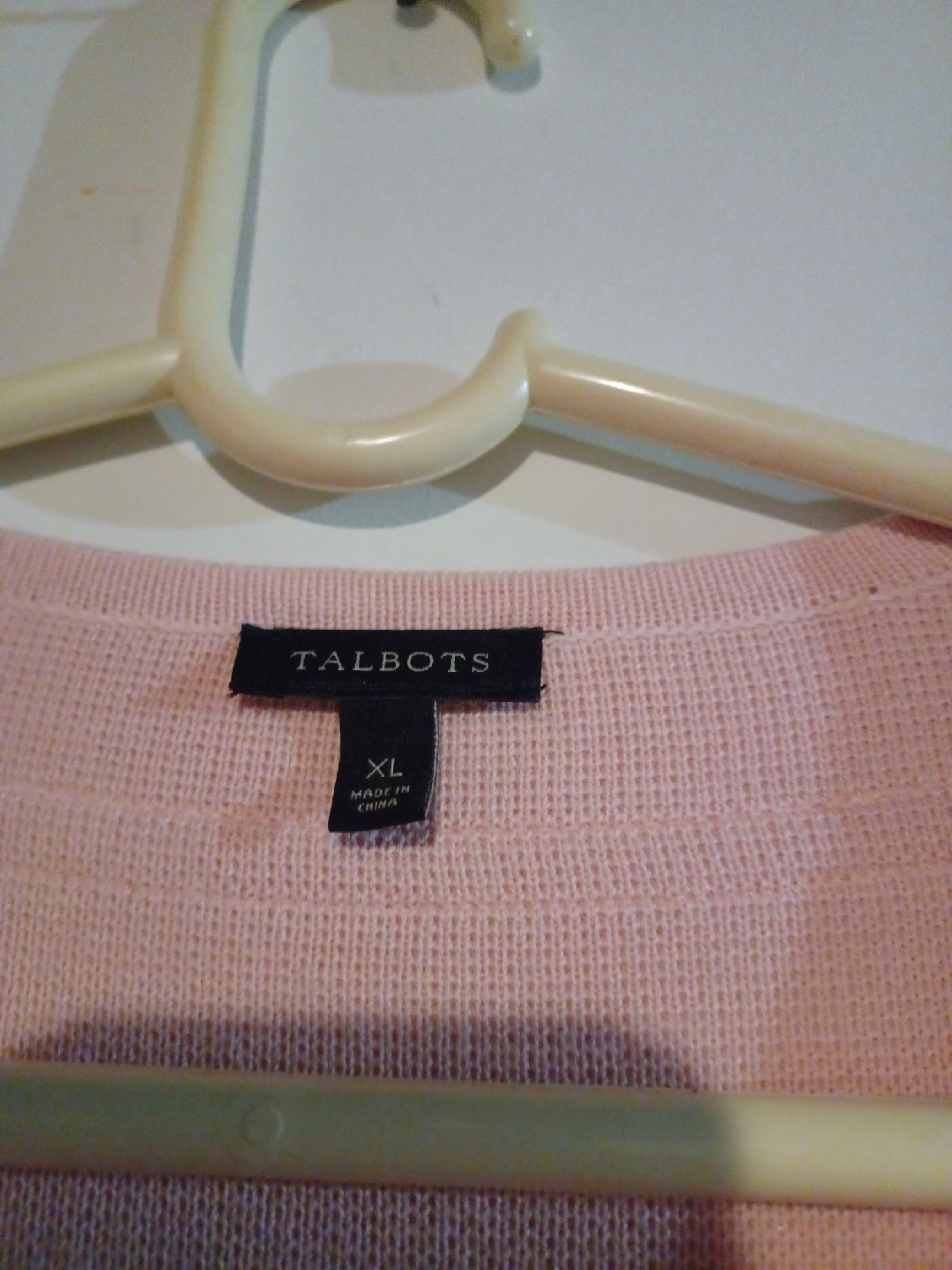 Selling a Talbots cardigan in a light pink color. It's a size XL and made in China. Perfect for layering!
