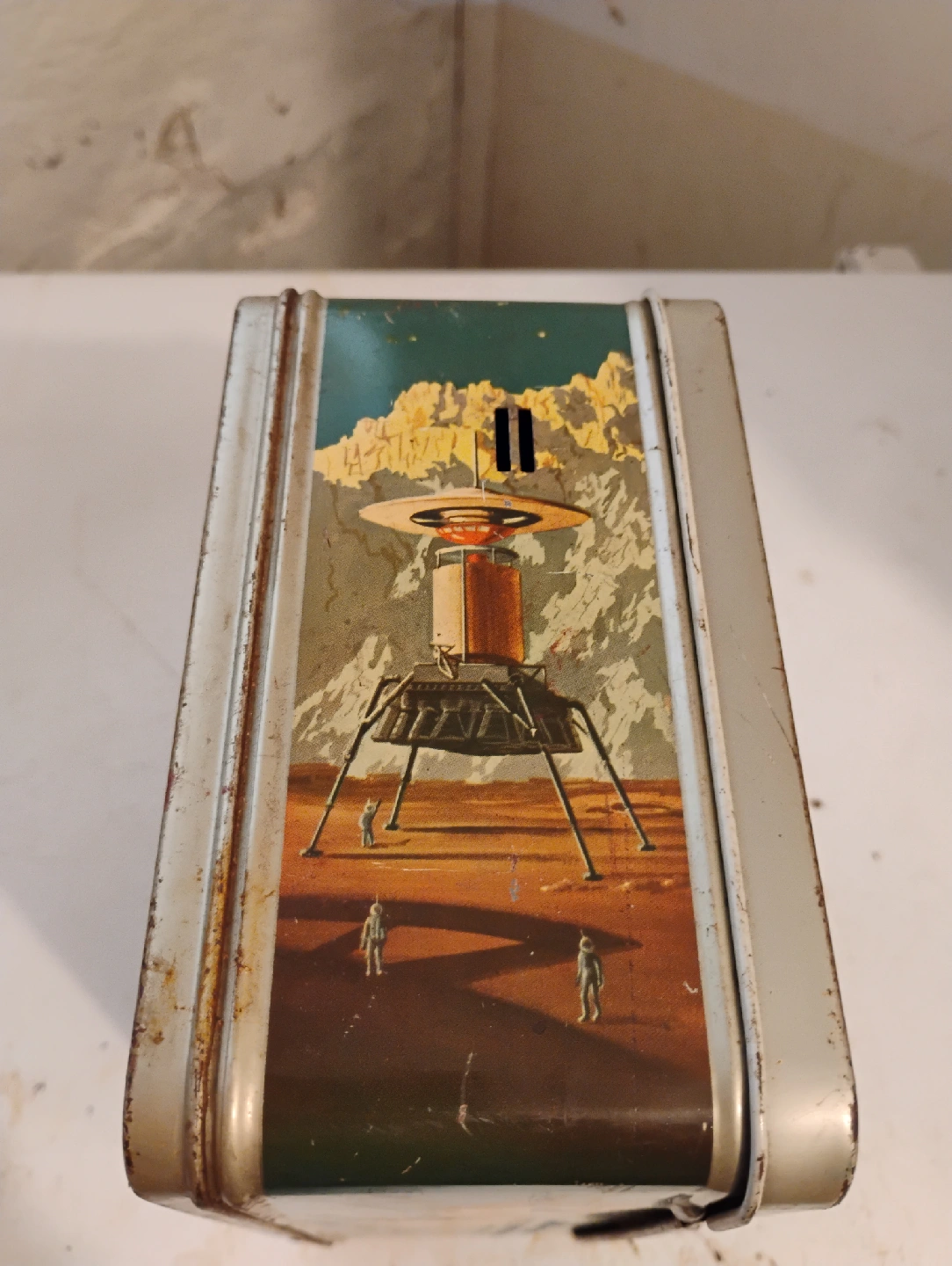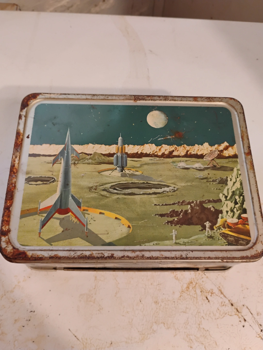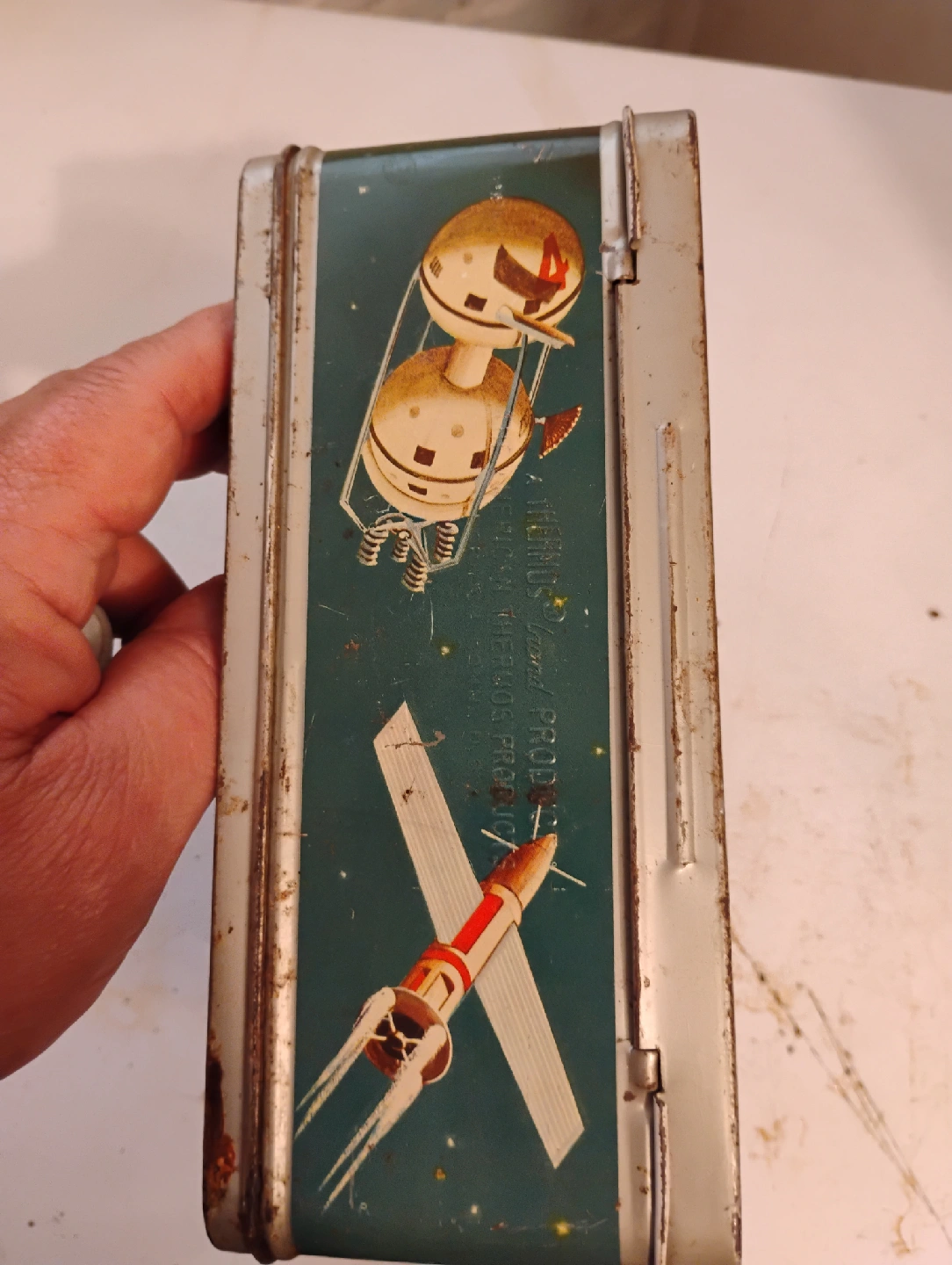 Selling a vintage 1958 Thermos brand lunchbox with cool space-themed graphics!