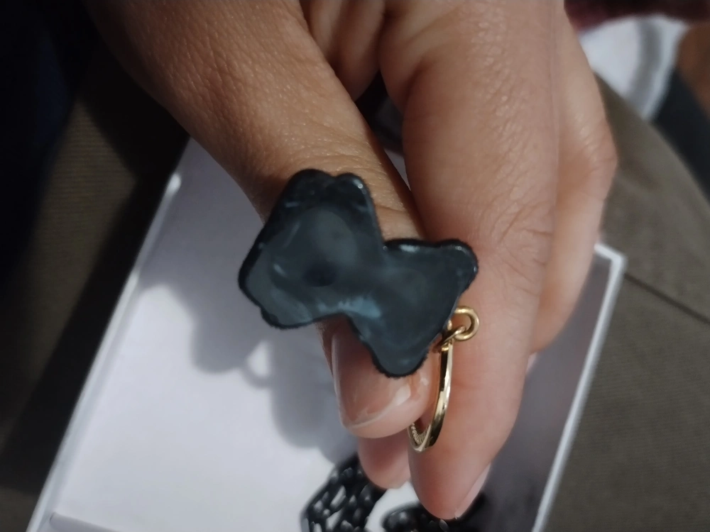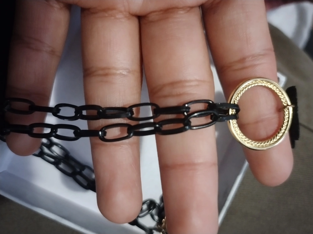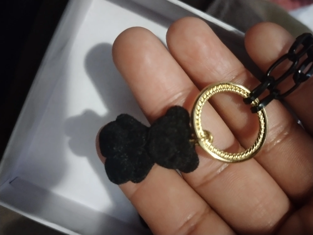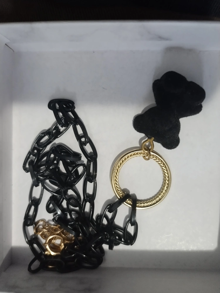 Here's a stylish necklace featuring a black chain and a gold-tone ring detail! It's in great condition and comes with its original box