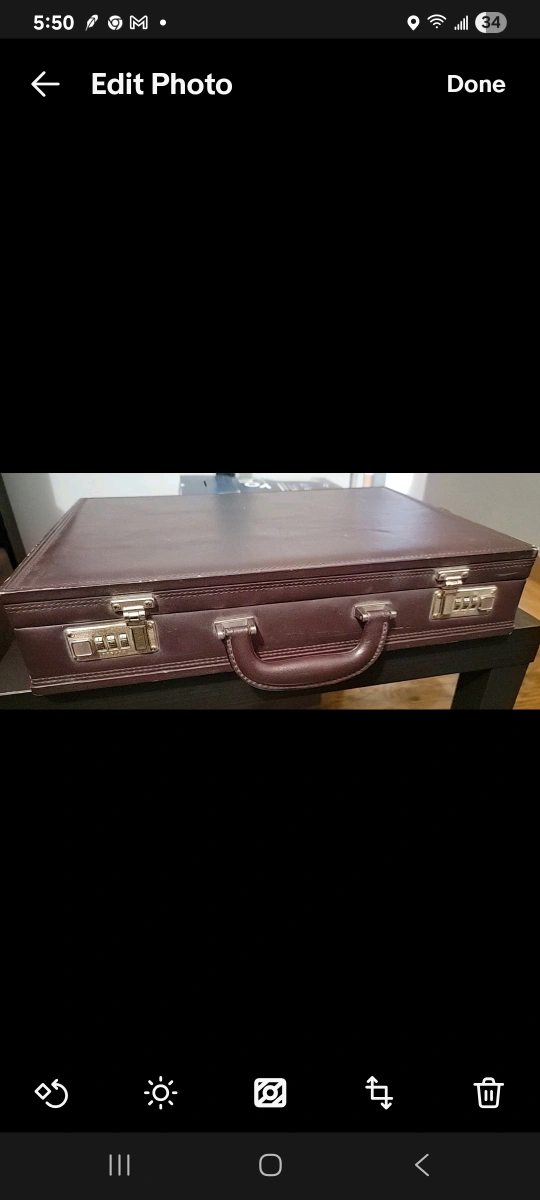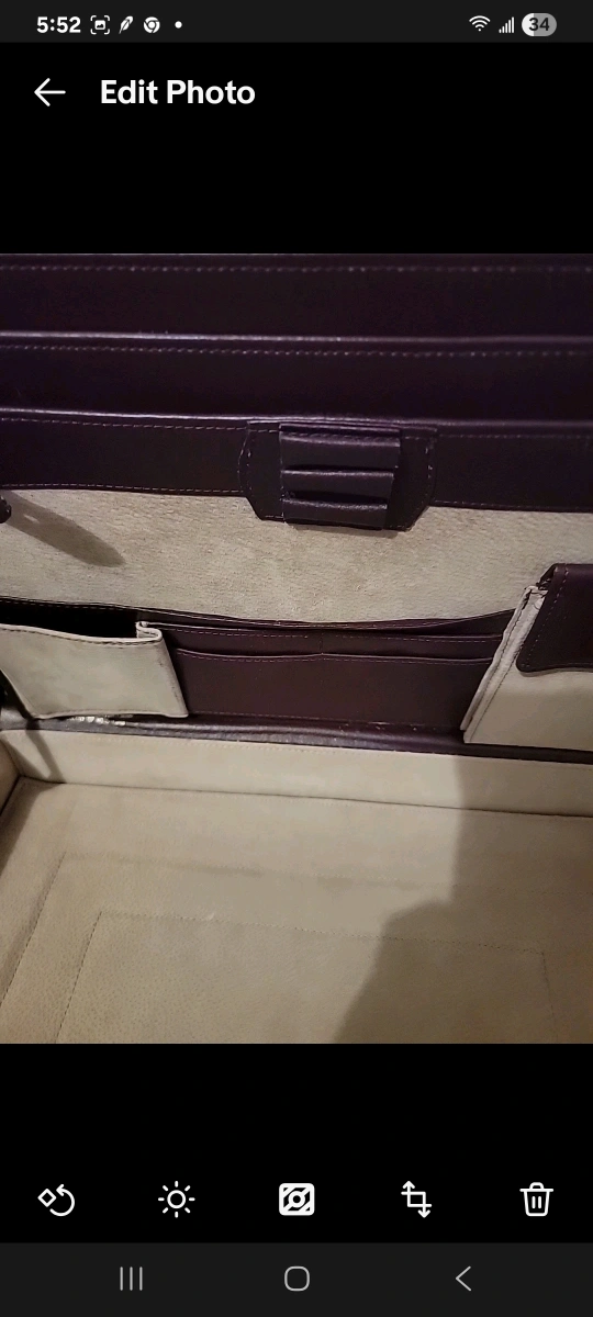 Selling a brown leather briefcase with combination locks. It has a few scratches on the exterior, but the interior is in good condition. It has multiple compartments inside to help keep you organized