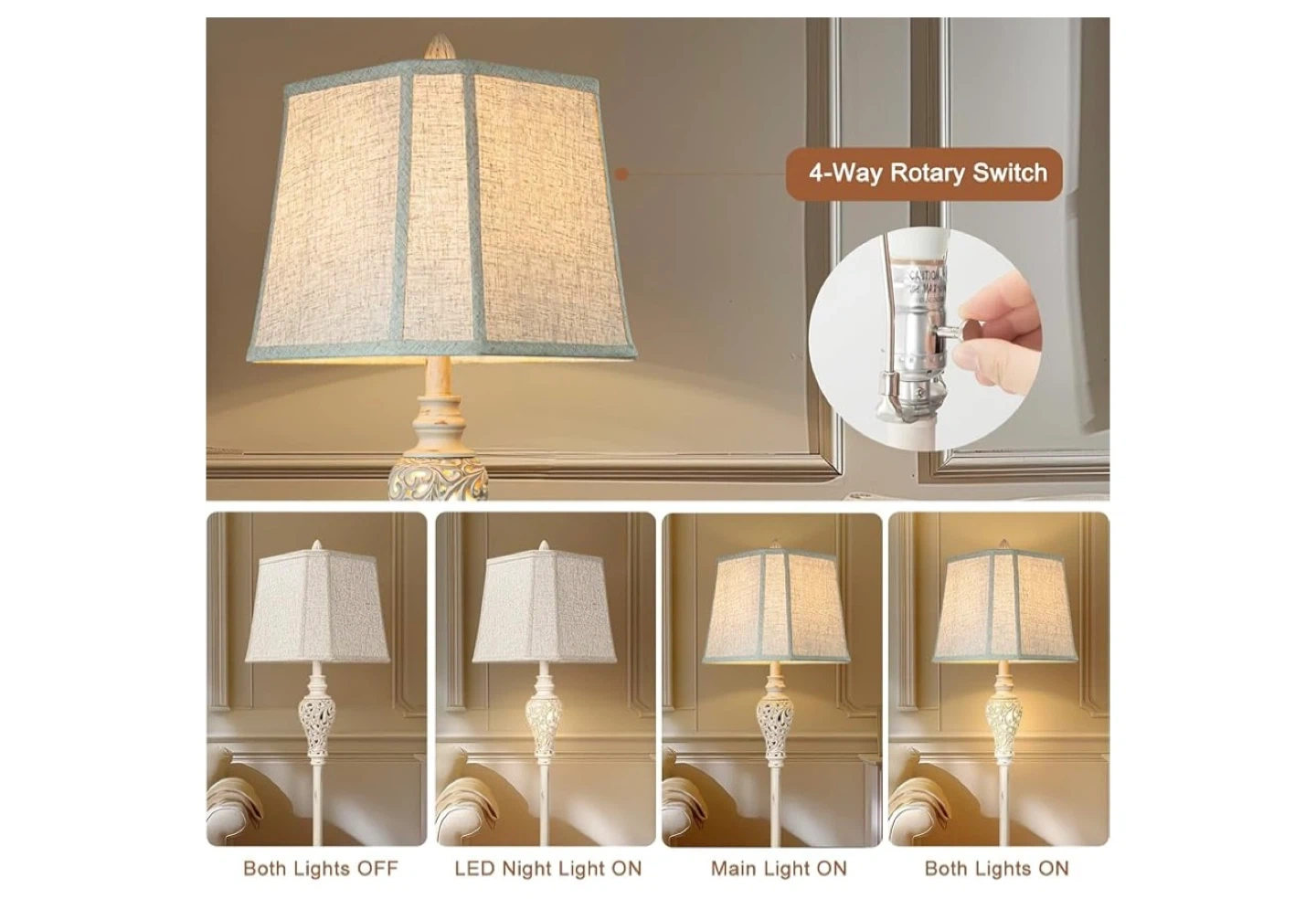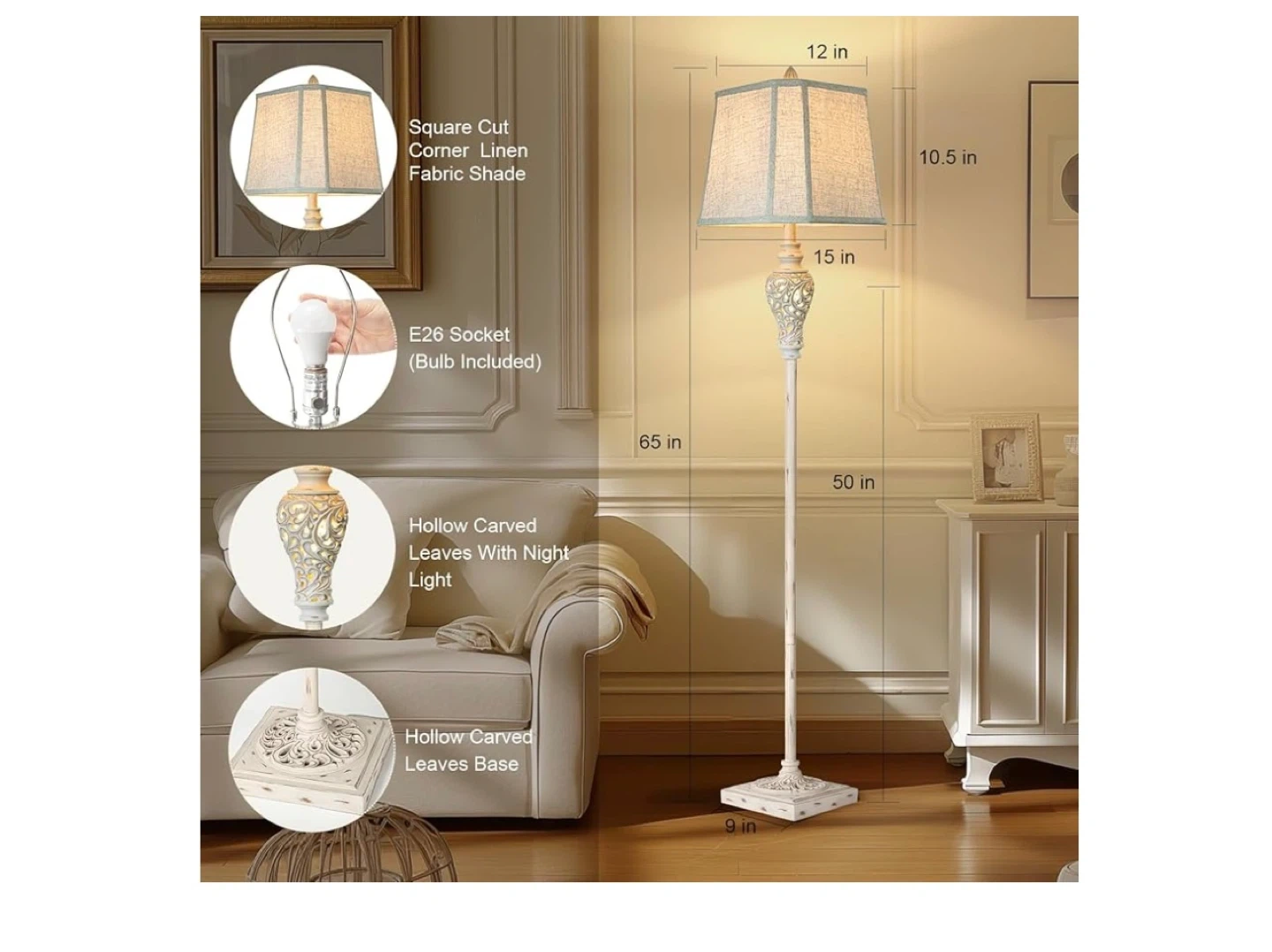 46This floor lamp features a square cut corner linen fabric shade and a hollow carved leaves design with a night light. It has a 4-way rotary switch for adjusting the lighting. The lamp stands 65 inches tall and has a 9-inch square base. It also includes an E26 socket for the bulb