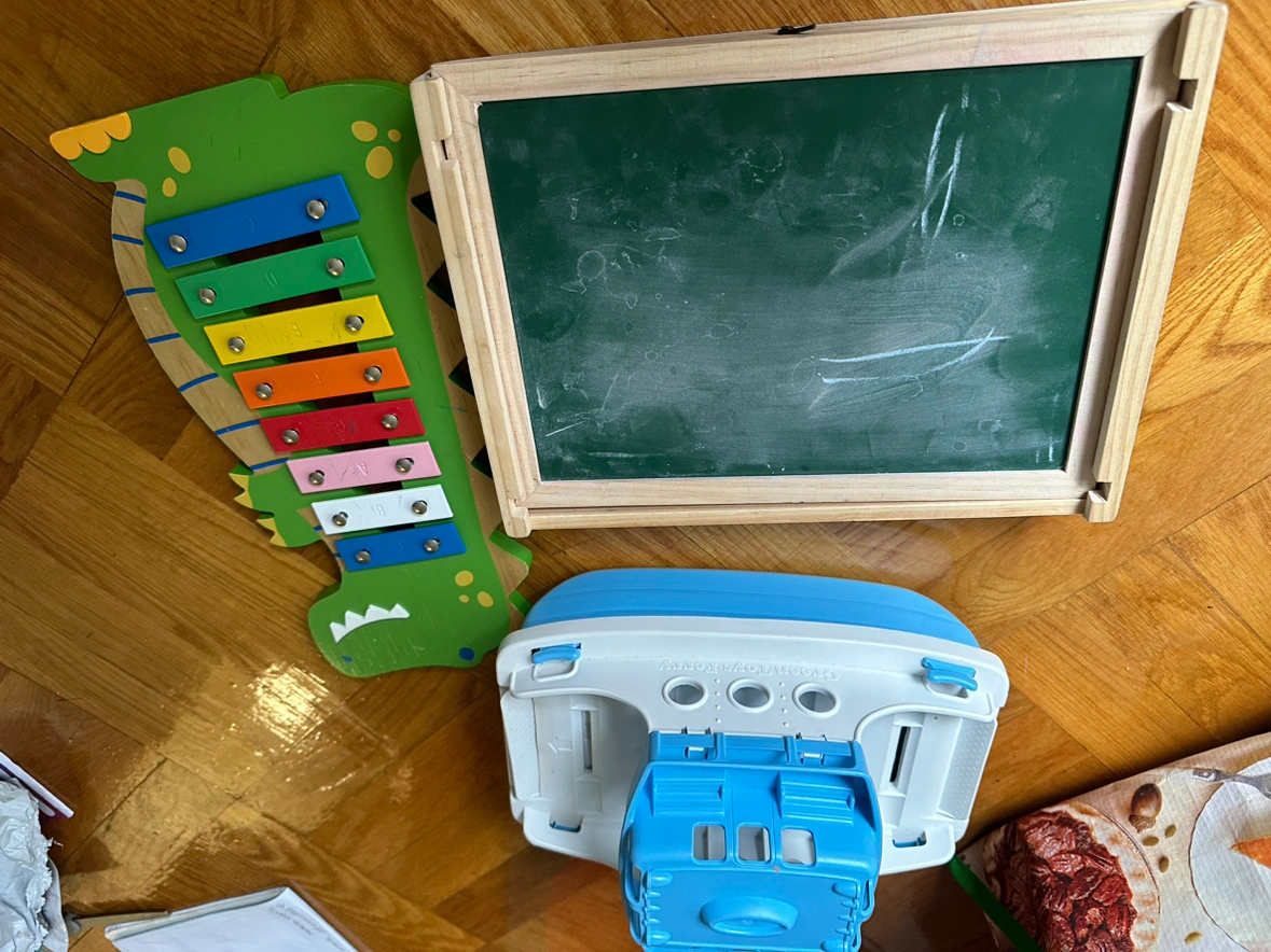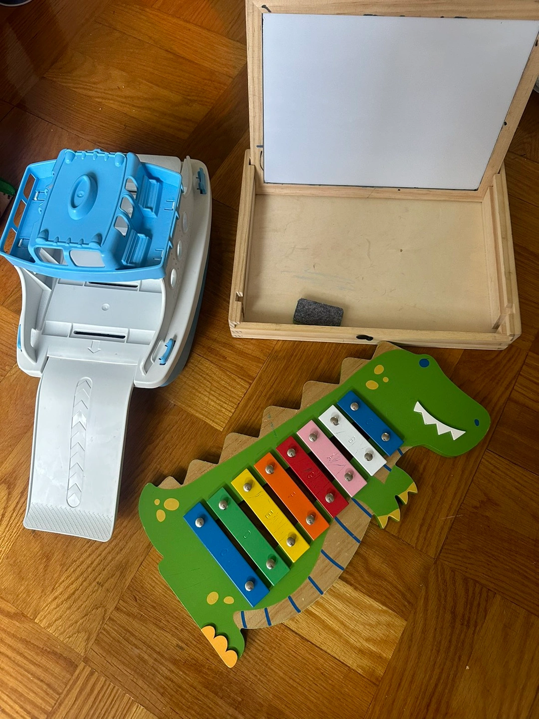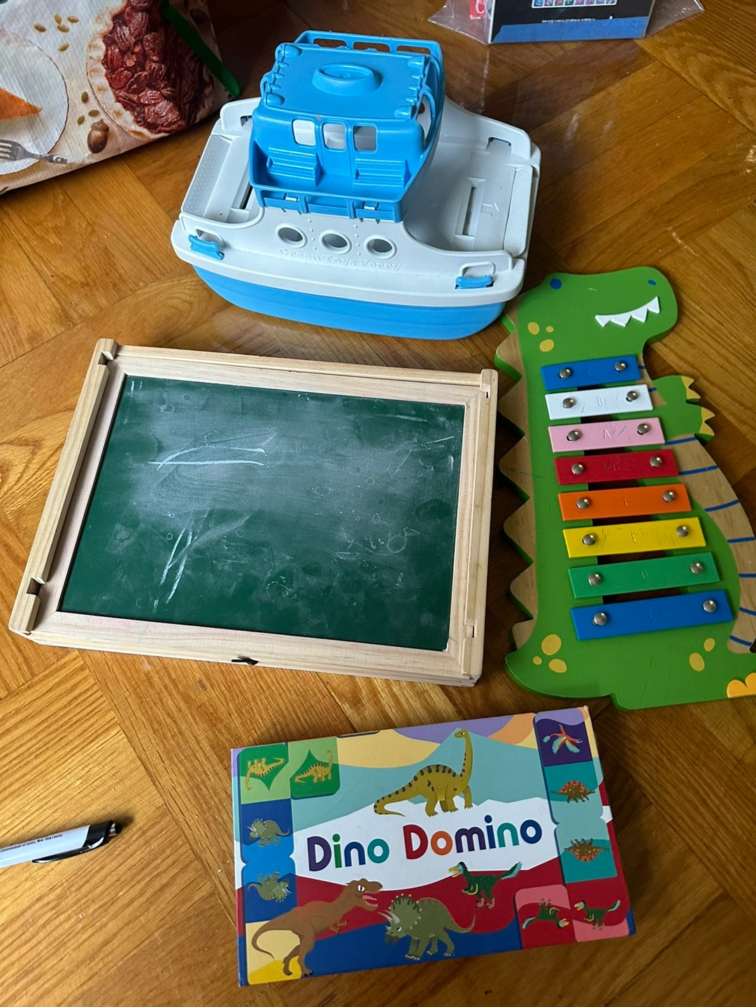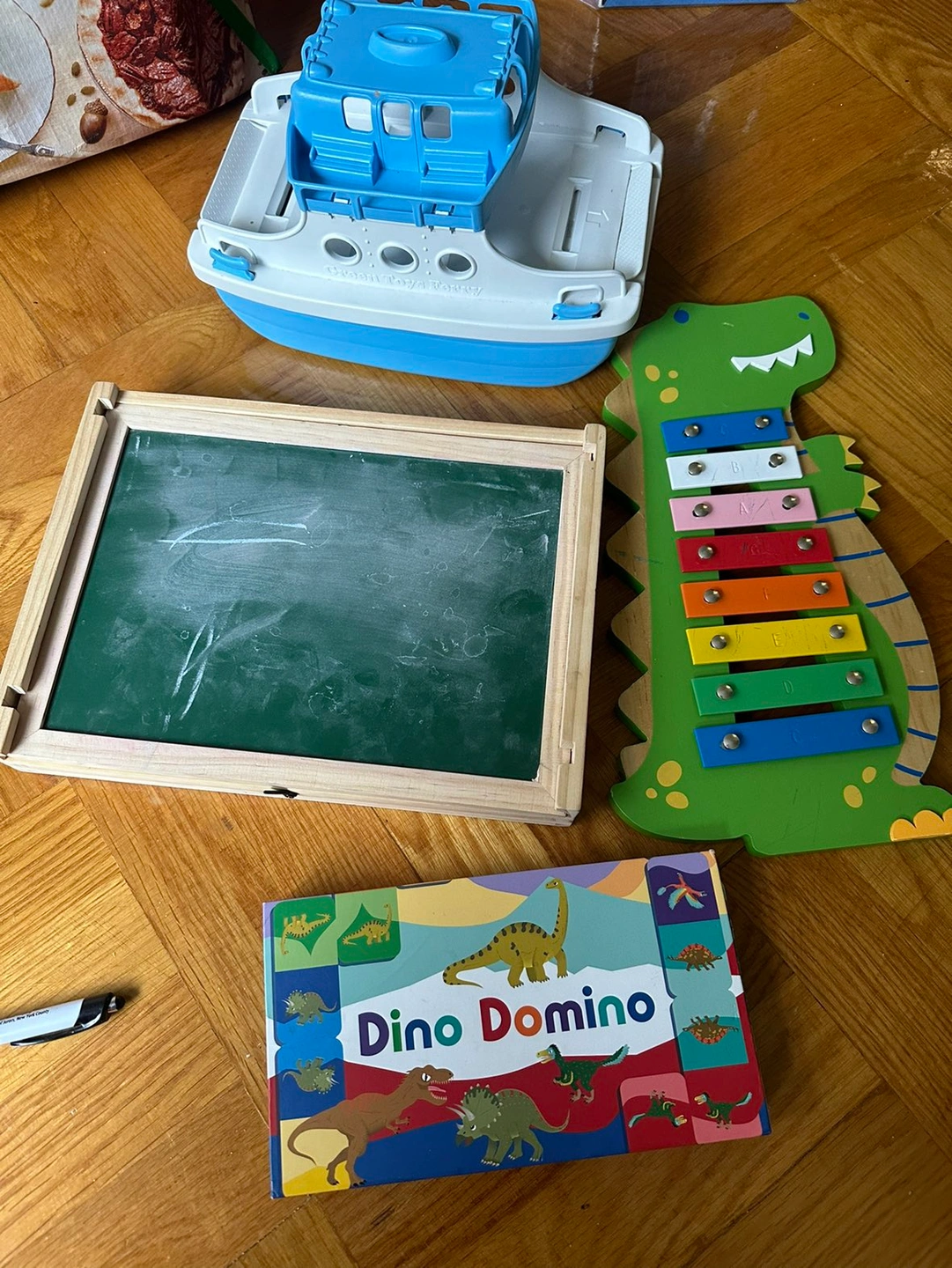 A dinosaur xylophone (no mallet); Green Toys ferry; Chuckle & Roar on the go magnetic white board/chalk board (I don’t have the chalk or magnets anymore).; Dino dominos! All free to pick up on 45th between 8 and 9. Take one, or take them all!