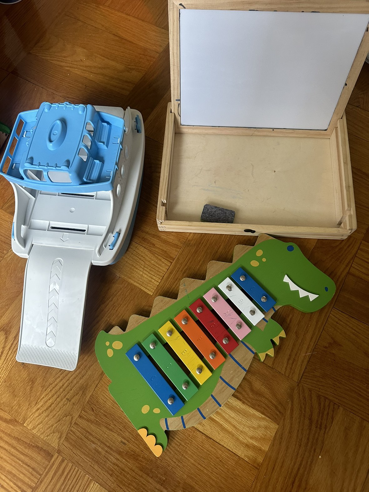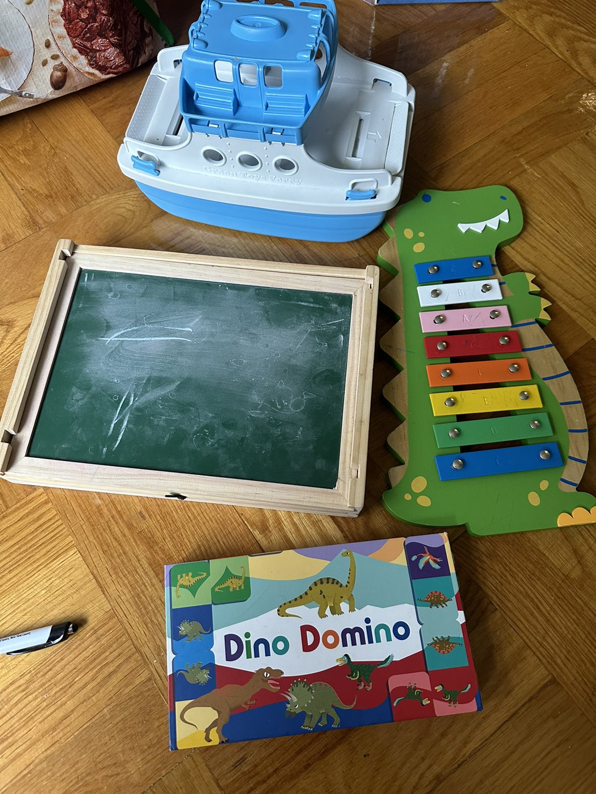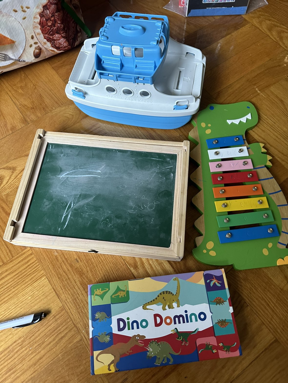 A dinosaur xylophone (no mallet); Green Toys ferry; Chuckle & Roar on the go magnetic white board/chalk board (I don’t have the chalk or magnets anymore).; Dino dominos! All free to pick up on 45th between 8 and 9. Take one, or take them all!