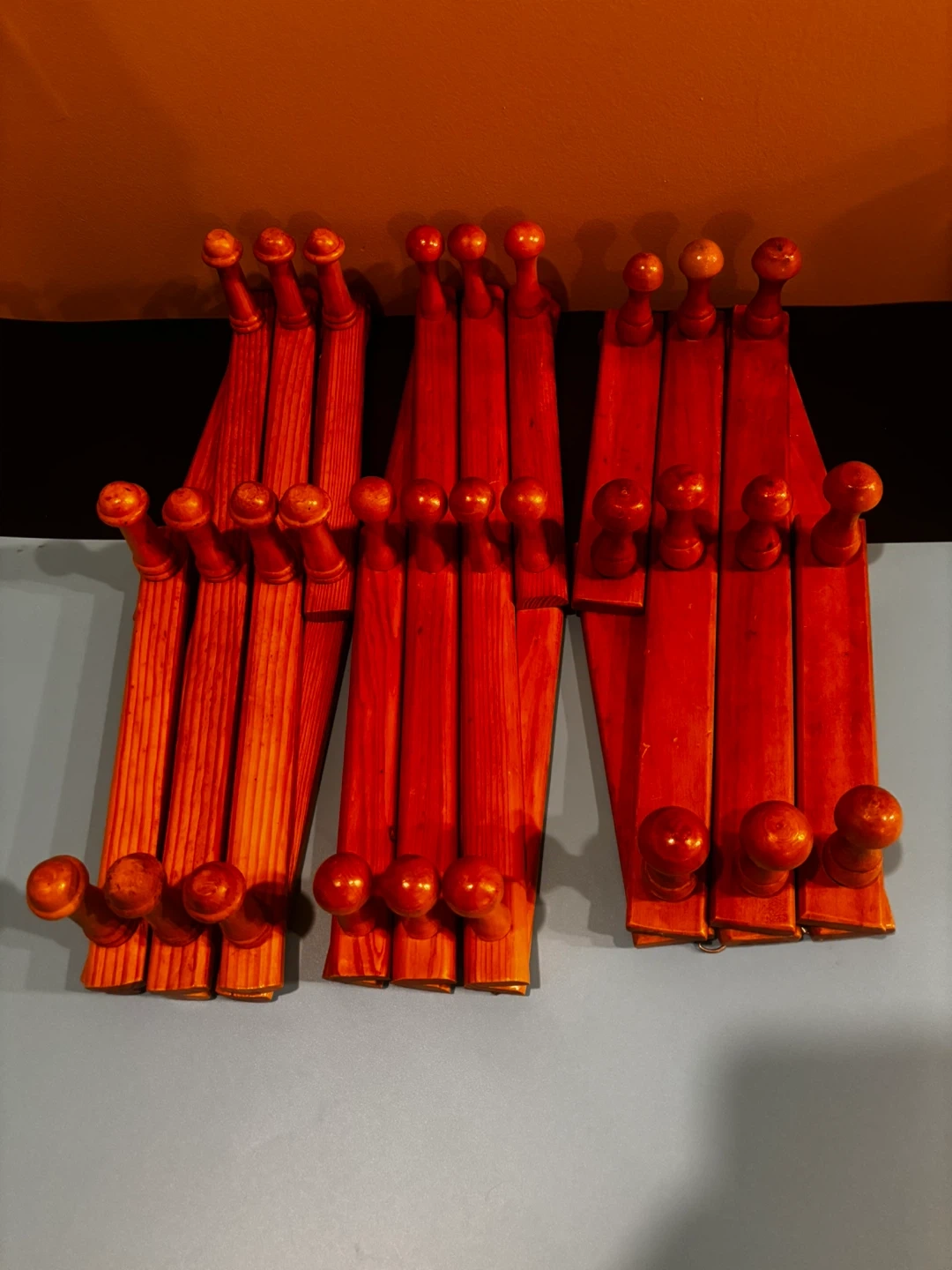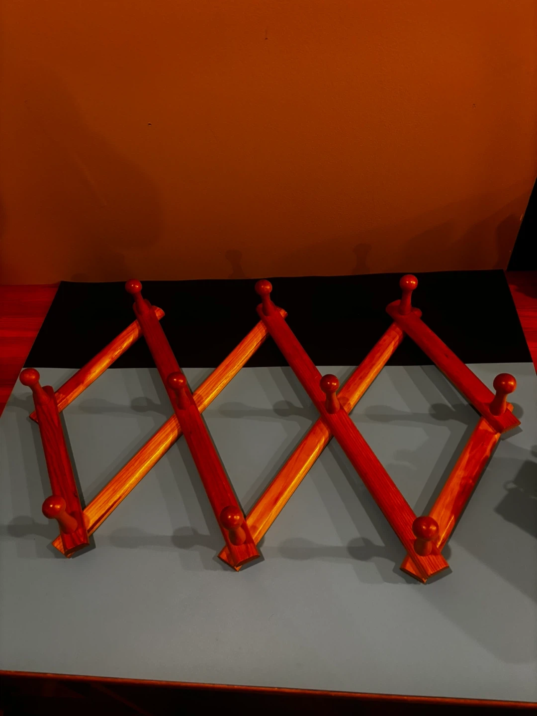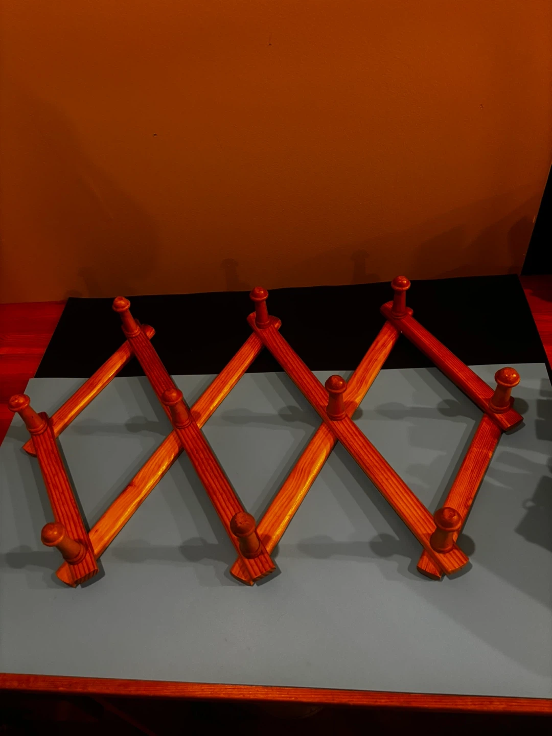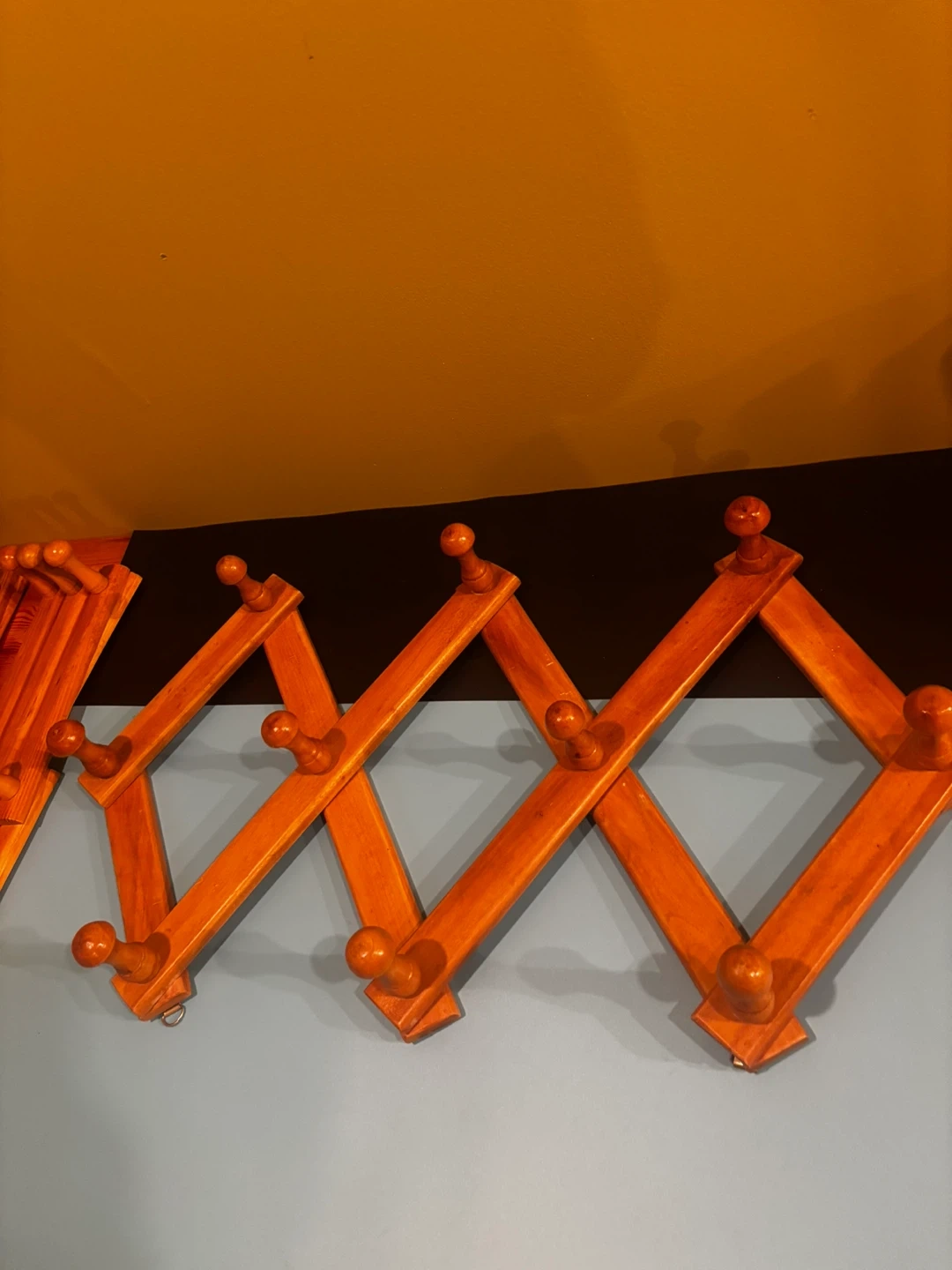 This is a wooden accordion-style wall hanger. It extends and retracts, offering multiple hooks for hanging items. Made of wood. $3 each