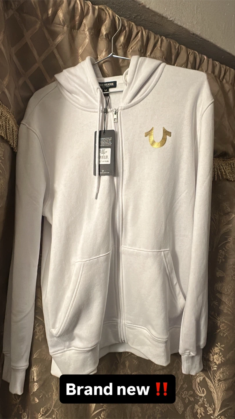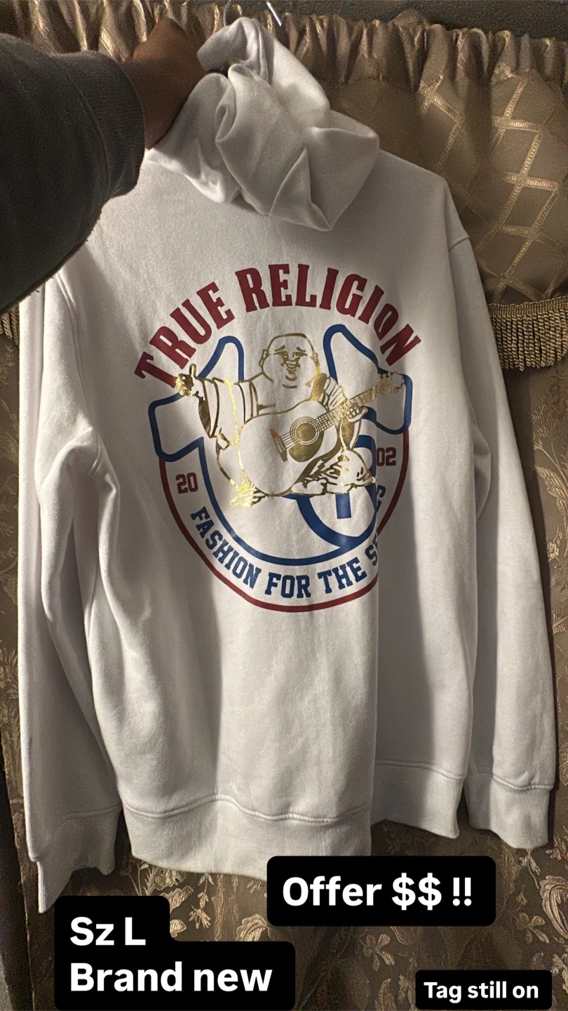 Selling a brand new True Religion hoodie in white! It's a size large and features the iconic True Religion logo on the front and a cool design on the back. The tags are still on, so it's ready for a new owner