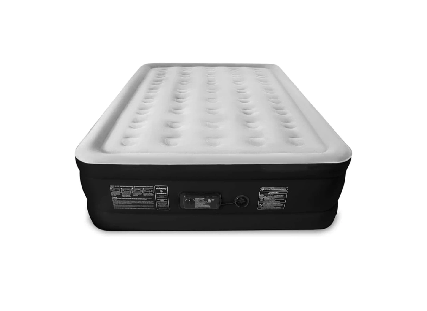 This air mattress features a durable plush flocked top that's extra thick and waterproof for luxurious comfort. It has a puncture-resistant multilayer 15 gauge material for increased durability. The raised border on the sides adds extra comfort and support. It also has a built-in pump for 1-click high capacity inflation, integrated cord storage, 40 comforcoils for added durability and support, and a suregrip bottom to prevent slipping