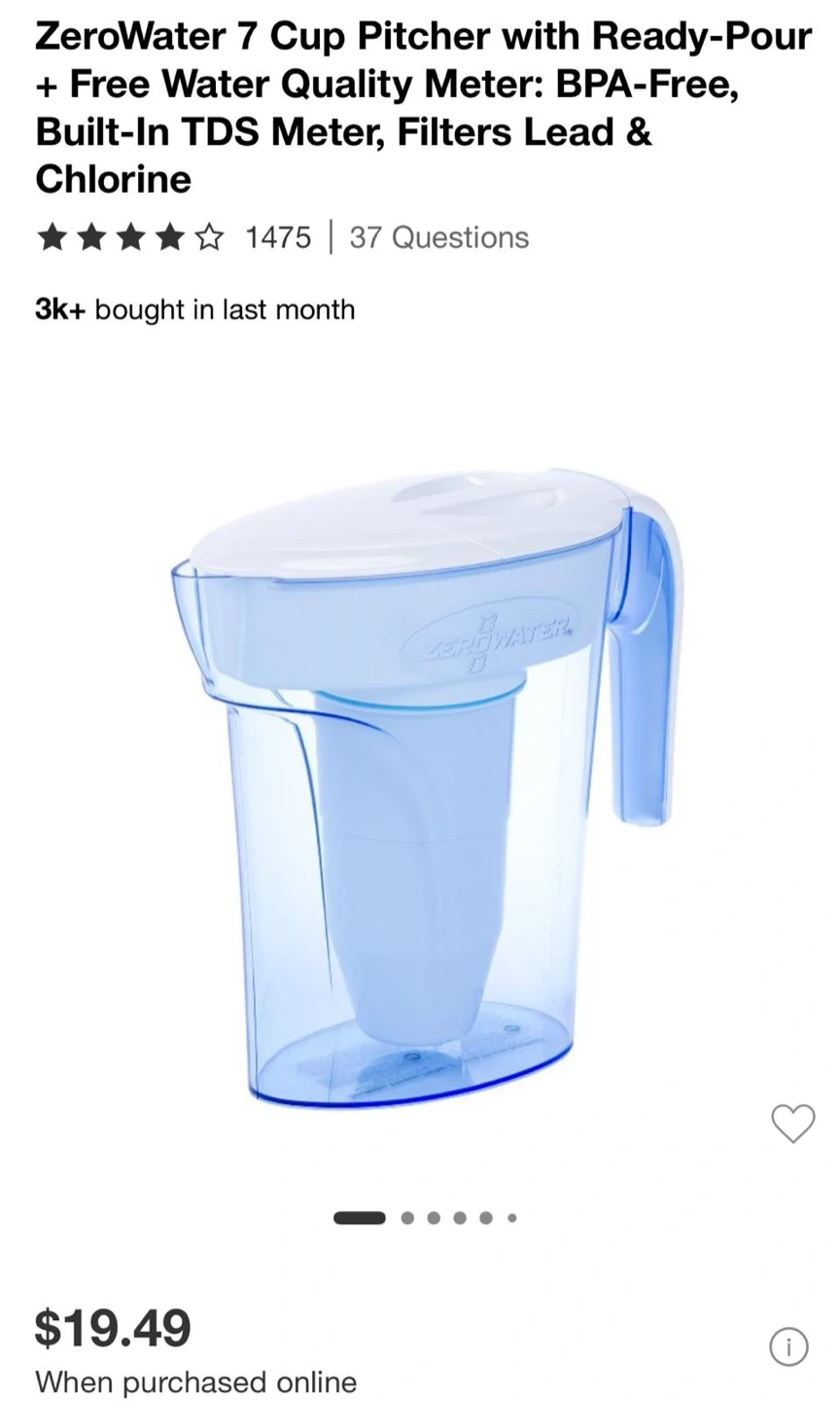 I'm selling a ZeroWater 7-cup pitcher! It comes with a built-in TDS meter and filters lead and chlorine. It's BPA-free and features a ready-pour design. Originally bought for $19.49