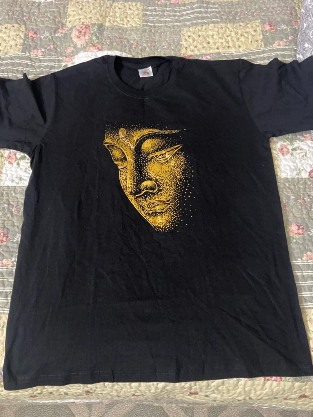 10NOT USED its brand new just there is no Tag MADE IN NEPAL Selling a black t-shirt with a gold-colored Buddha graphic on the front. It's in good condition and has a classic fit. Perfect for casual wear!
