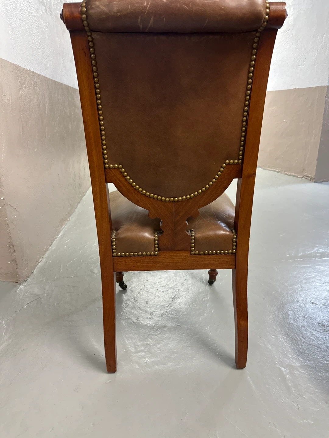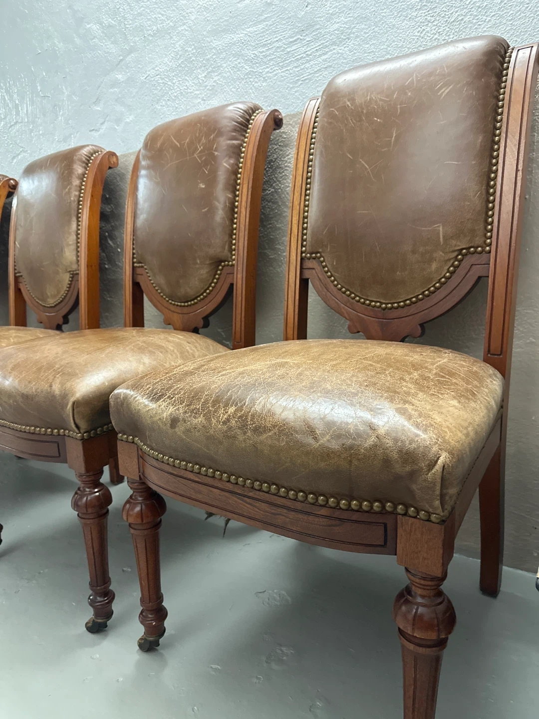 These are some beautiful antique dining chairs with brown leather seats and backs! They have a classic, elegant design with wooden frames and decorative nailhead trim. They show some signs of wear, which adds to their vintage charm