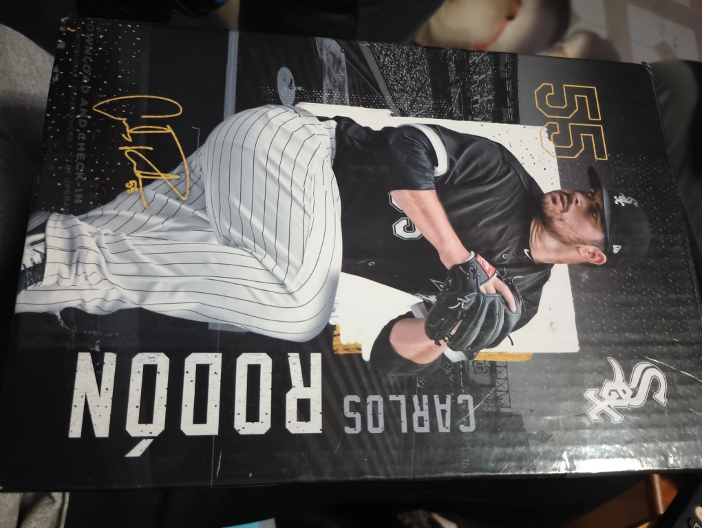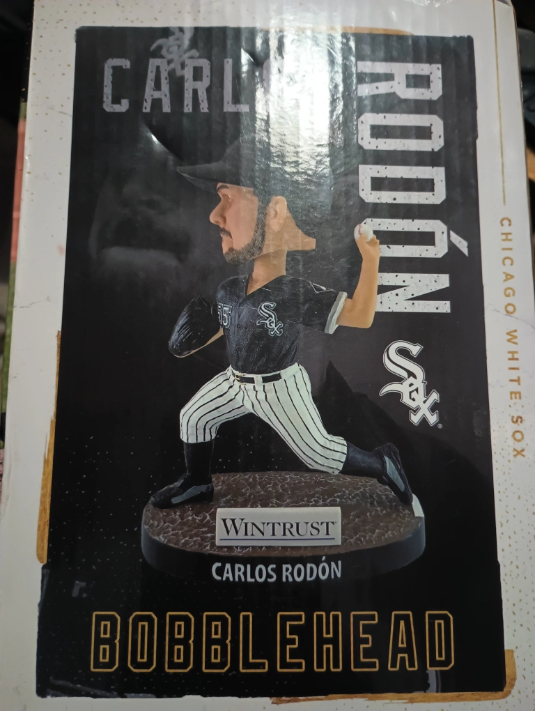 Selling a Carlos Rodón bobblehead figure in its original box. It's a Chicago White Sox collectible featuring Rodón in his uniform. Perfect for any baseball fan!