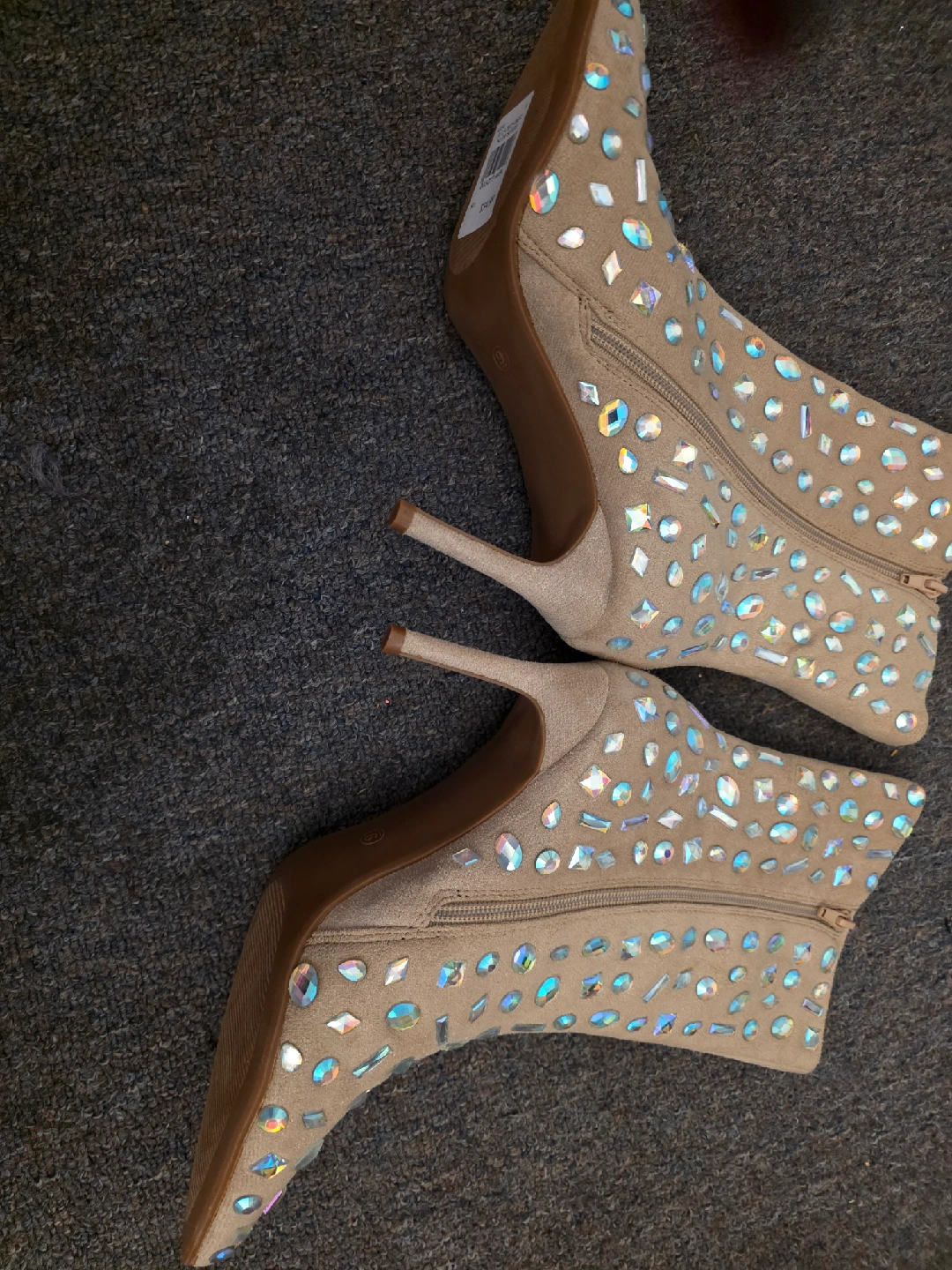 These stylish ankle boots are embellished with iridescent rhinestones that catch the light beautifully! They feature a pointed toe and a slim heel, perfect for adding a touch of glamour to any outfit