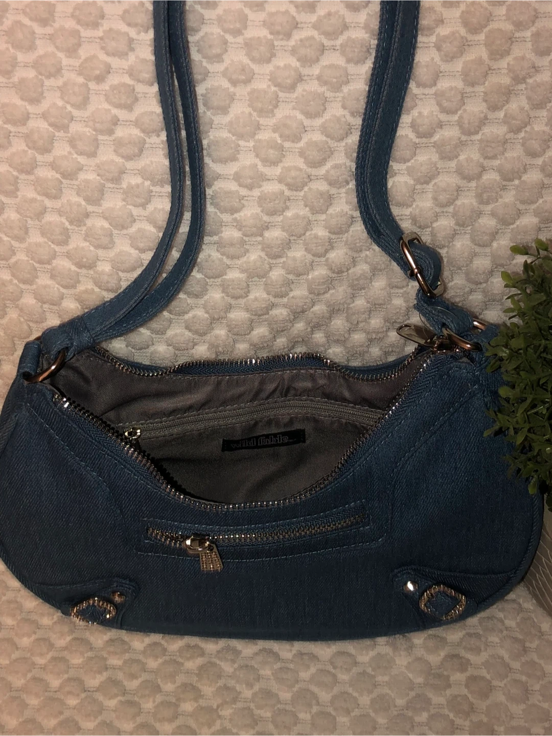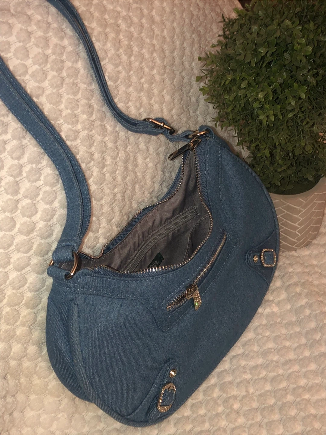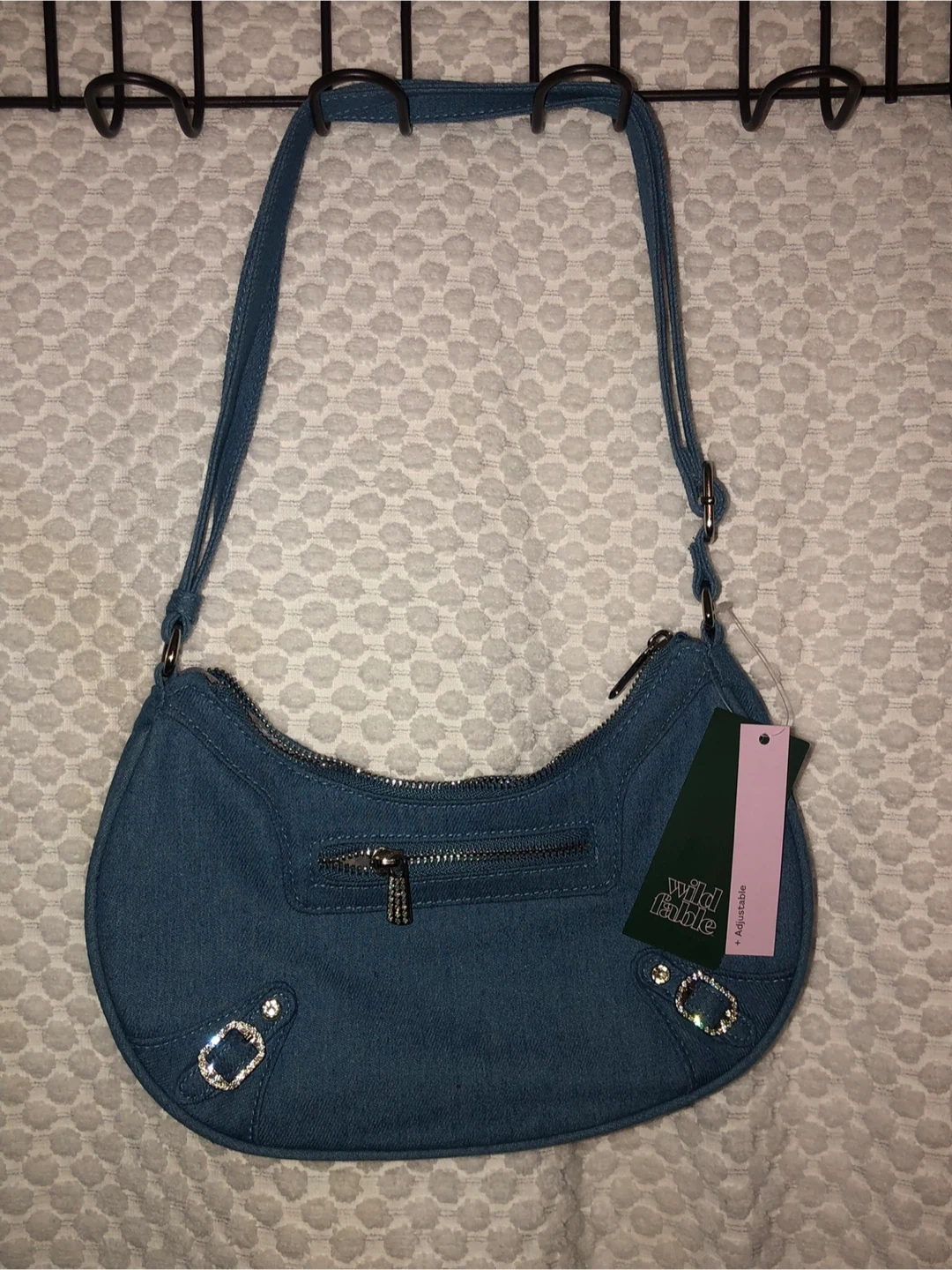 26This is a new with tags denim shoulder bag from Wild Fable! It's a stylish and cute bag that's perfect for everyday use. The bag features a zipper closure and an adjustable strap.