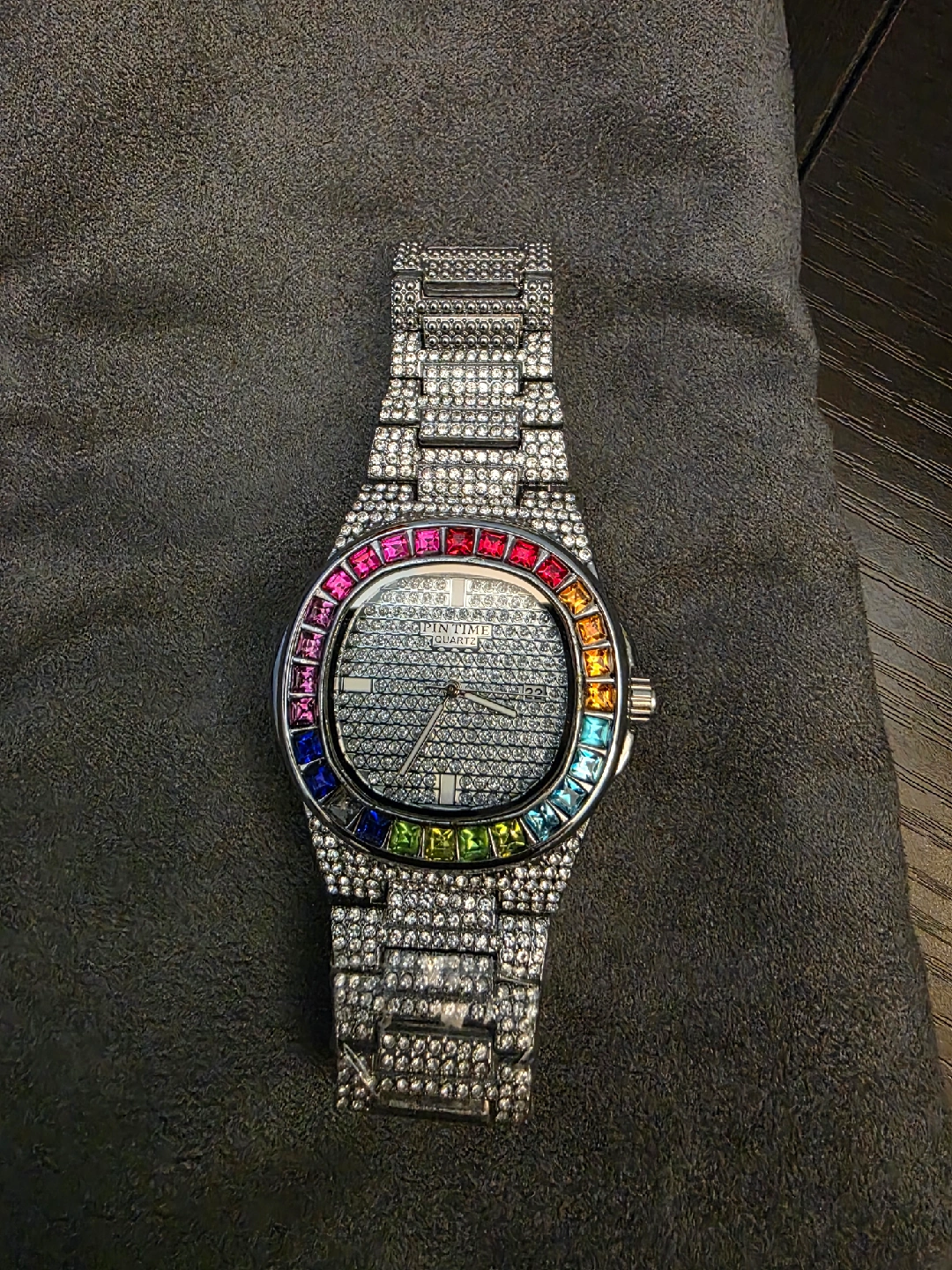 Selling a Spin Time Quartz watch, fully iced out with diamonds! The bezel features a rainbow of colors. This watch is sure to turn heads! Needs battery