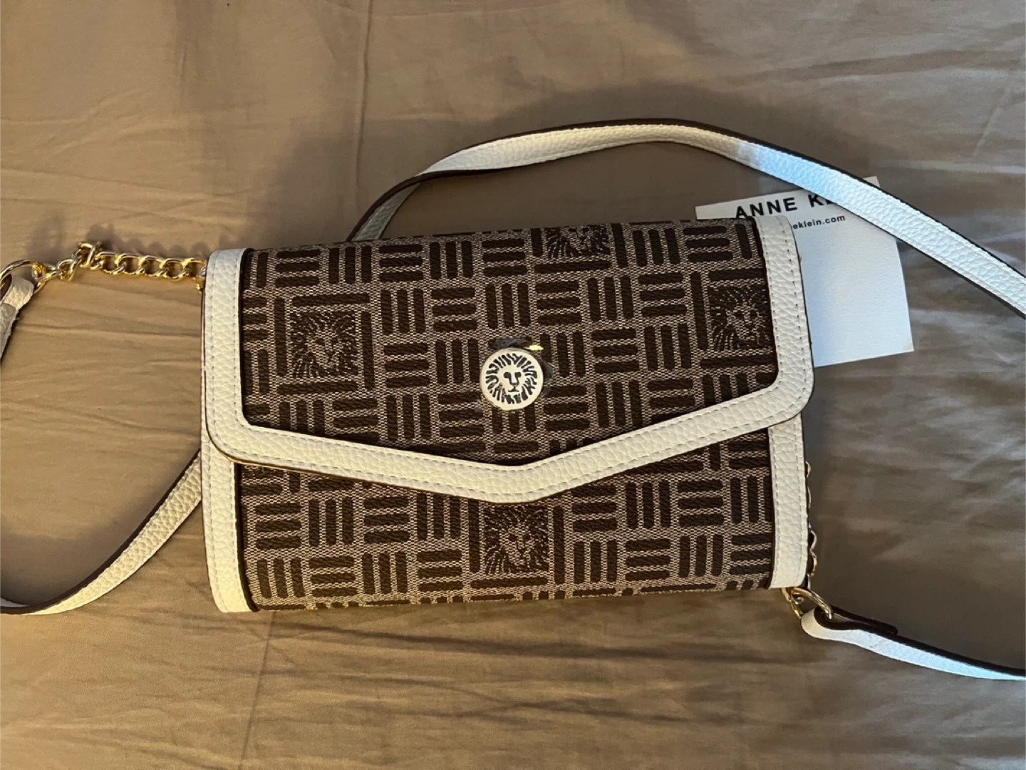 15This Anne Klein crossbody bag is in great condition. It features a stylish pattern with white trim and a gold-tone chain detail. Perfect for carrying your essentials!