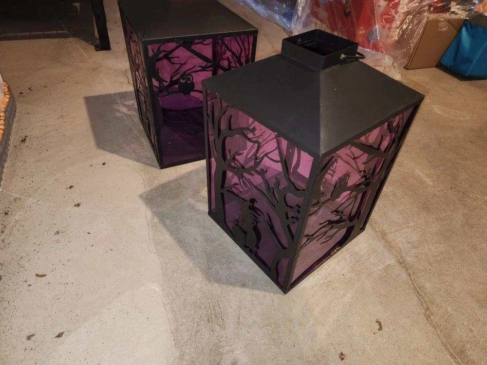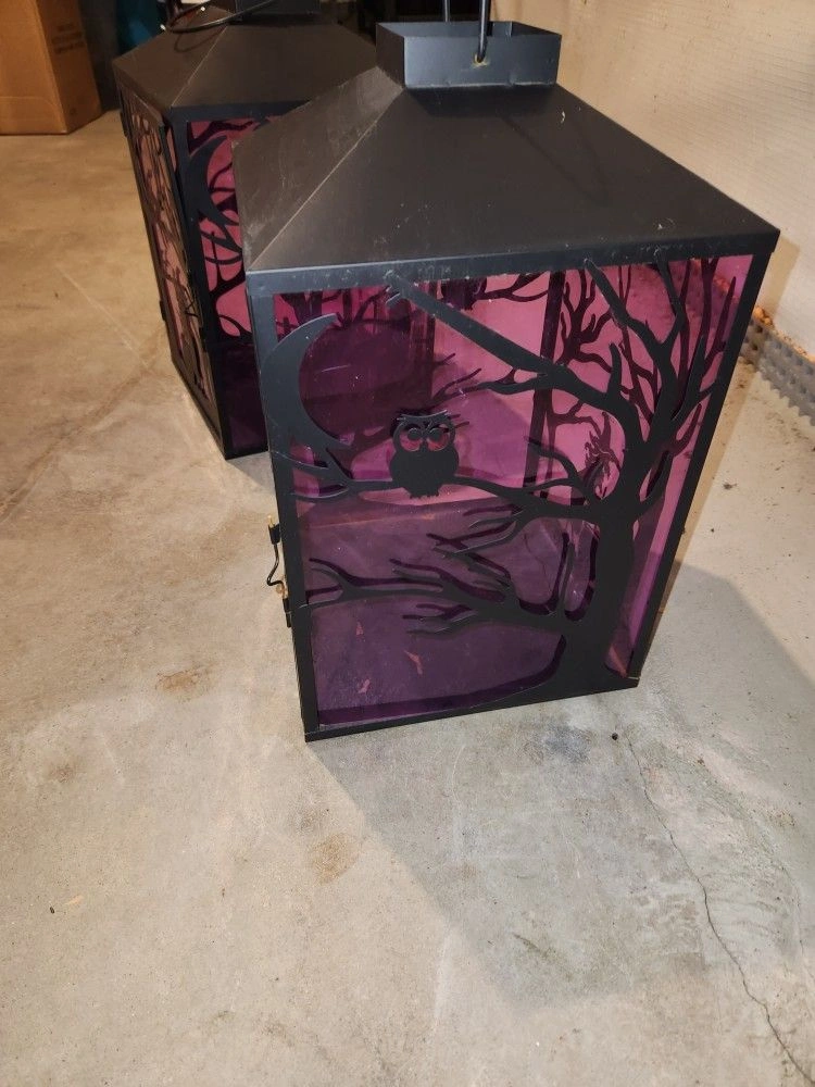 Two black metal lanterns with purple plastic accent. I usually put LED candles inside at Halloween time. Great condition. Indoor/outdoor use. Have a hinged door for access. 10"x10"x17" tall Occasion: Halloween Color: Black Type: Candles & Holders