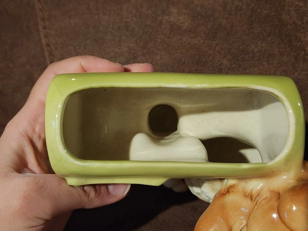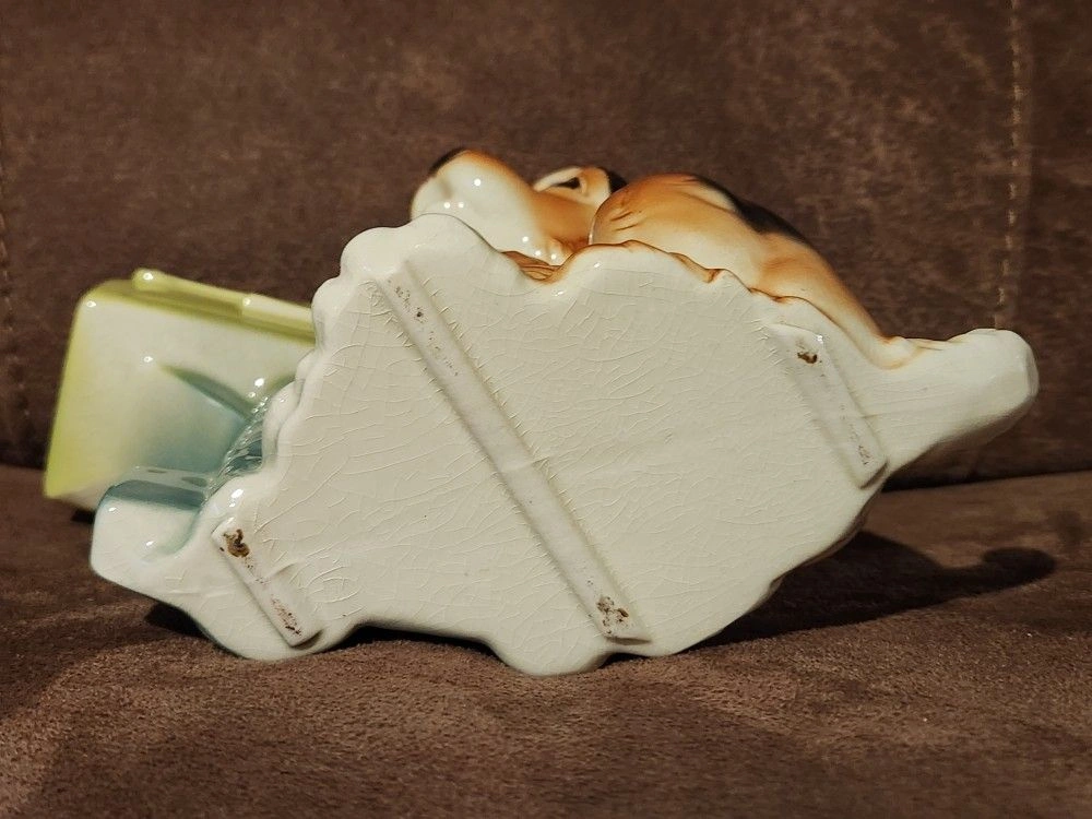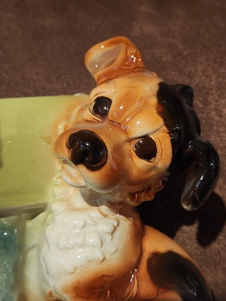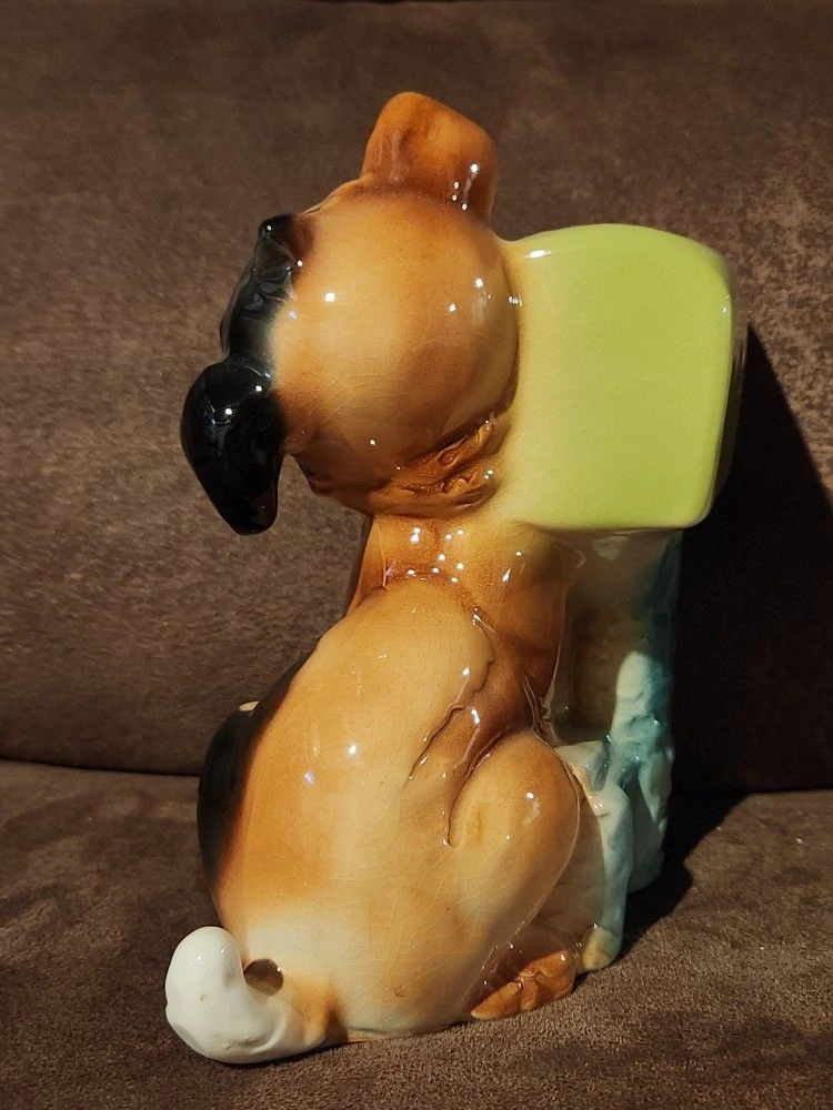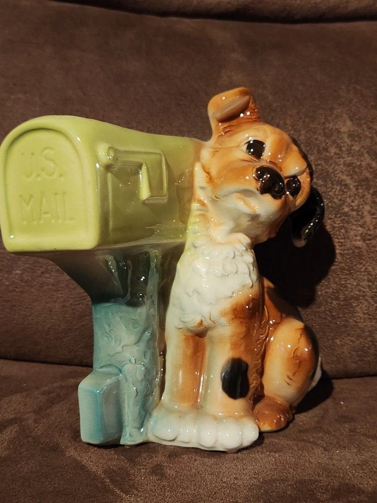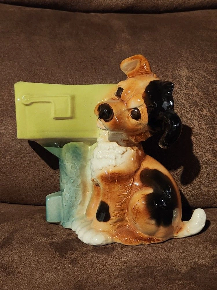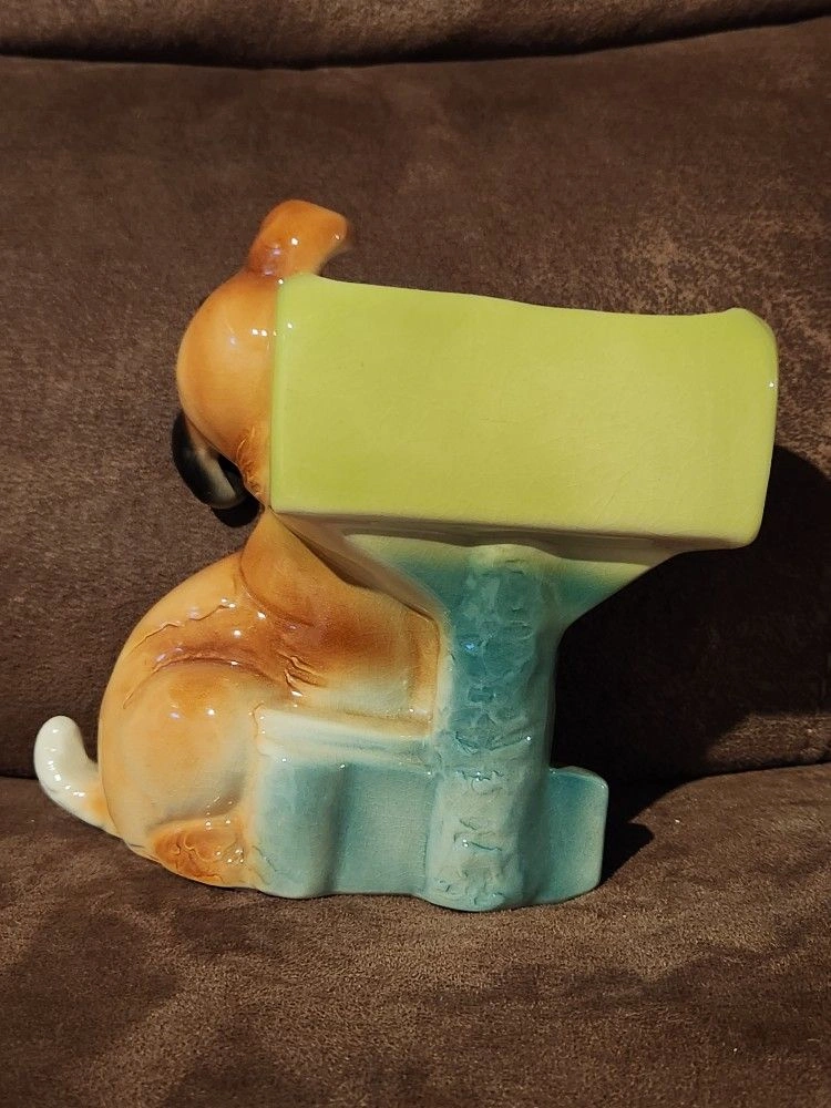 Vintage Royal Copley Puppy Mailbox Ceramic Planter 50's Dog Figurine Dog Planter 8" tall. Some age related crazing throughout. No chips or cracks. Type: Animal