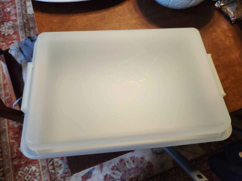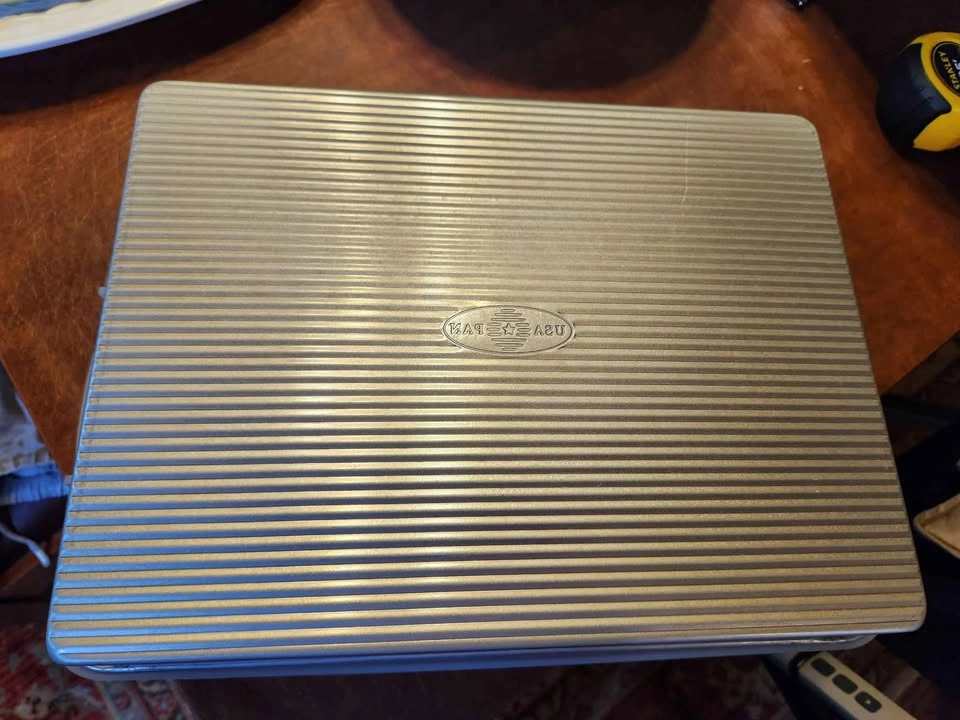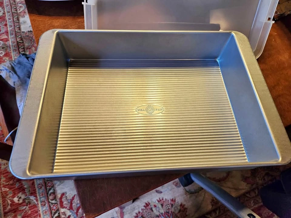 Dimensions: 13.75 x 10.375 x 3 inches Outer Dimensions: 16 x 10.875 x 3 inches Material: Aluminized Steel Comes with plastic lid. Not sure we ever used it.