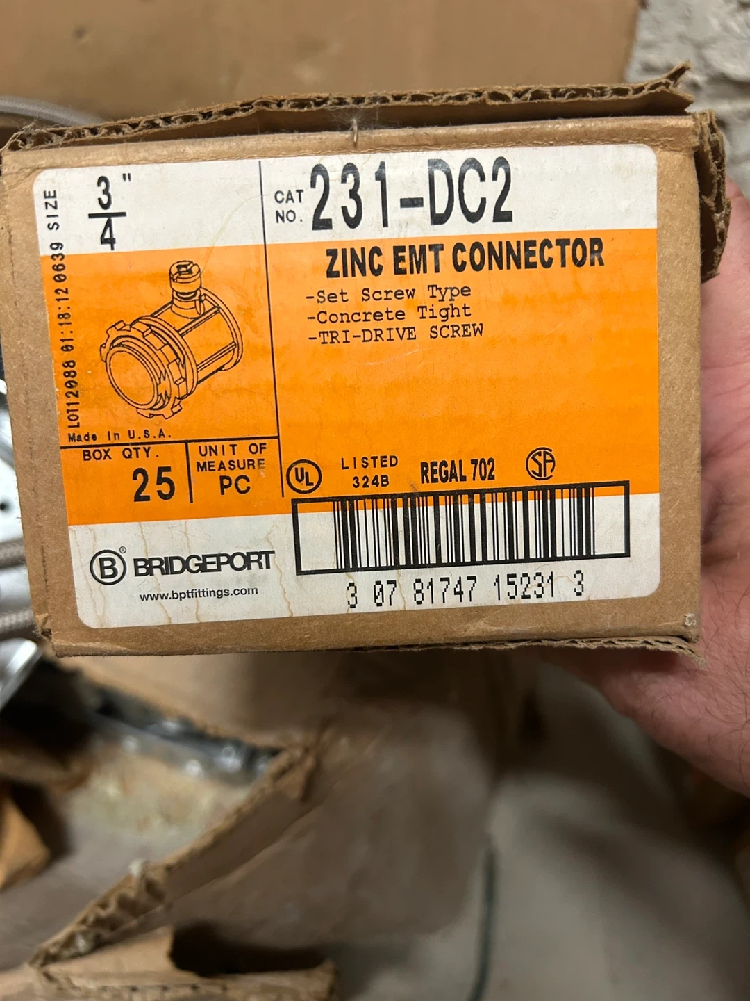 161New Bridgeport 3/4" Zinc EMT Connectors. 40 pieces total. They are set screw type, concrete tight, and use a tri-drive screw. $10 cash for the lot.