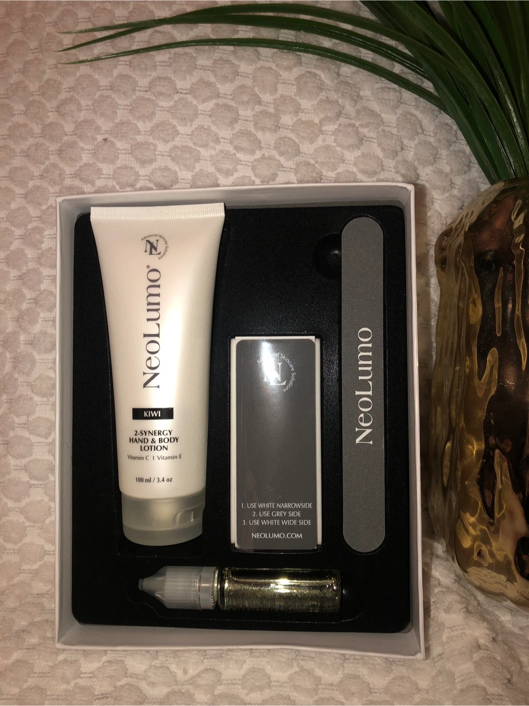 15Selling a NeoLumo Natural Glow Nail Kit in Kiwi! The kit includes: - 2-Synergy Hand & Body Lotion (100 ml / 3.4 oz) with Vitamin C & Vitamin E - Nail file - Other components as pictured It comes in its original box