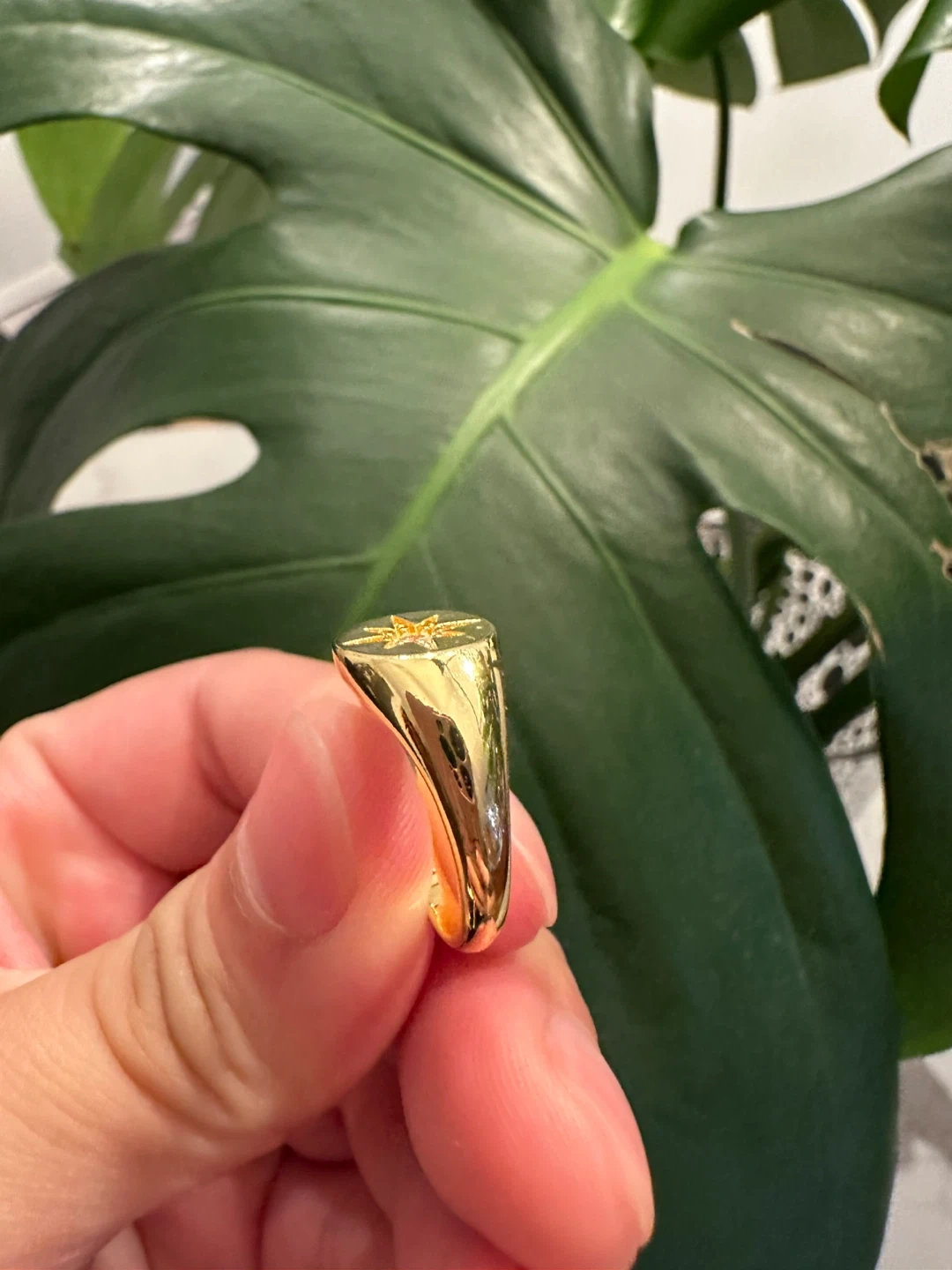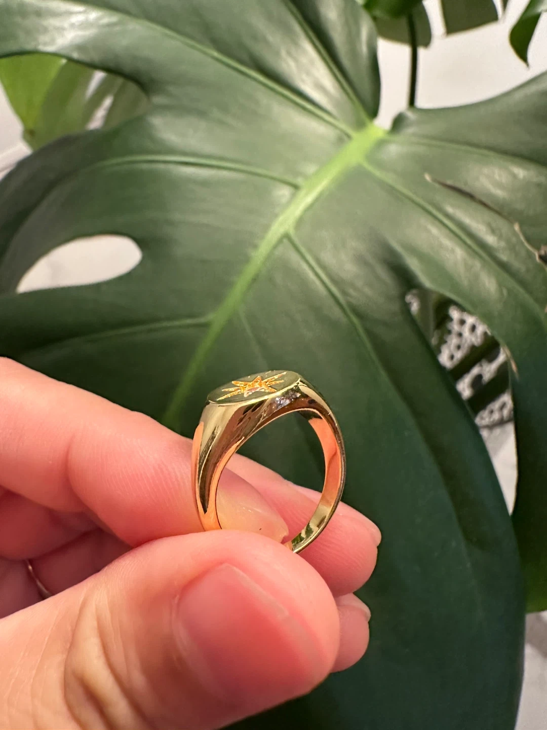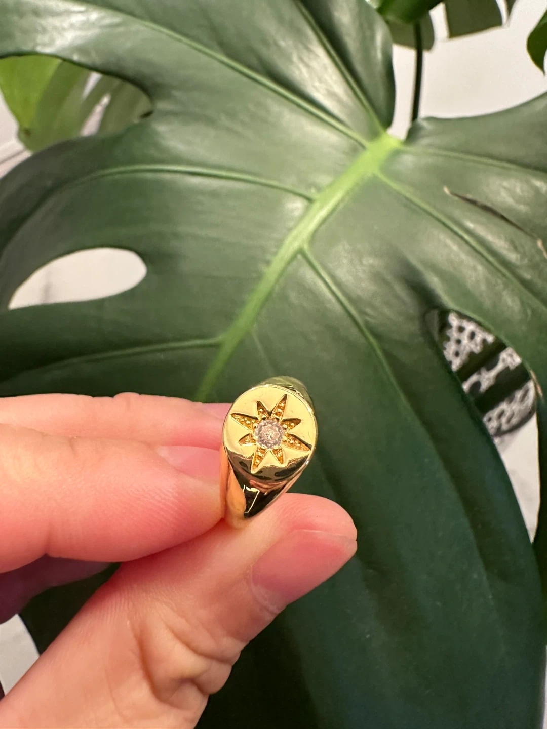 Selling a beautiful gold signet ring with a starburst design. It's in great condition and ready for a new home! The ring features a unique starburst on its face, adding a touch of elegance to any outfit,size 6