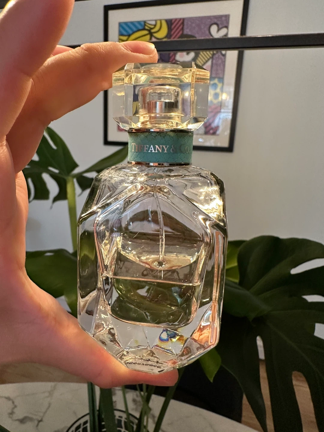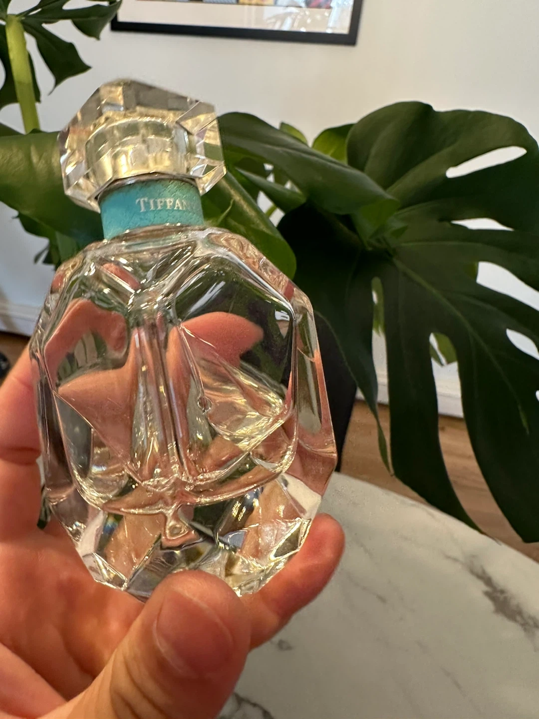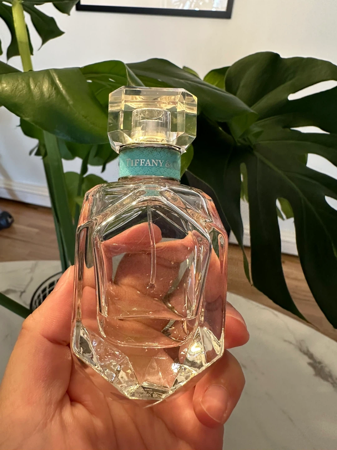 Selling a bottle of Tiffany & Co. Eau de Parfum. The bottle is clear glass with a beautiful, faceted design. The cap is clear and the neck of the bottle has a light blue accent. Great for everyday wear or a special occasion! Around 50 percent remaining.