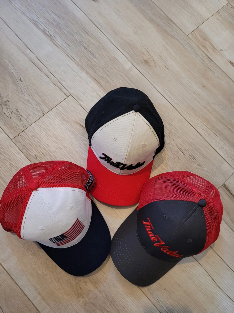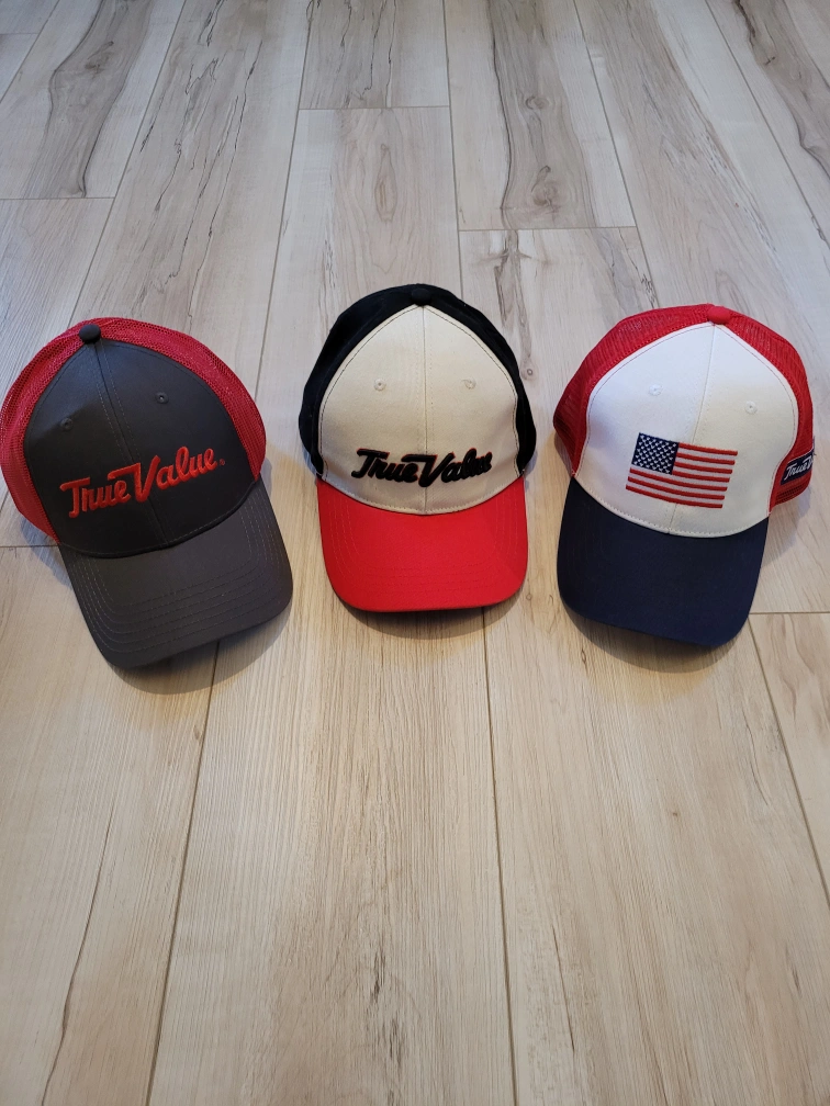 I have three True Value baseball caps for sale all for price together. They are in great condition and have the True Value logo embroidered on the front. One has the American flag on the front. Perfect for any True Value fan! Two are snap backs and one is velcro on the back.