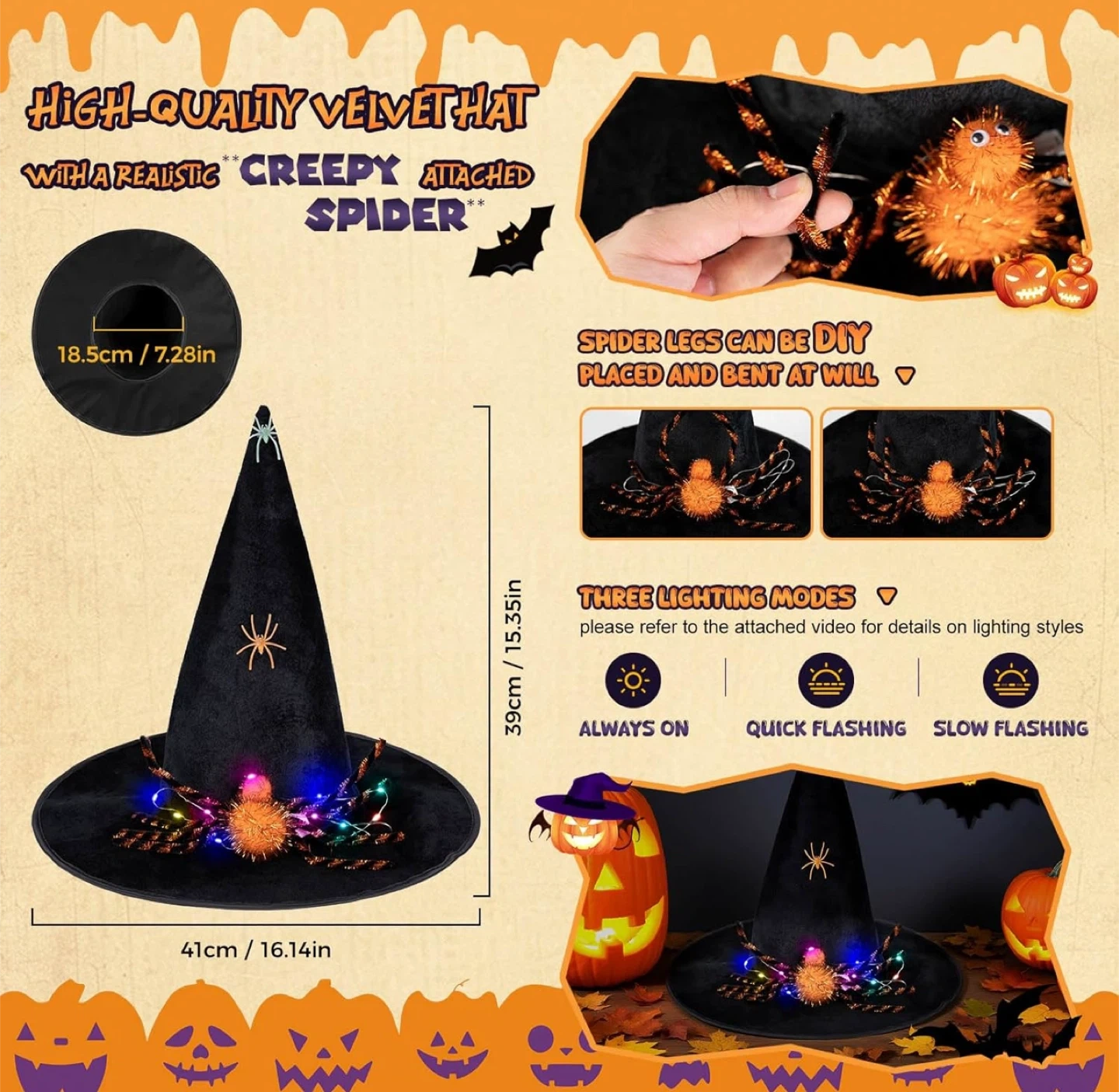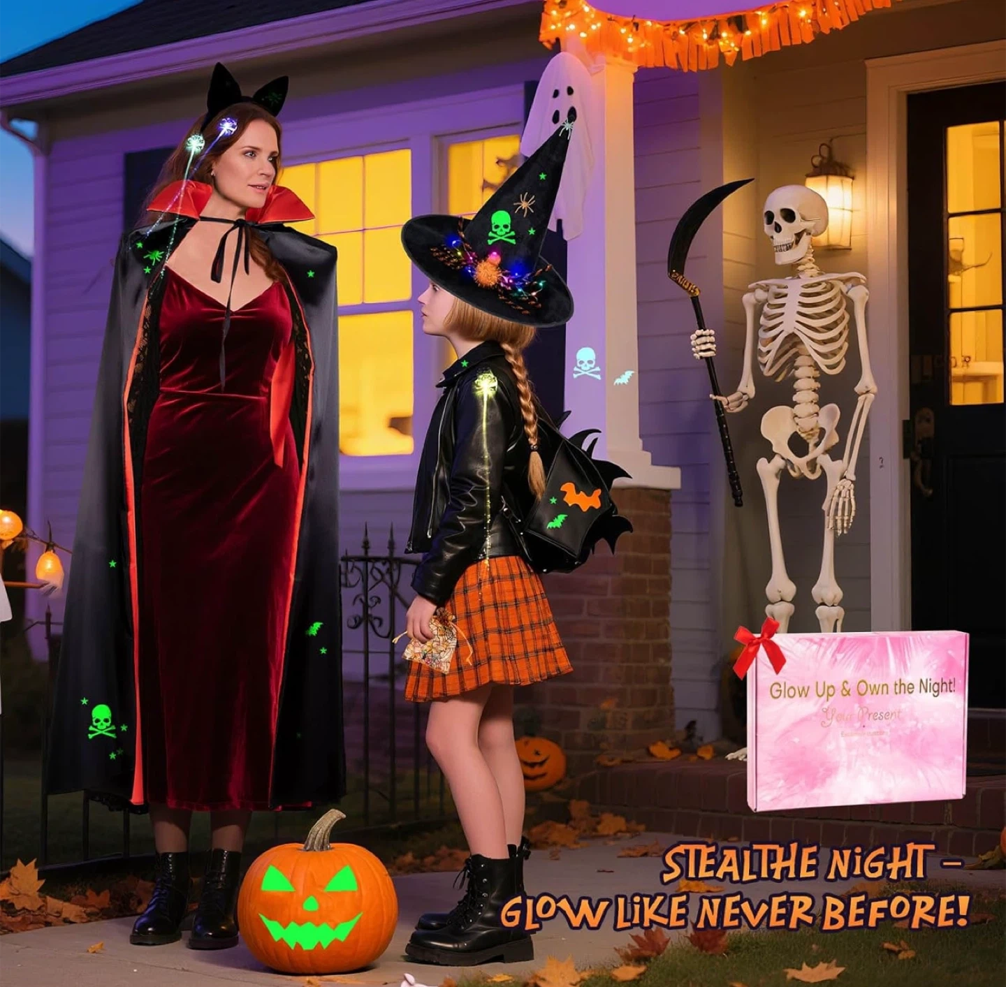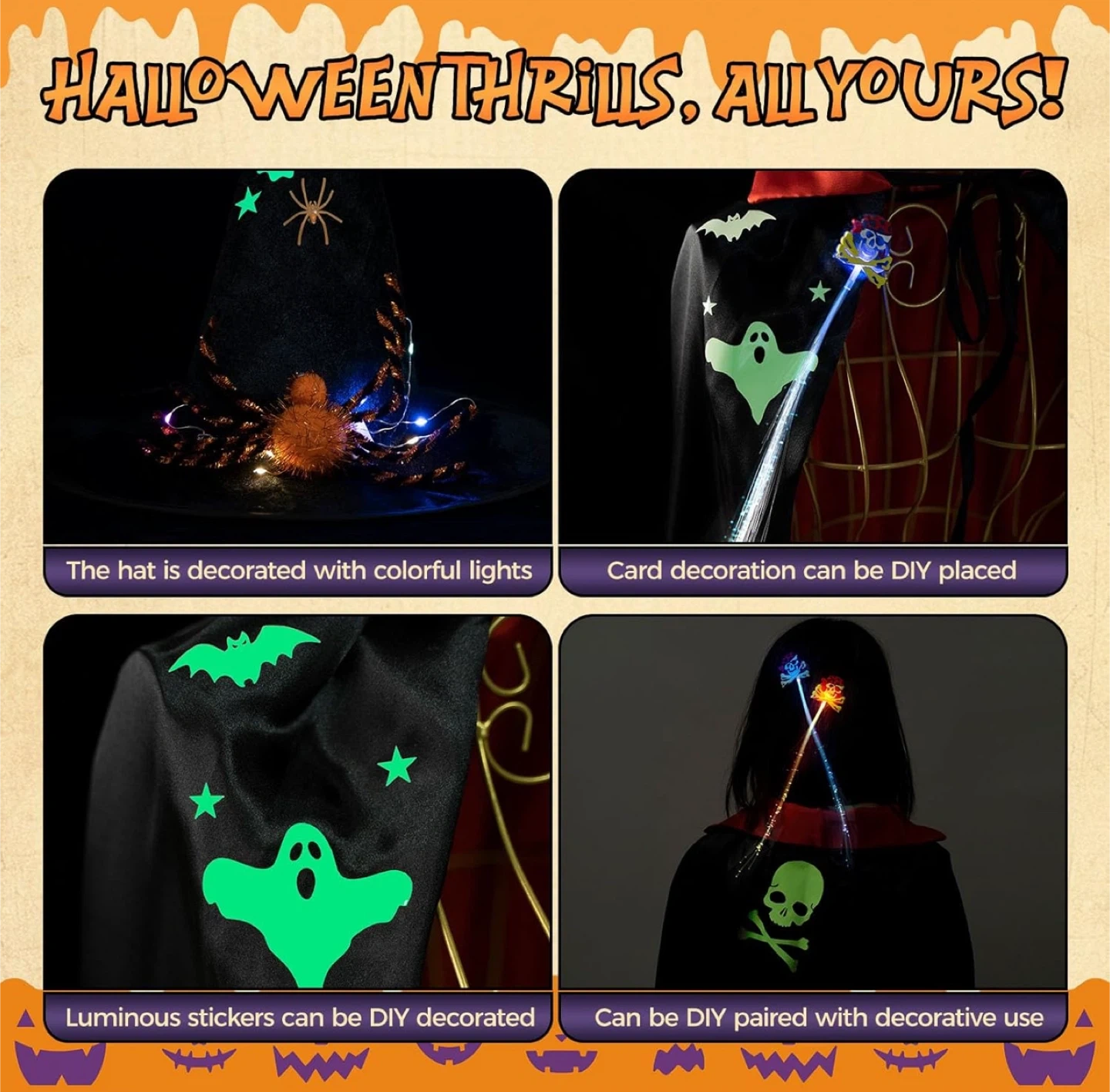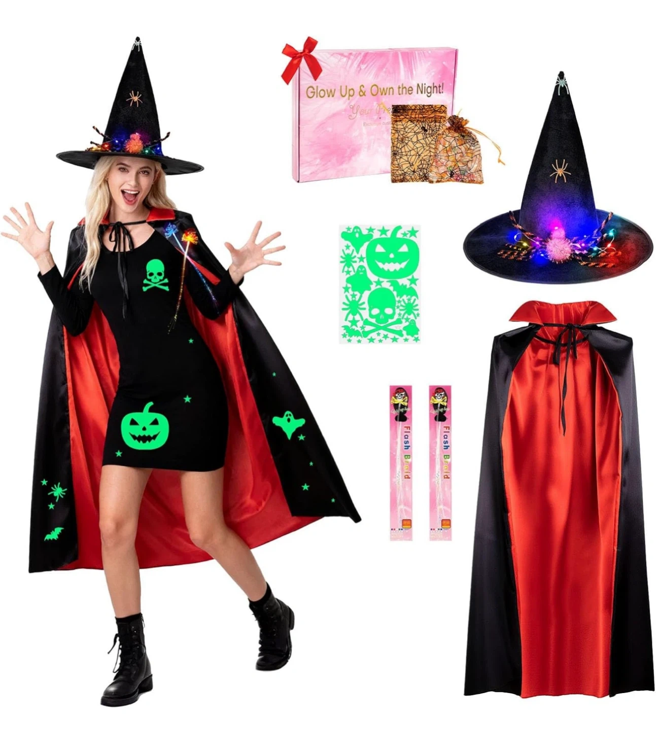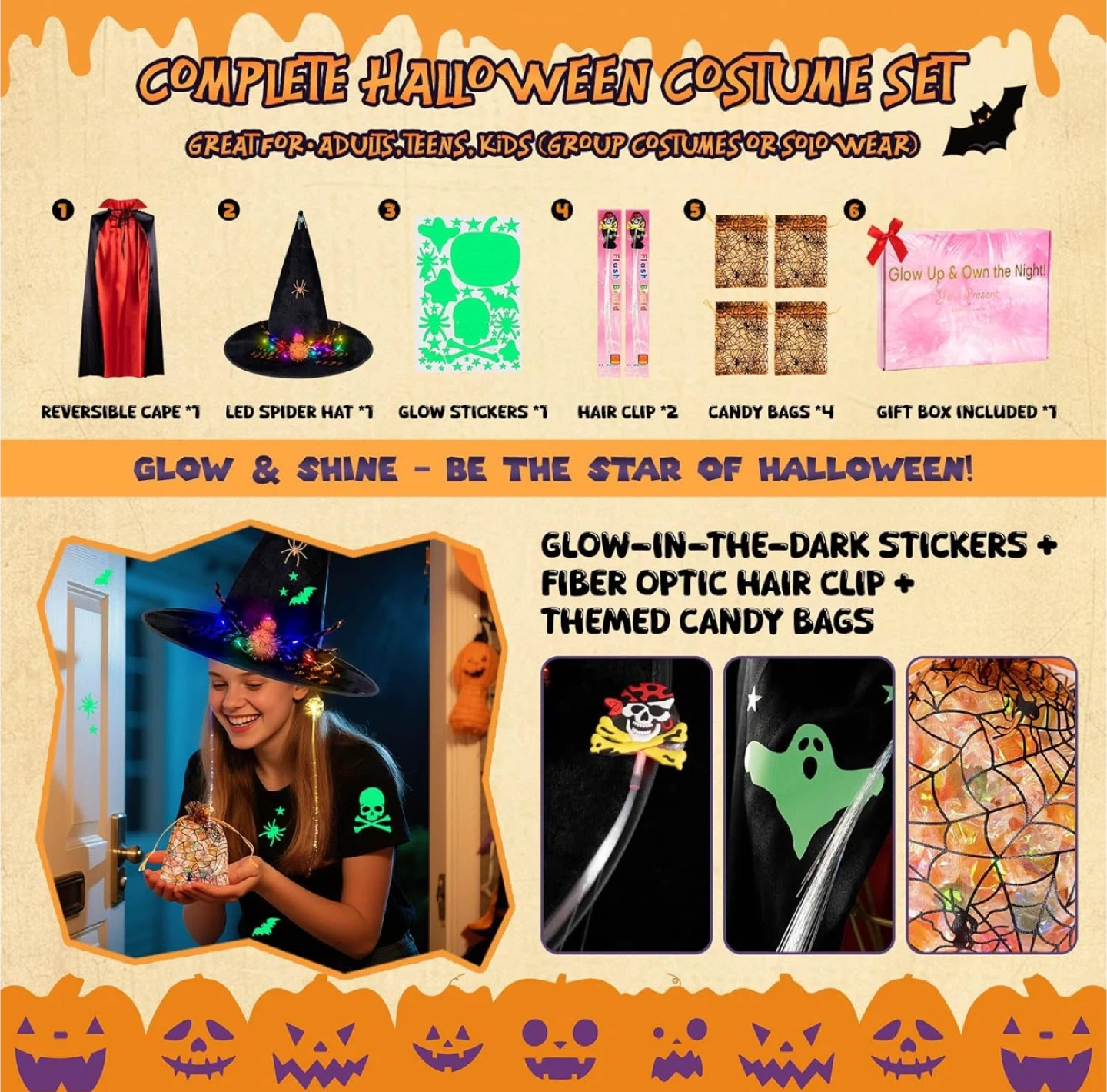 Light-Up Halloween Bundle costumes,Glow Spider Witch hats & Cape, Night Glow Decals, LED Hair Clips, Halloween Candy Bag & Gift Box for Spook Night Witch