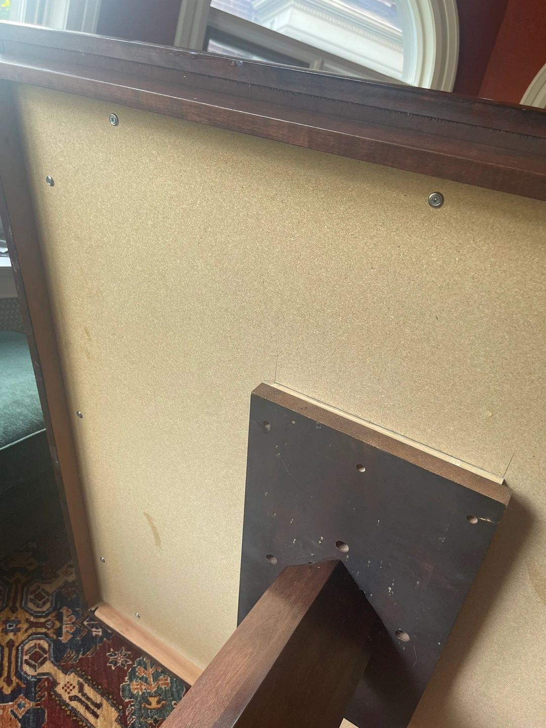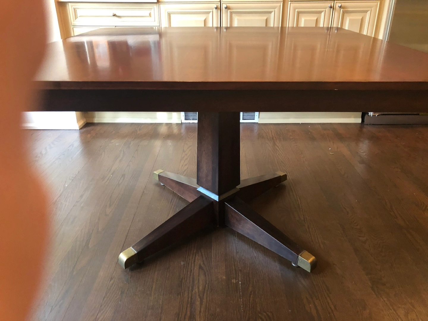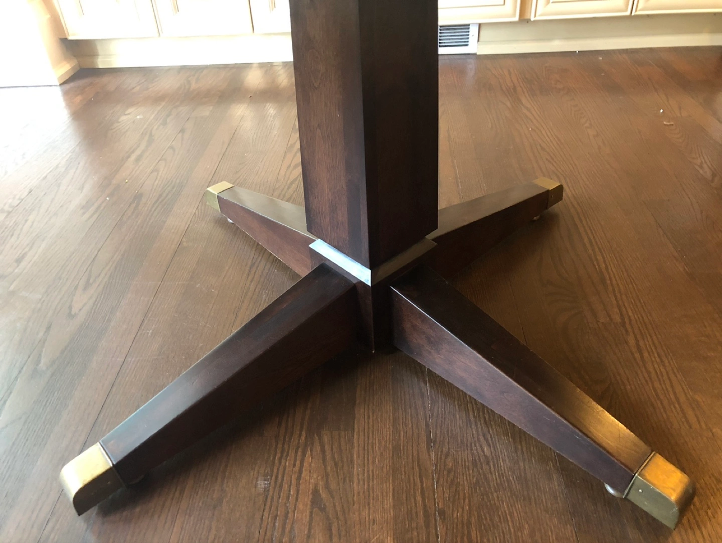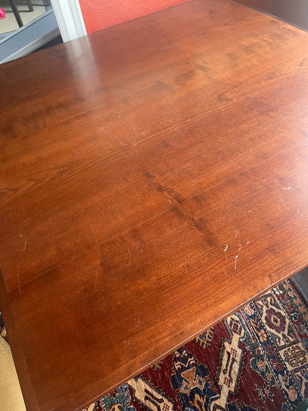 Custom dining table. 4 feet x 4 feet. Table has scratches - see photo. Table is very sturdy and heavy. Will survive children! I have disassembled for transport. Three pieces - two top pieces and base. See photos. Easy to reassemble with a screwdriver. Will likely need a van to transport.
