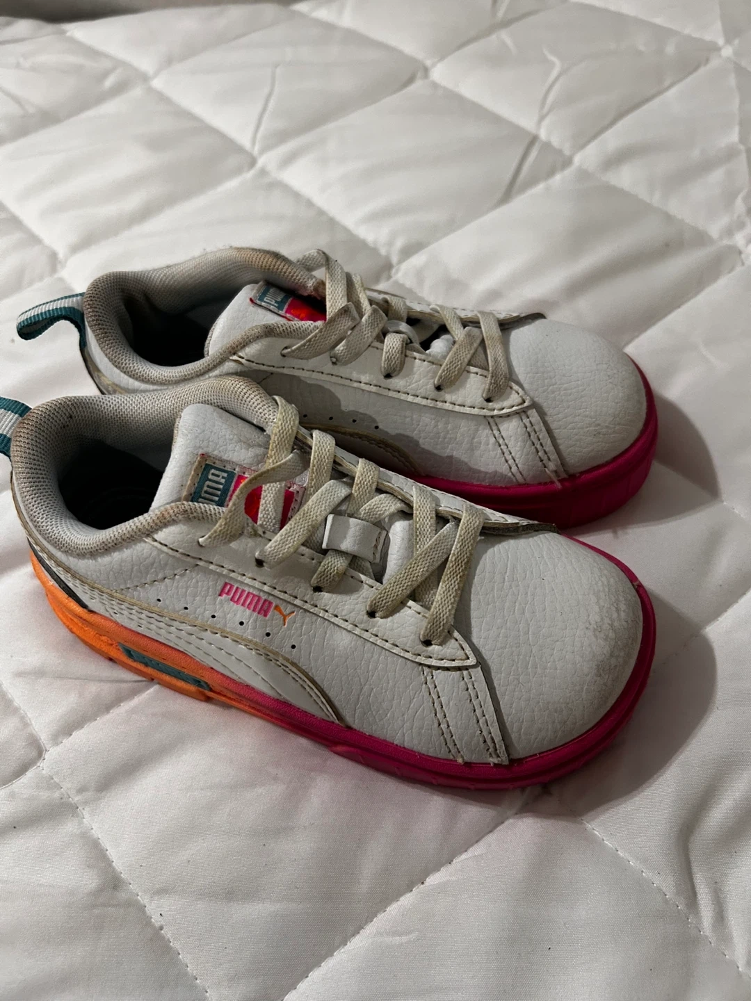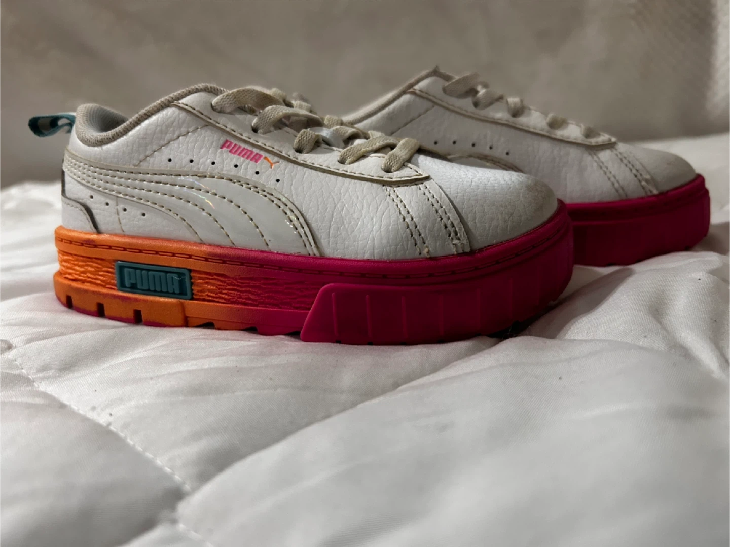 Selling a pair of Puma Smash Platform V2 shoes in size 10C. They feature a white leather upper with pink and orange accents. These are in good condition and ready for a new home!